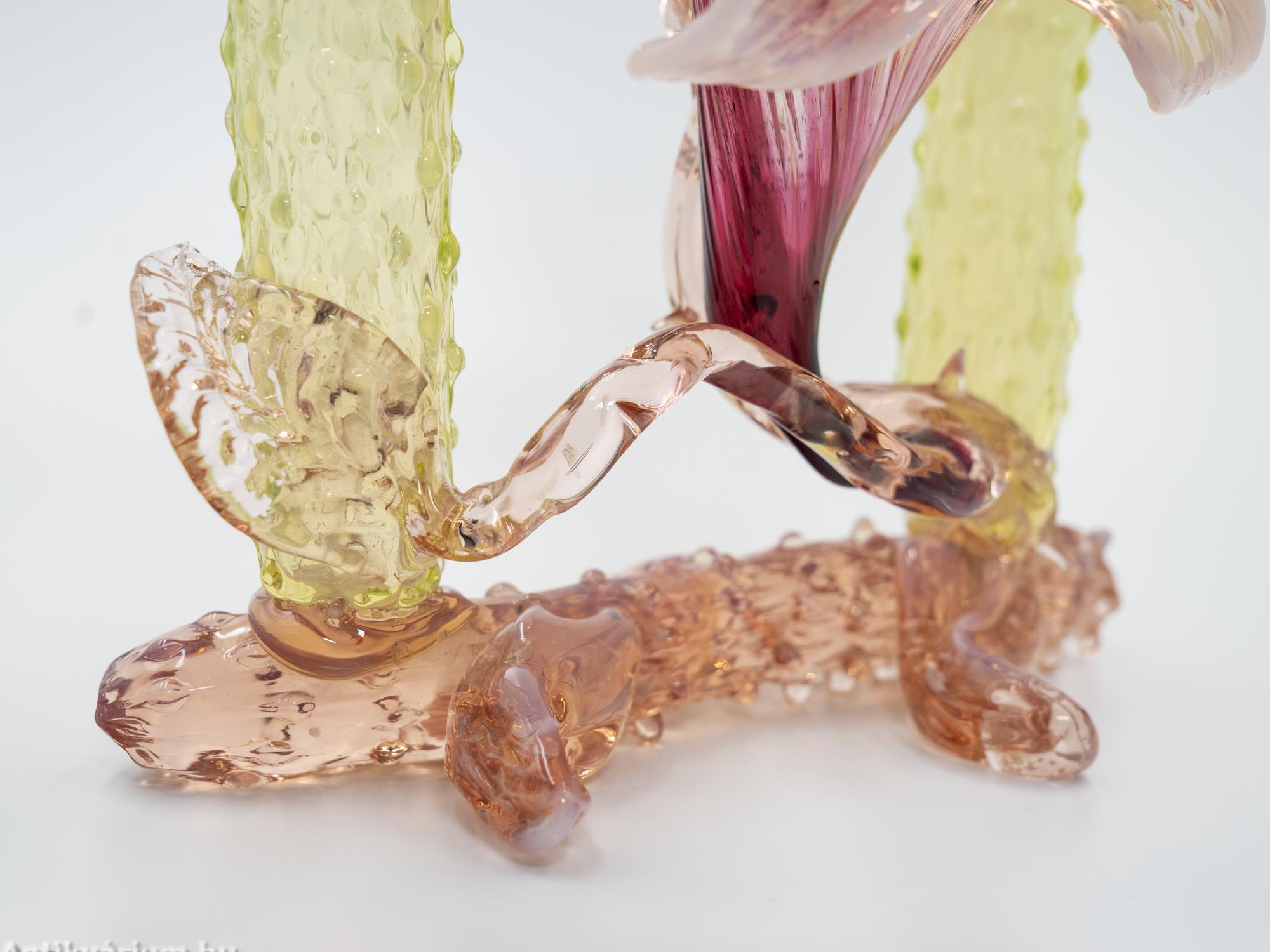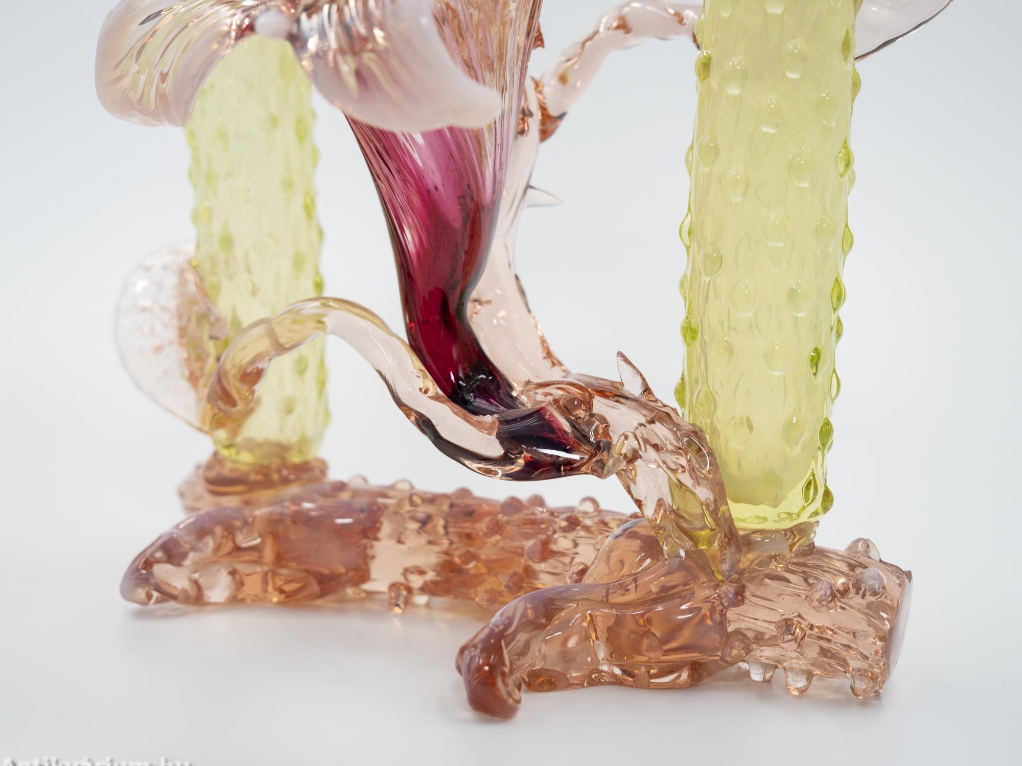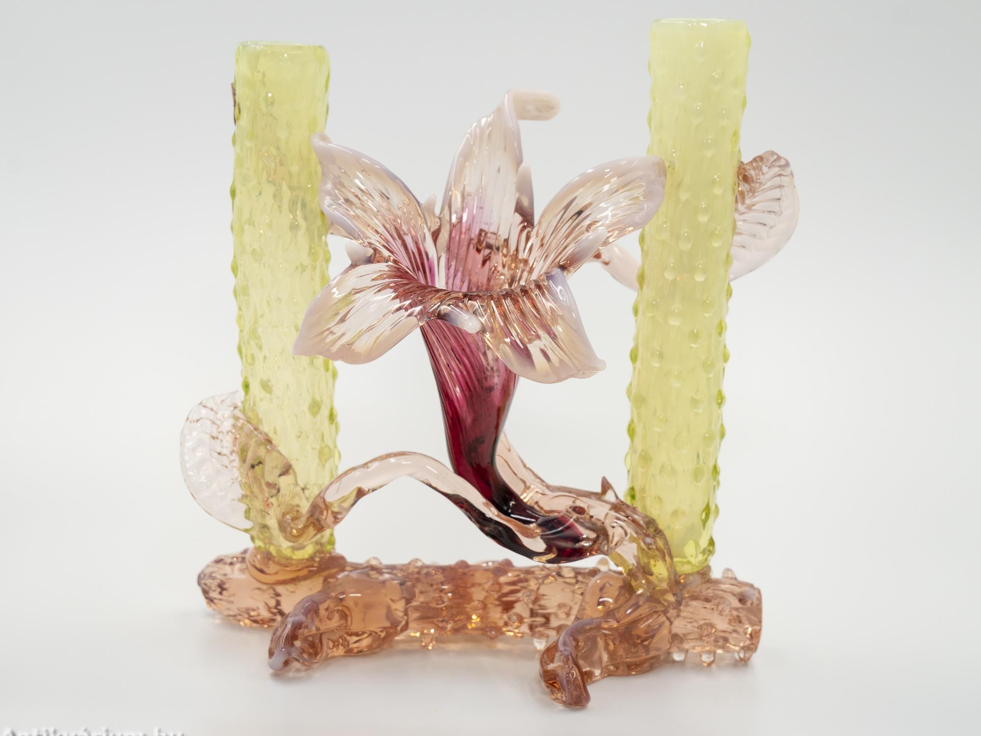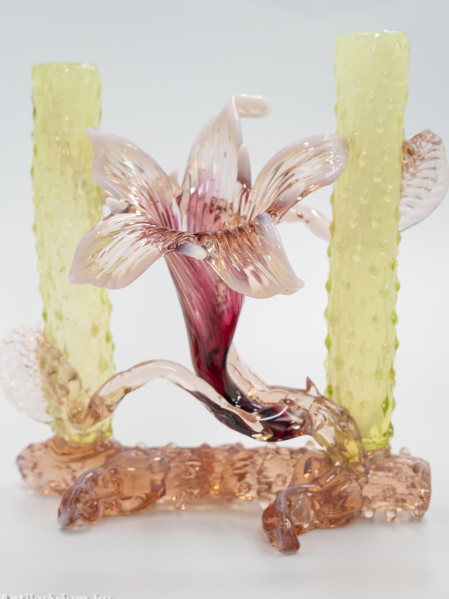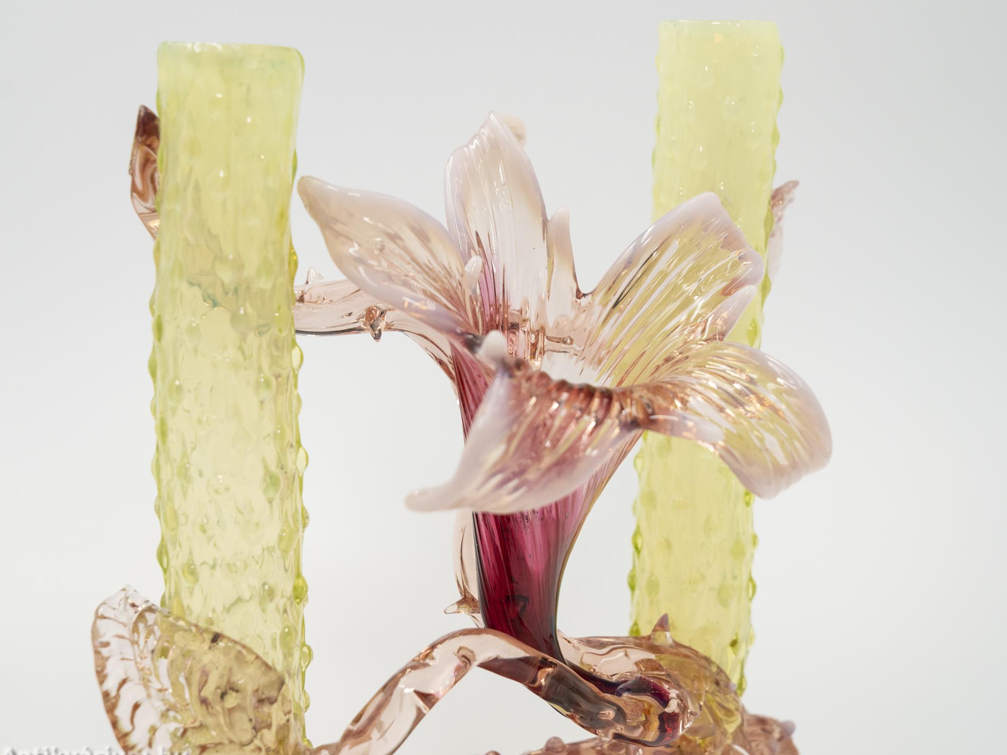 Hibátlan állapotú, fújt és kézzel formázott Kralik Floriform üveg váza - üveg dísztárgy a 19. század végéről. Pink színű virágforma opalin üvegből készített szirmokkal, amit cseppformájú üvegrátétekkel díszített, kétoldali sárga és narancssárga egyszálvirágos vázaszár fog közre. Jellegzetes alkotás a Králik Üveggyár szecessziós időszakából. Ezek a gyönyörű virágos vázák mind egyediek, mindegyik más formában és színben tündököl.