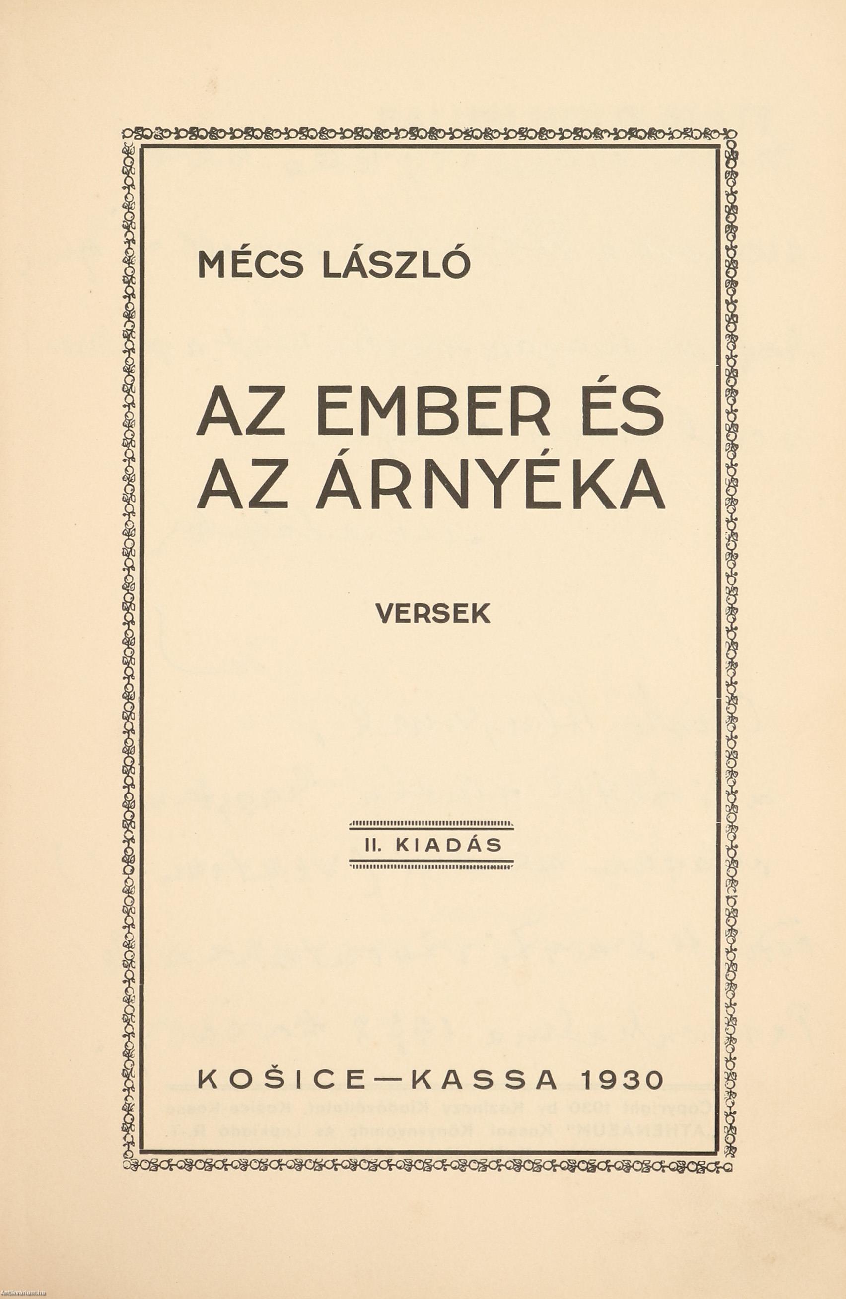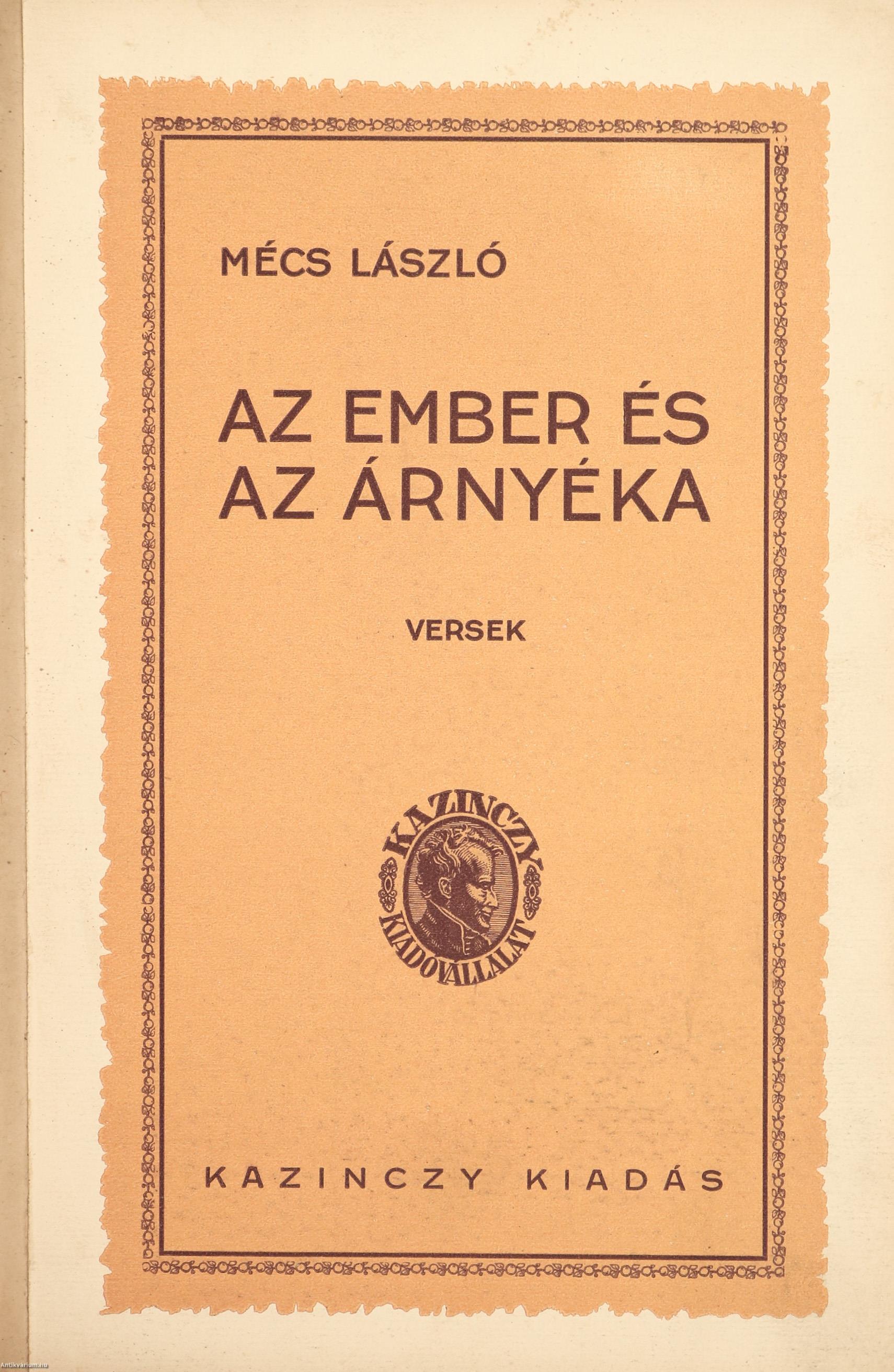 Szerző által dedikált példány. Az ember és árnyéka. Versek. Írta: Mécs László.