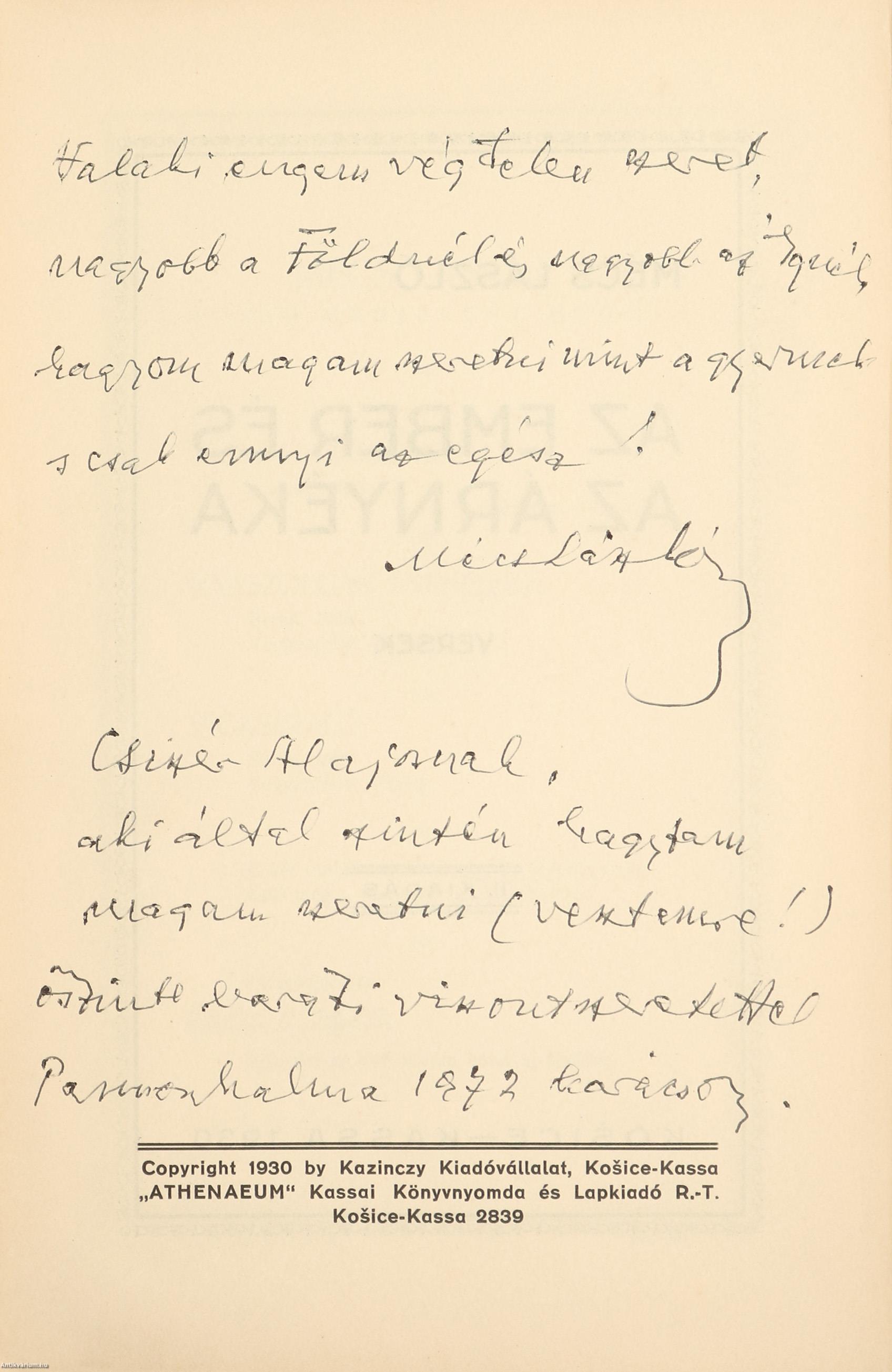 A címlap hátoldalán a szerző, Mécs László tollal beírt, névre szóló, versrészlettel kiegészített dedikációja olvasható:
