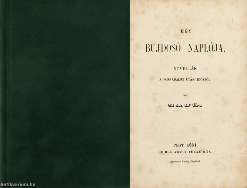 Első kiadás. Egy bujdosó naplója. Novellák a forradalom utáni időkből. Írta Sajó [Jókai Mór].