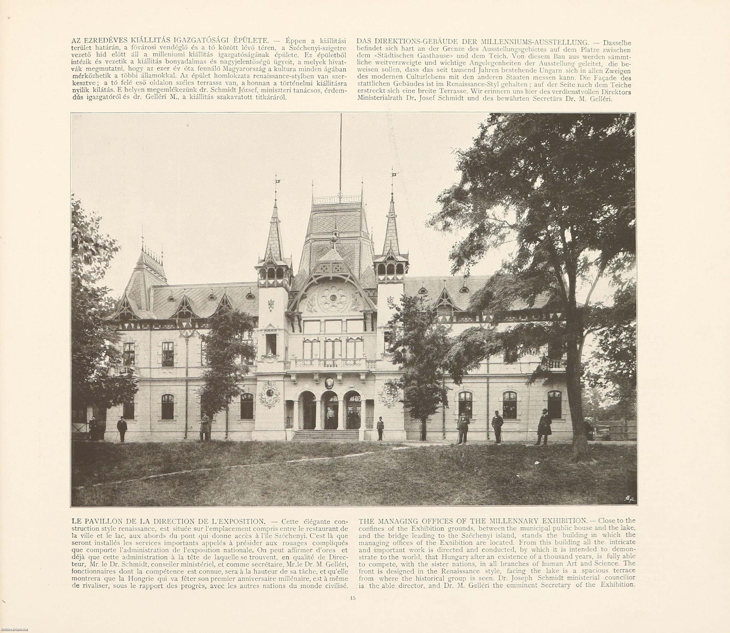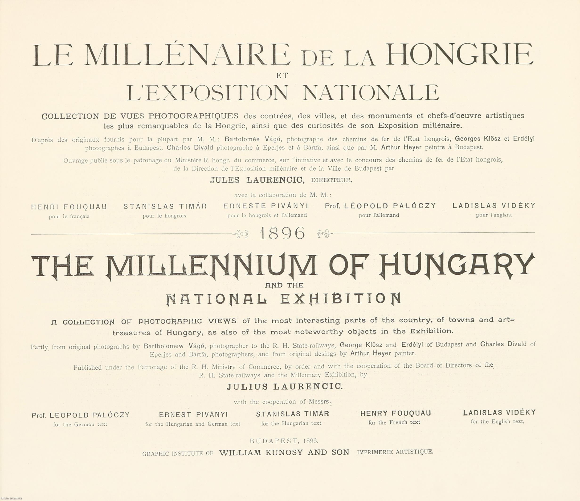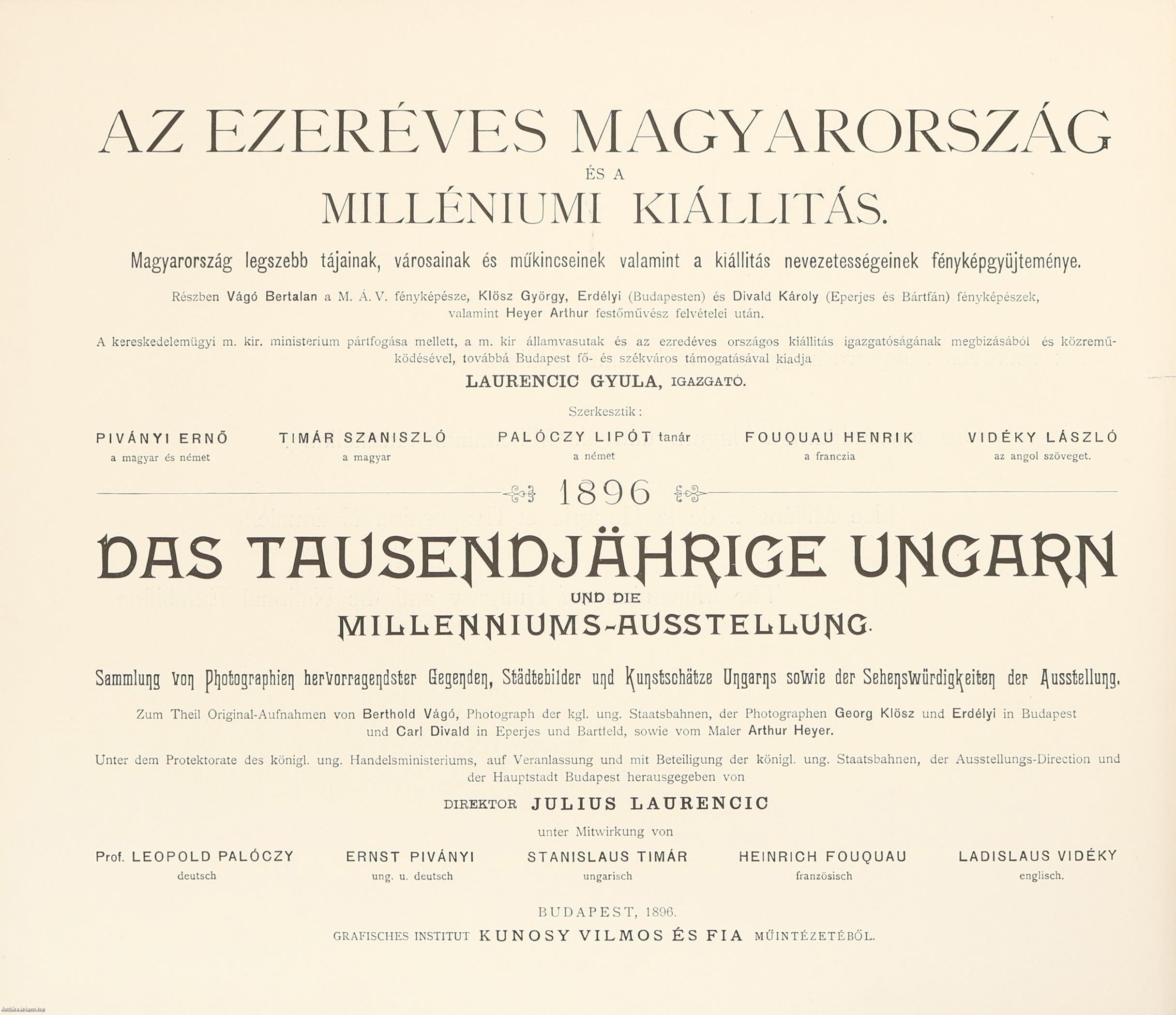2. Az ezeréves Magyarország és a milleniumi kiállitás II. Magyarország a Millenium idejében. (A Kereskedelemügyi M. Kir. Minisztérium magas támogatása mellett, a M. Kir. Államvasutak kezdeményezésére és közreműködésével.) Az ezredéves kiállítási ünnepélyek, tovább a főváros és az ország, valamint a kiállítás kiváló látványosságainak és nevezetességeinek remek fényképgyűjteménye. Szerkesztik: Tímár Szaniszló (magyar-német szöveg), Piványi Ernő (magyar-német szöveg), Fouquau Henrik (francia szöveg) és Vidéky László (angol szöveg).