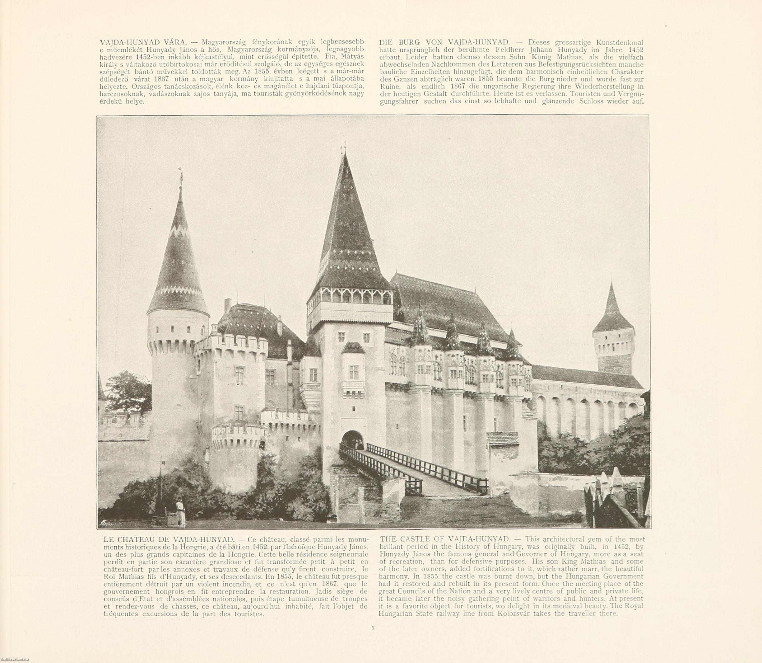 Négynyelvű (magyar, német, francia, angol) jubileumi fényképalbum. I. Ferenc József magyar király fekete-fehér portréjával és szövegközti, fekete-fehér, négy nyelvű szöveganyaggal ellátott fényképekkel illusztrált, valamint bevezetéssel és betűsoros tartalomjegyzékkel (1-12 füzetig) ellátott kötet. Részben Vágó Bertalan a M. Á. V. fényképésze, Klösz György, Erdélyi (Budapesten) és Divald Károly (Eperjes és Bártfán) fényképészek, valamint Heyer Arthur festőművész felvételei után. A kereskedelemügyi m. kir. ministerium pártfogása mellett, a m. kir. államvasutak és az ezredéves országos kiállítás igazgatóságának megbízásából és közreműködésével, továbbá Budapest fő- és székváros támogatásával kiadja Laurencic Gyula, igazgató. Nyomtatta Kunosy Vilmos és Fia Nyomdai Műintézete Budapesten.