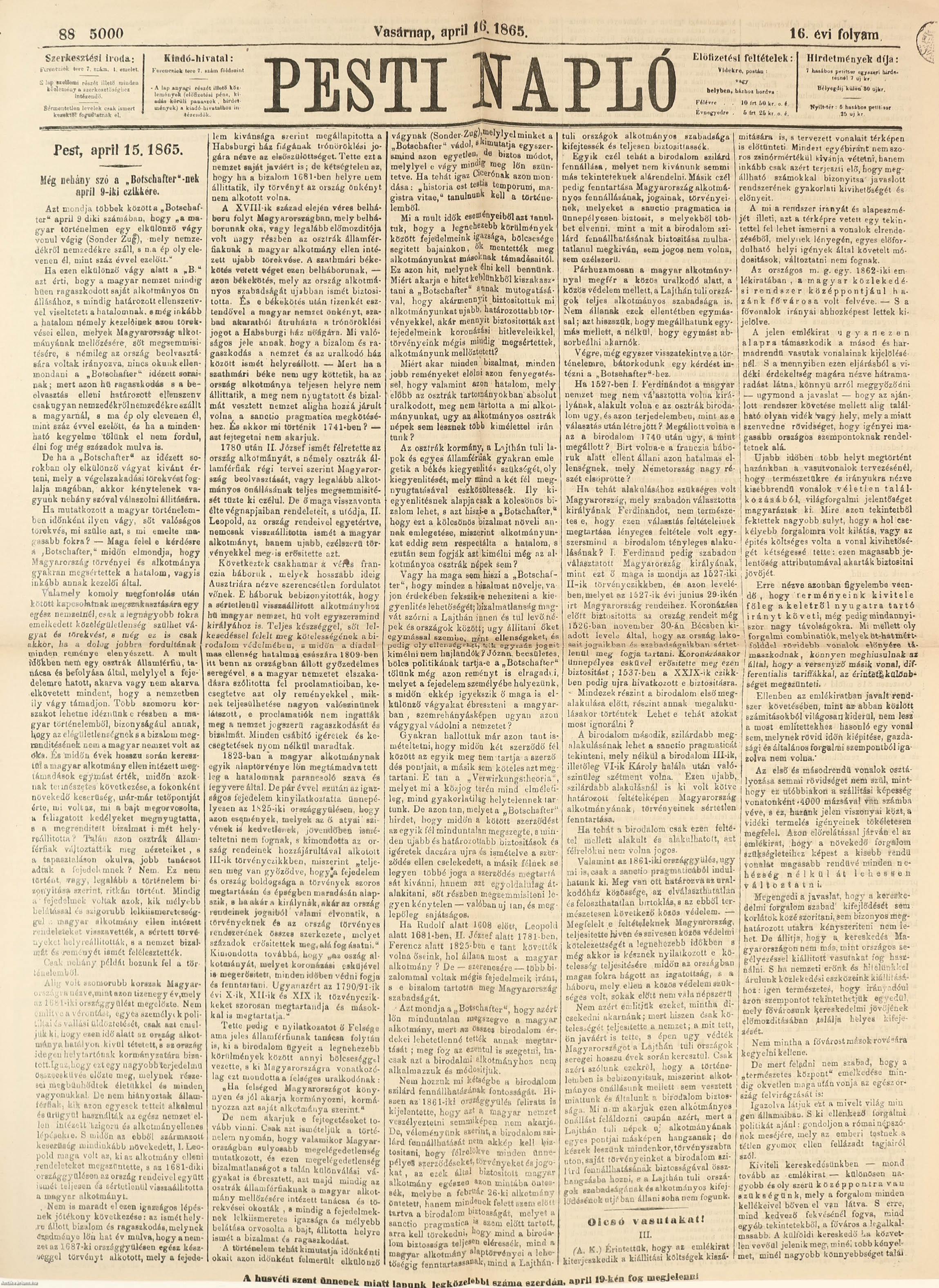Különálló egyedi melléklet: a Pesti Napló 1865. április 16-iki száma (16 évf./88 sz./Vasárnap/4 p.).