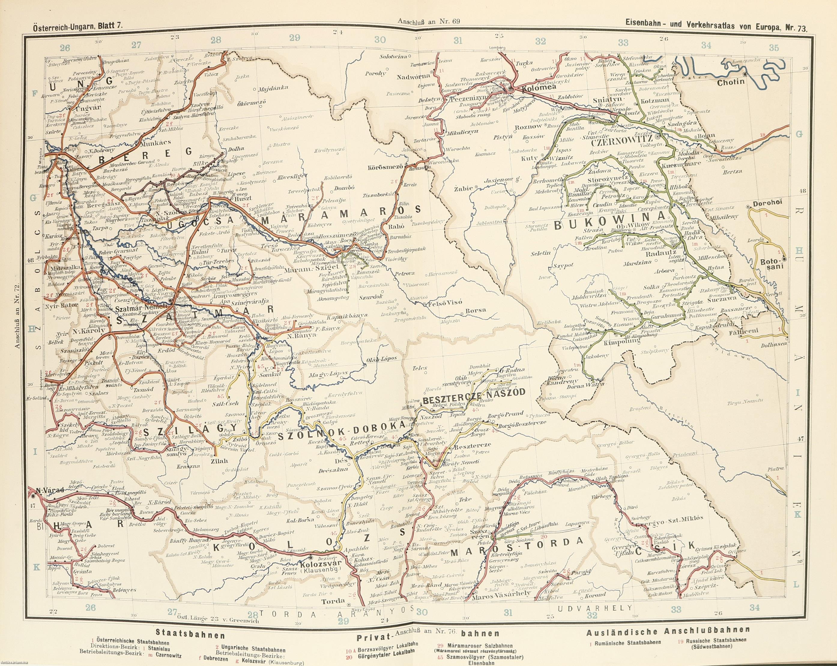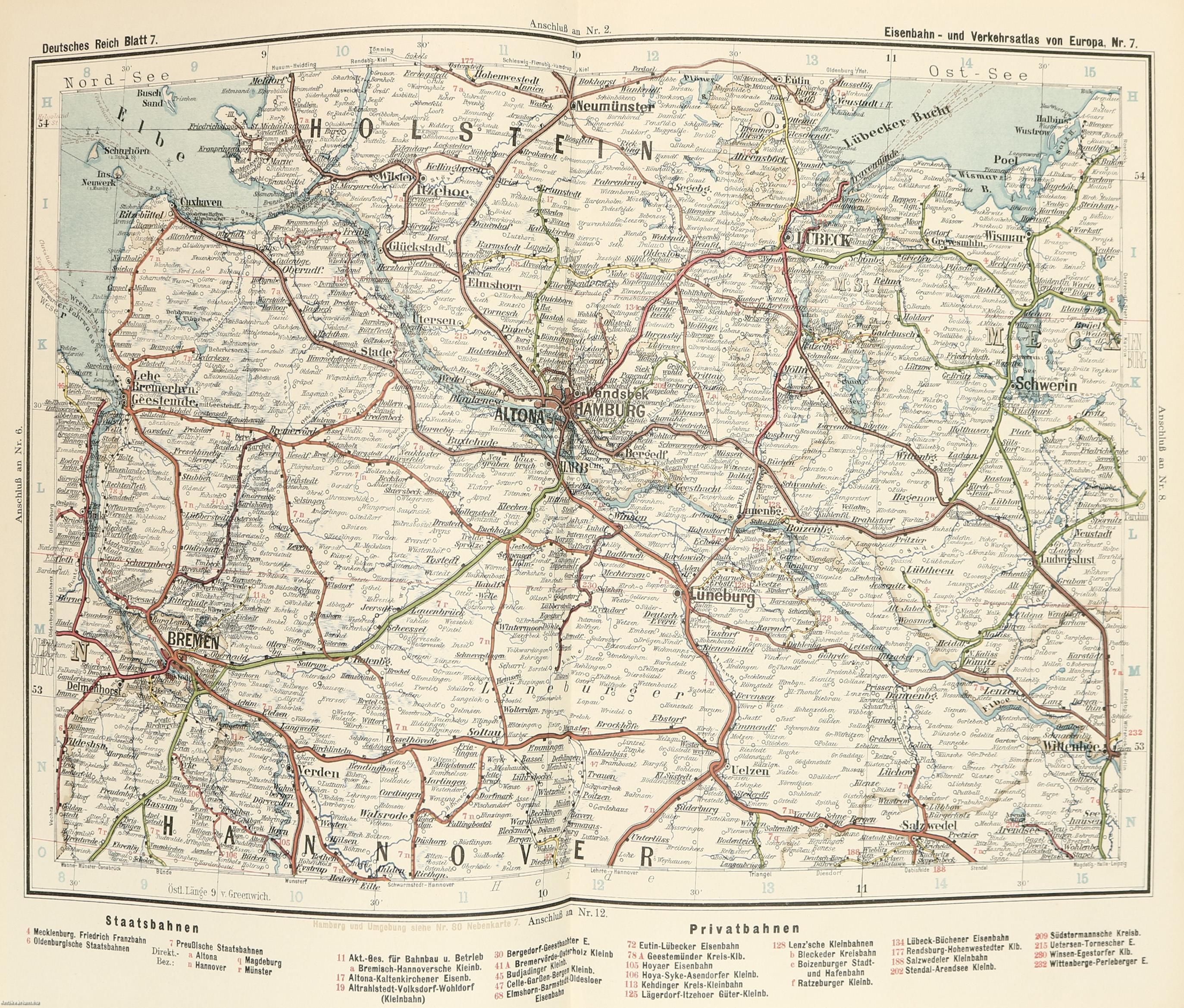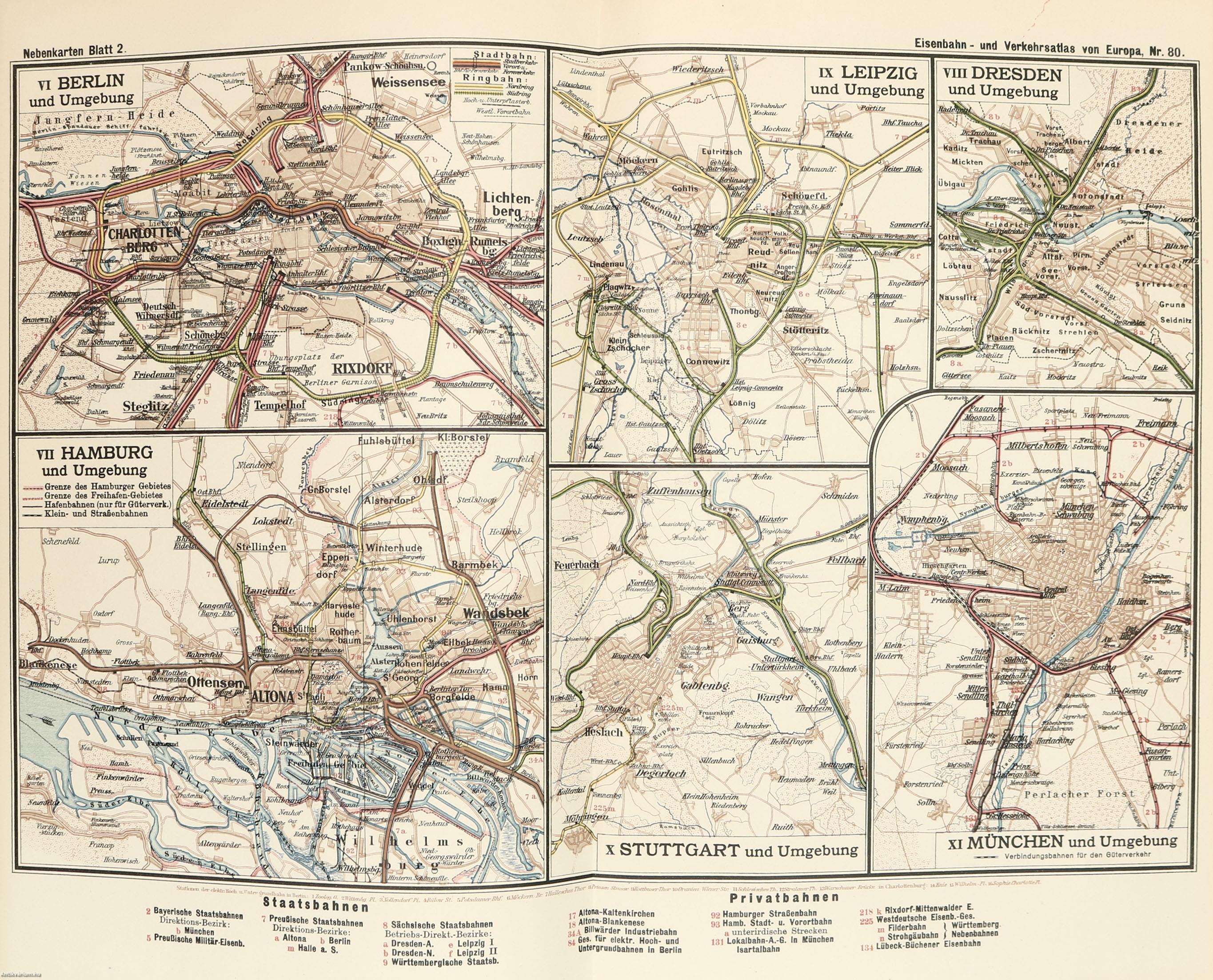 Német nyelvű kiadás. 45 kétoldalas, színes térképlappal illusztrált, valamint a vasúti összeköttetések betűrendes jegyzékével és Európa betűrendes állomásjegyzékével (melyen csak a Német birodalom - Luxenburg - Ausztria-Magyarország - Svájc állomásai lettek feltüntetve) kiegészített mű. Az utolsó térképlap a 82. sorszámmal lett ellátval, viszont a kötet a térképjegyzéknek megfelelően csak 1-30., 67-77. és 79-82. számozású, duplaoldalas térképlapokat tartalmaz.