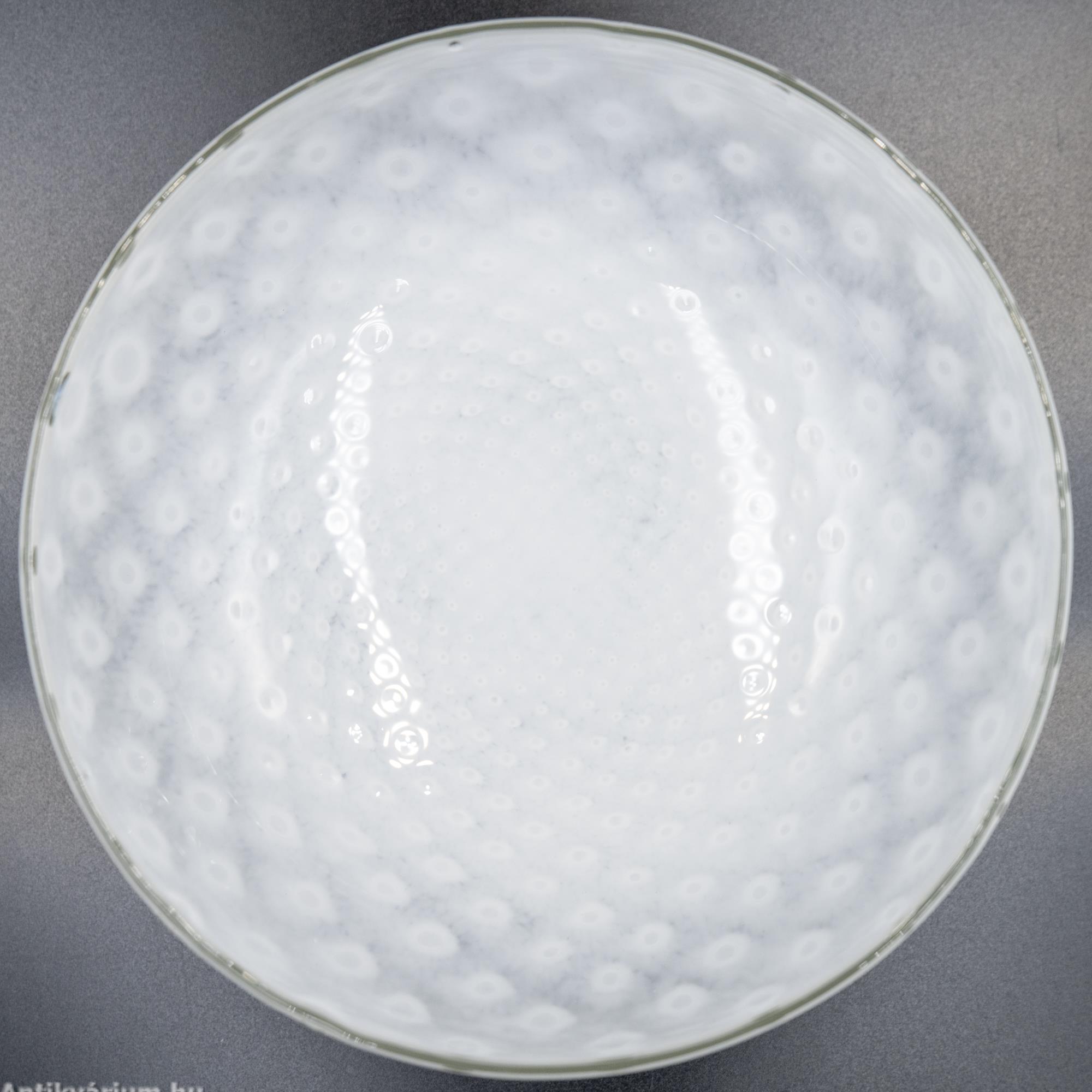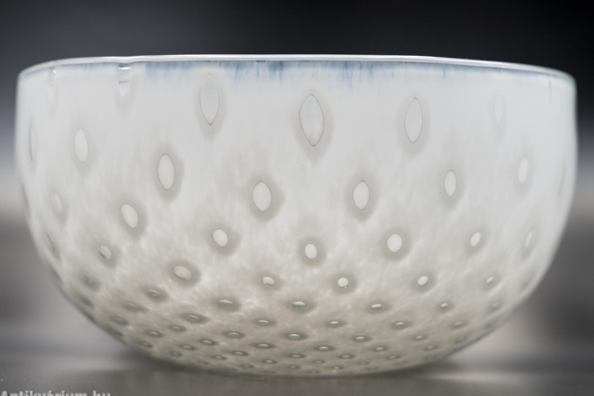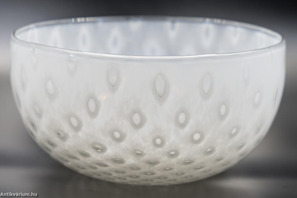 Hibátlan állapotú, fújt és kézzel formázott Murano "Mocenigo" technikával készített fehér üveg tál a 20. század második feléből. Ritka példája a muranoi kézműves mesterek különleges alkotásainak. A mocenigo technika egyediségét és nehézségét az adja, hogy a fújás és kézi formázás közben ügyelni kell a légbuborékok és a fehér opál üvegréteg között megfelelő távolság megtartására, hogy a kívánt méretben elkészülő üveg felületén a minta is megfelelő méretben nyúlhasson, illetve zsugorodhasson. Dekoratív formájának és mintájának köszönhetően igazi enteriőr darab. A muranoi üvegfúvók az olvadt üveg különböző színeinek és annak rétegezésének mesterei voltak, amely technika könnyen azonosítható, de nehezen reprodukálható kiváló minőségben.