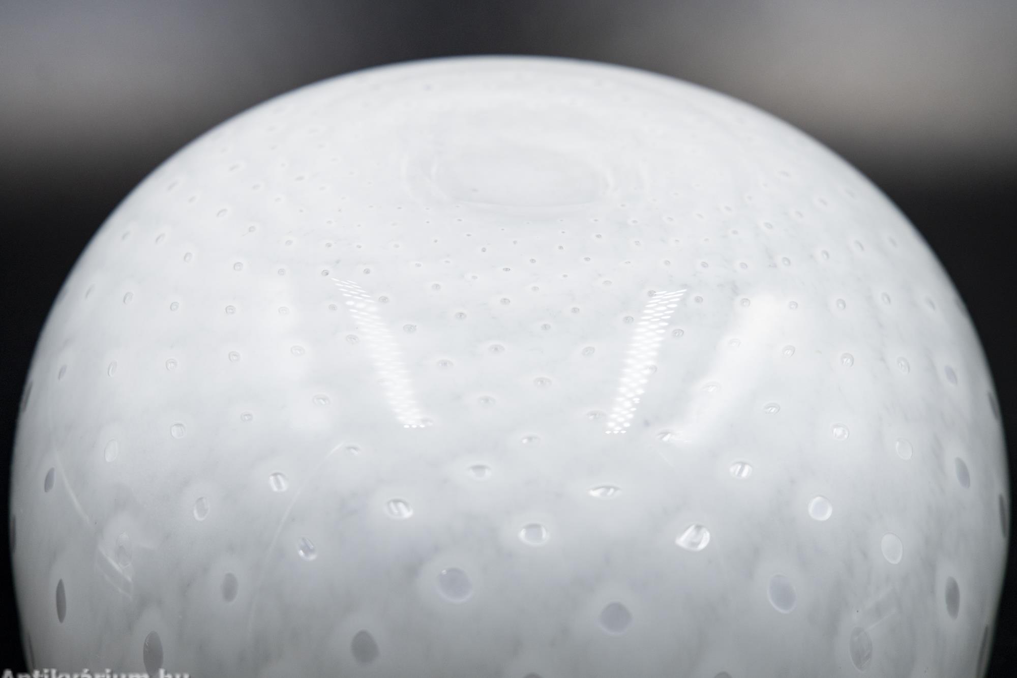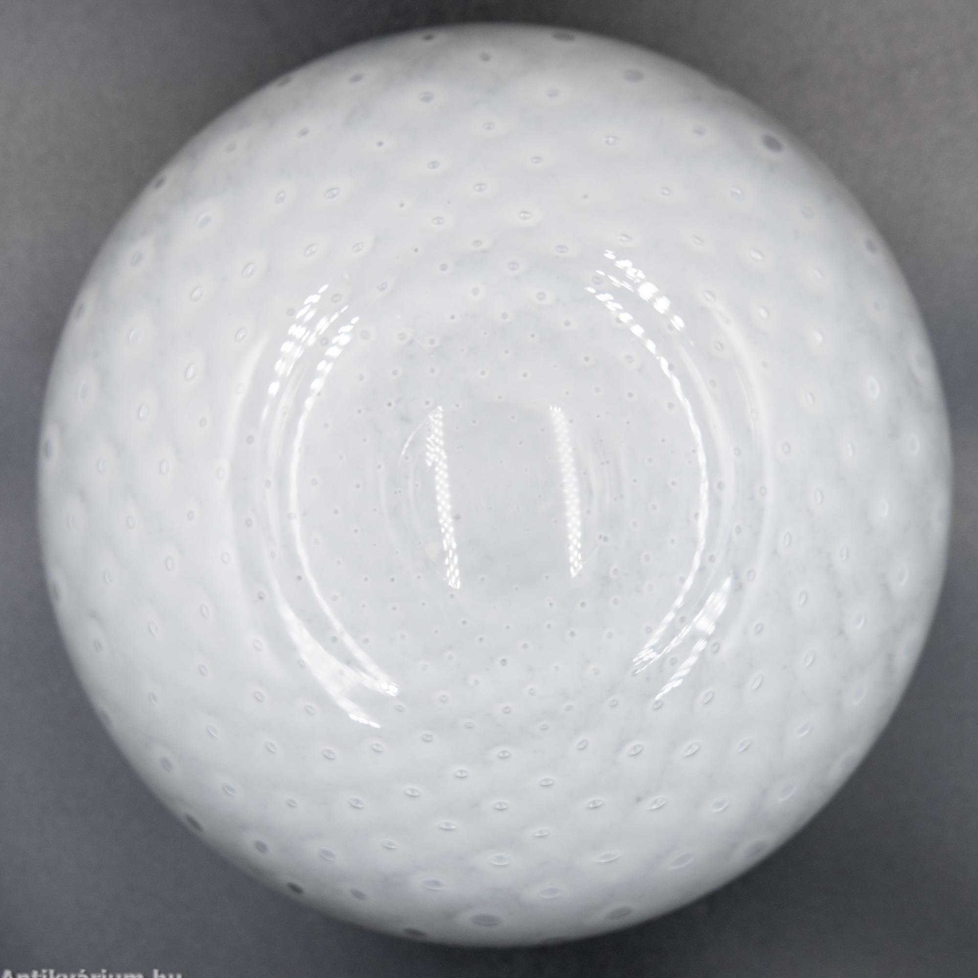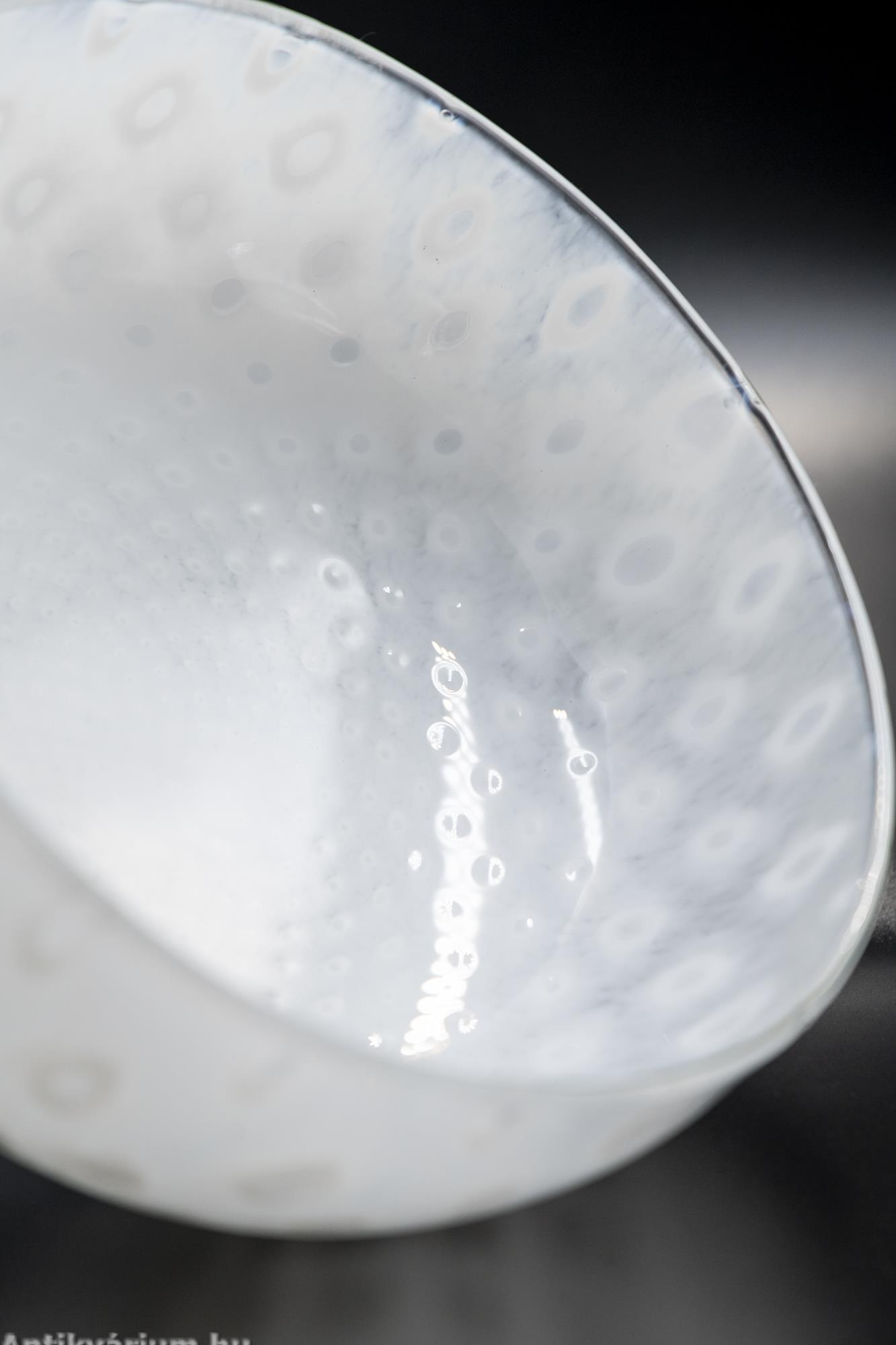 Hibátlan állapotú, fújt és kézzel formázott Murano "Mocenigo" technikával készített fehér üveg tál a 20. század második feléből. Ritka példája a muranoi kézműves mesterek különleges alkotásainak. A mocenigo technika egyediségét és nehézségét az adja, hogy a fújás és kézi formázás közben ügyelni kell a légbuborékok és a fehér opál üvegréteg között megfelelő távolság megtartására, hogy a kívánt méretben elkészülő üveg felületén a minta is megfelelő méretben nyúlhasson, illetve zsugorodhasson. Dekoratív formájának és mintájának köszönhetően igazi enteriőr darab. A muranoi üvegfúvók az olvadt üveg különböző színeinek és annak rétegezésének mesterei voltak, amely technika könnyen azonosítható, de nehezen reprodukálható kiváló minőségben.
