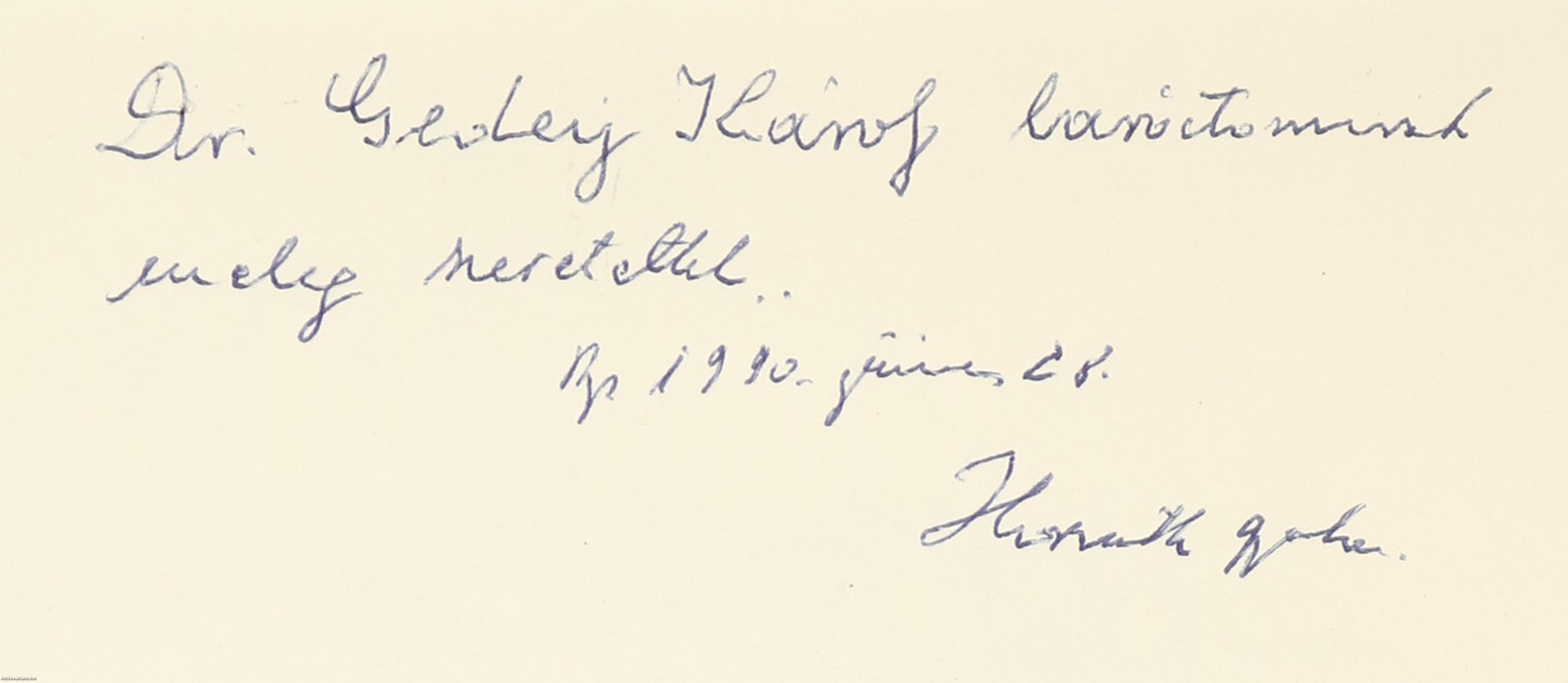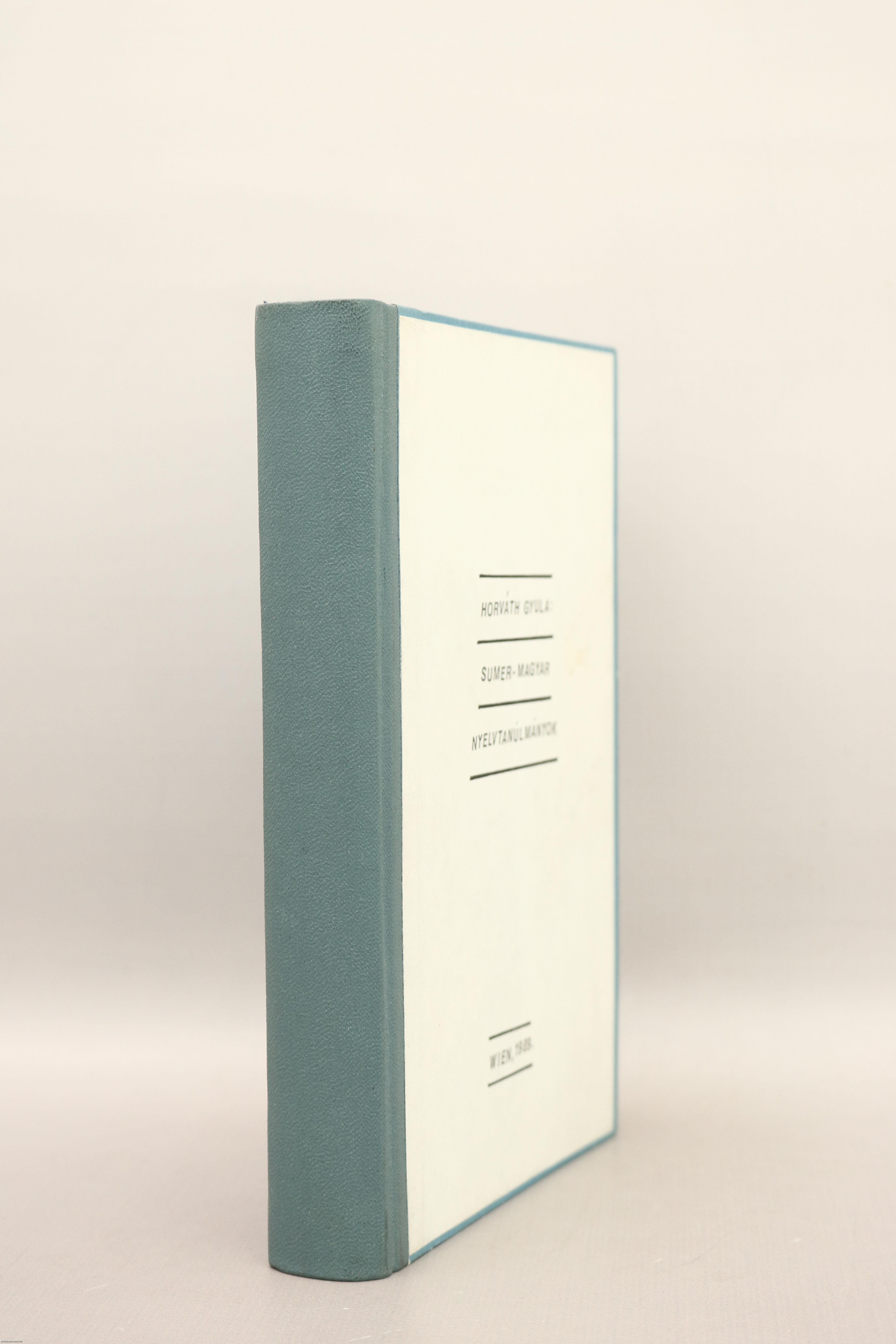 Szerző által dedikál példány. Első kiadás. Sumer-Magyar nyelvtanulmányok. Szerkesztette: Horváth Gyula. A címlapon a szerző, Horváth Gyula tollal beírt, névre szóló dedikációja olvasható: "Dr. G. K. barátomnak meleg szeretettel. Bp. 1990. június 28. Horváth Gyula". Bevezetéssel, bibliográfiával és tartalomjegyzékkel kiegészített kötet. Könyvkötői félvászon kötésben lévő példány, a címfedélre kasírozott, eredeti, feliratozott, kiadói címfedéllel, feliratozatlan könyvgerinccel és hátlappal, hiánytalan állapotban. Az egyik szerző, Magyar Adorján (Budapest, 1887. október 4. – Zelenika, 1978. szeptember 28.) magyar néprajzkutató, őstörténet-kutató, szakíró, aki a magyarság eredetével, vallásával, nyelvével kapcsolatos, olykor meglehetősen merész nézeteivel lett ismert a két világháború között. Fiatal korában Rómában folytatott művészeti tanulmányokat, majd később Erdélyben néprajzi kutatásokat végzett. Arra az álláspontra jutott, hogy az olaszoknak, franciáknak, németeknek nem volt igazi nemzeti stílusuk, hanem nemzetközi stílusok határozták meg művészetüket (gótika, reneszánsz, barokk stb.). Velük szemben a magyar nép saját nemzeti stílussal rendelkezett (Magyar építőízlés). A két világháború között további elméleteket dolgozott, és ezekben végül odáig ment, hogy az emberiség megjelenését is a Kárpát-medence területére tette. Foglalkozott a magyar ősnyelv és ősvallás kérdéskörével is. Támogatta Szépvizi Balás Bélát a magyar ősvallás feltámasztására irányuló kísérleteiben. Kapcsolatot tartott fenn az 1930-as években működő dr. Bencsi Zoltán vezette Turáni Egyistenhívők Mozgalmával is. A második világháború utáni megváltozott politikai–kulturális légkörben nem tudta folytatni kutatásainak–elméleteinek publikálását, azok közül csak néhány látott napvilágot külföldi (dél-amerikai, svájci, amerikai) magyar nyelvű folyóiratokban és könyvekben.