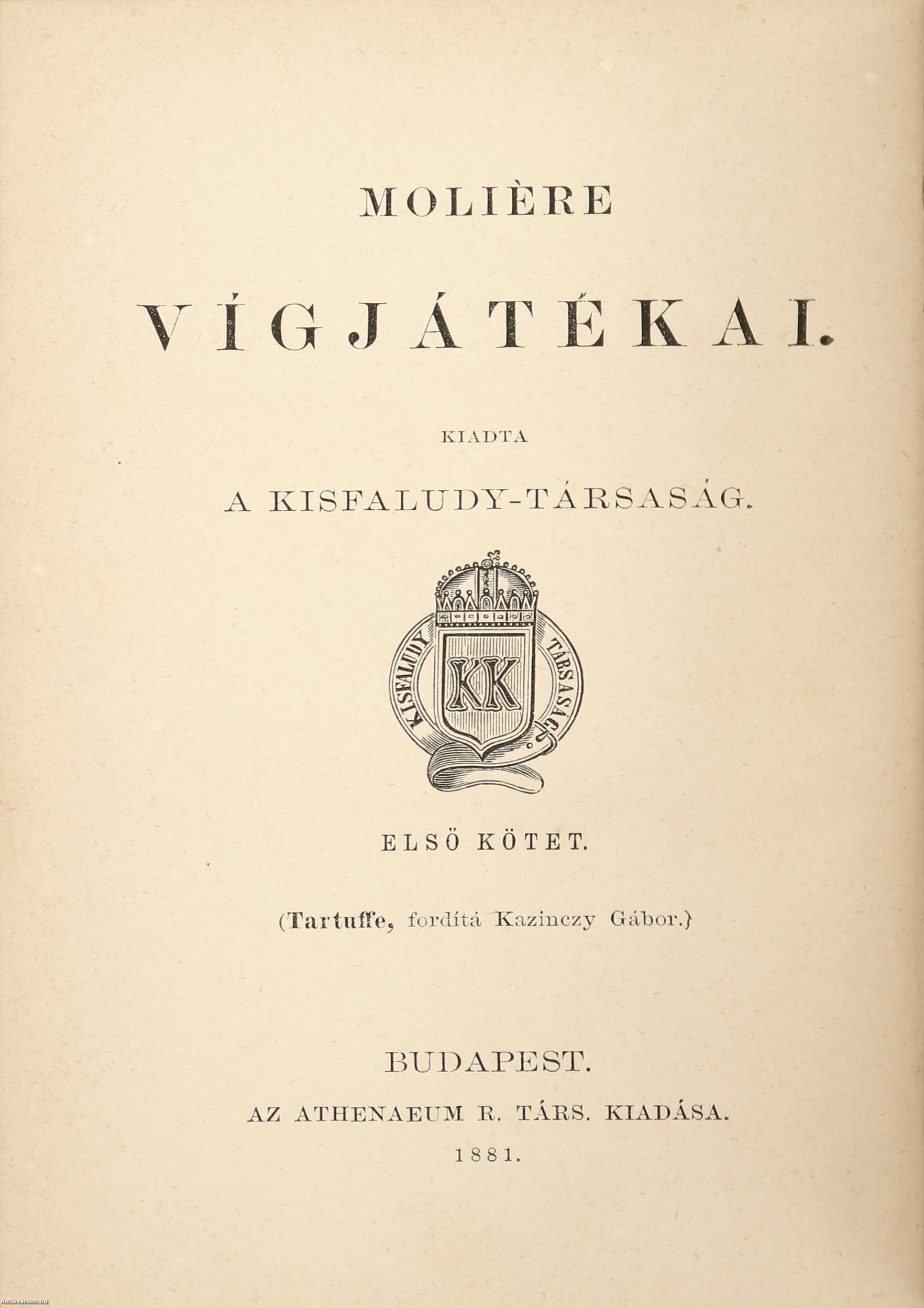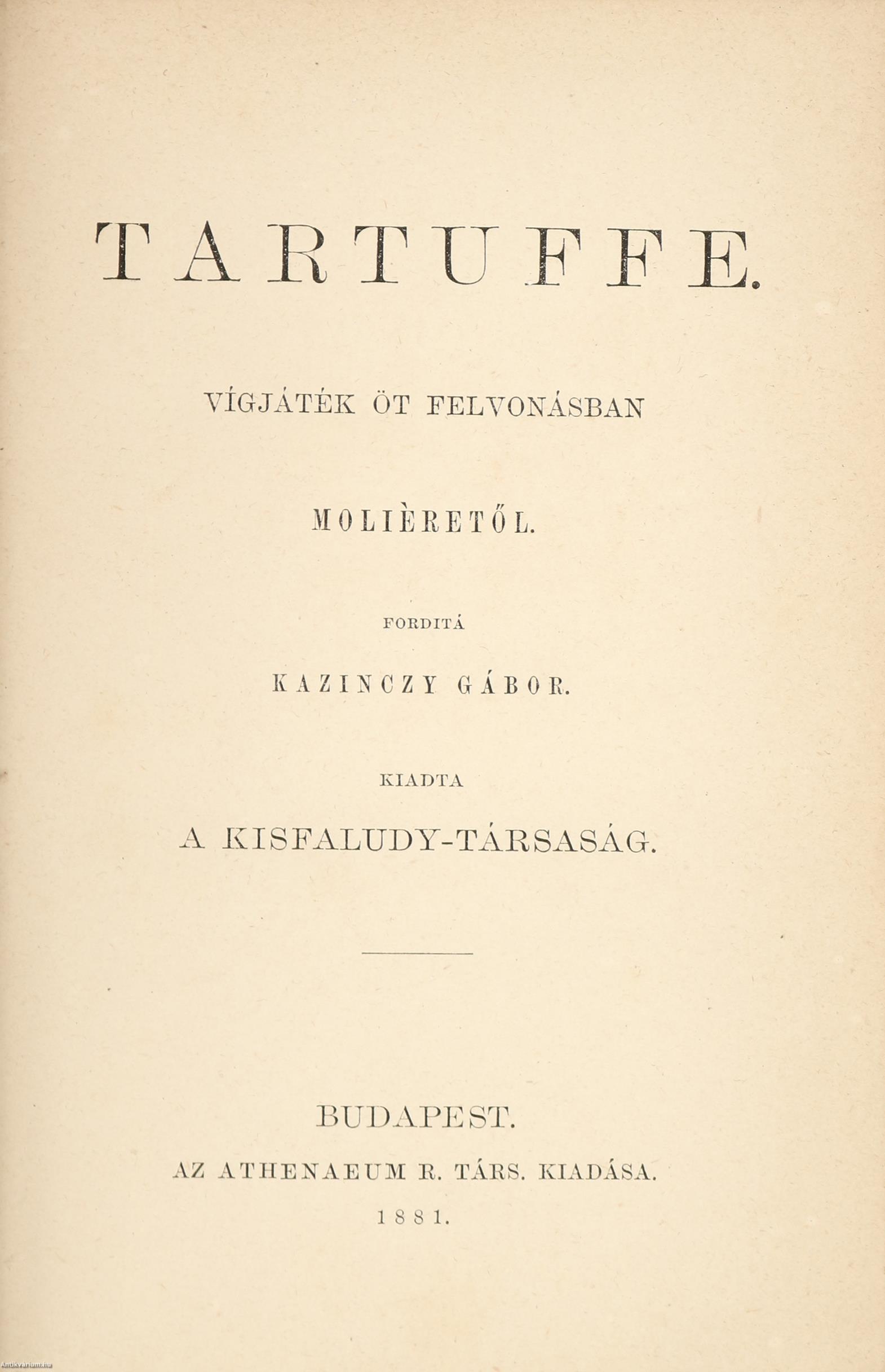 - I. kötet: Tartuffe. Vígjáték öt felvonásban. Fordítá: Kazinczy Gábor. Bp., 1881, XXVII p. + [1] p. + 168 p.