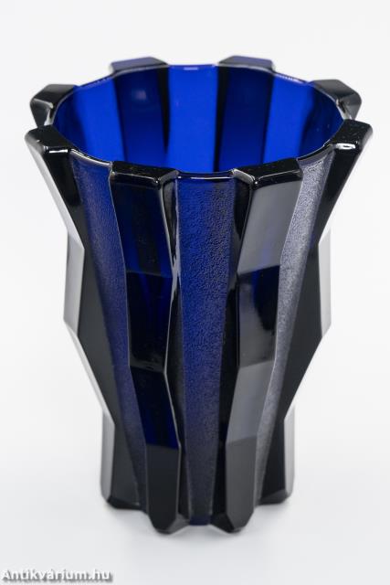 Hibátlan állapotú Stölzle art deco formába préselt kobaltkék üveg váza az 1930-as évekből. A nyolcosztásos matt és a csiszolt fényes felületek függőleges sávokban szabályosan követik egymást. Az art deco esztétika jegyeit magán viselő elegáns üvegáru, amely kihangsúlyozza az egyenes, leegyszerűsített vonalvezetést és modern formát, valamint az erős, tiszta színvilág használatát. Mindezeket tökéletes kivitelezésben. 1805-ben Carl Stölzle két üveggyárat alapított Ausztriában Bécsben, majd 1867-re ez a szám a csehországi műhelyekkel kiegészülve már hétre emelkedett. A Heřmanova gyárát 1907-ben alapították, amelyben a formába préselt art deco üvegáruk nagy része készült.