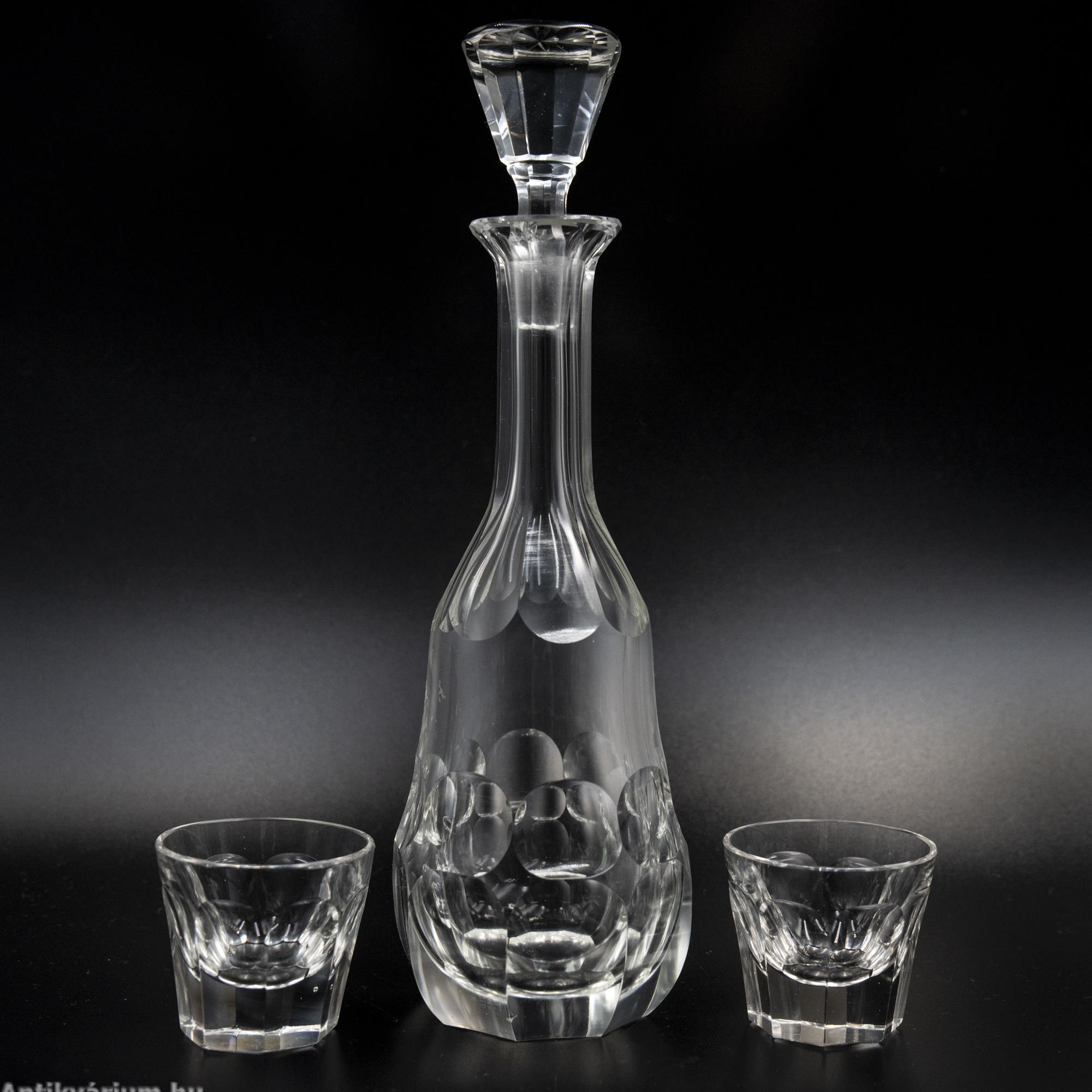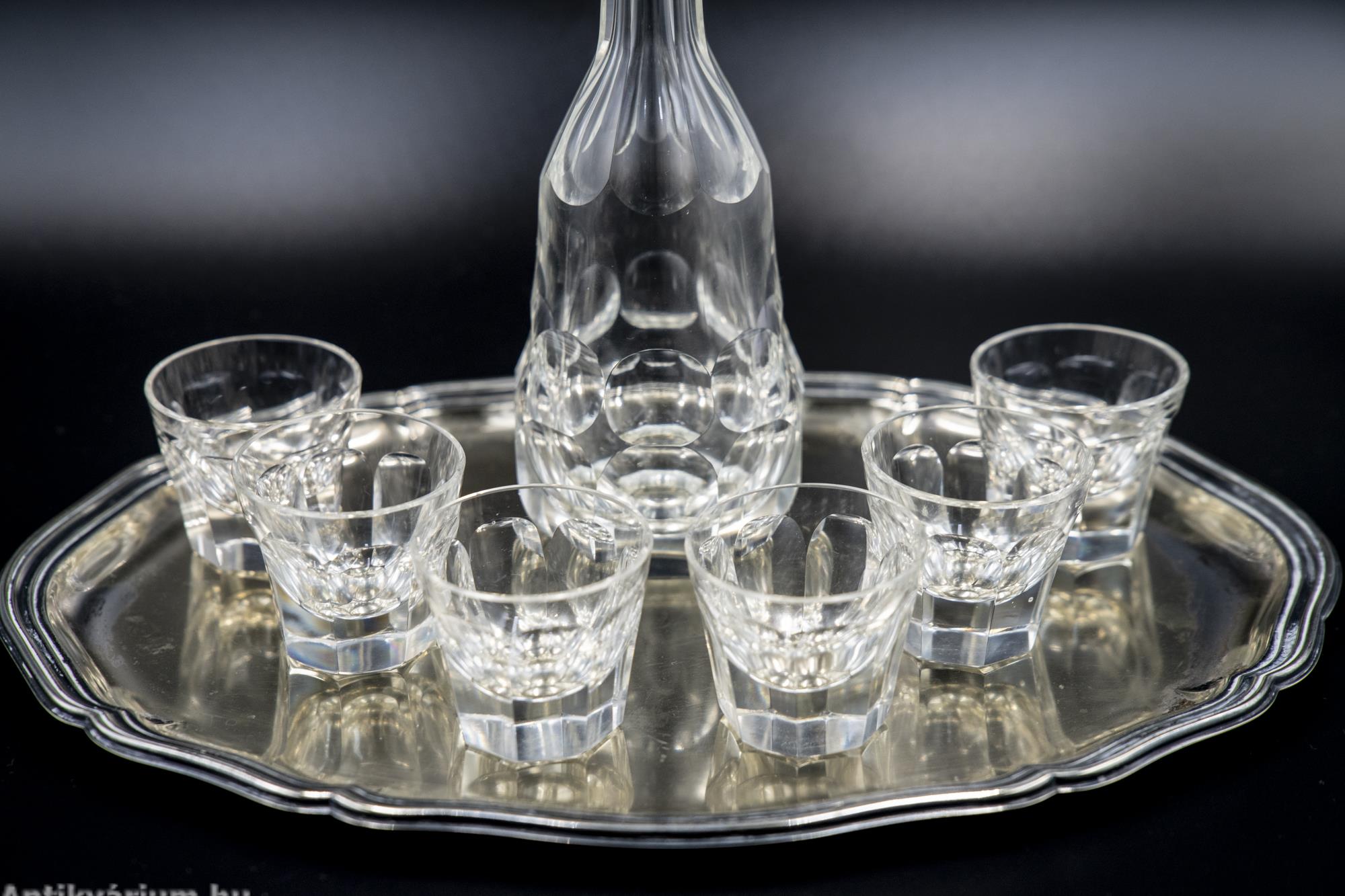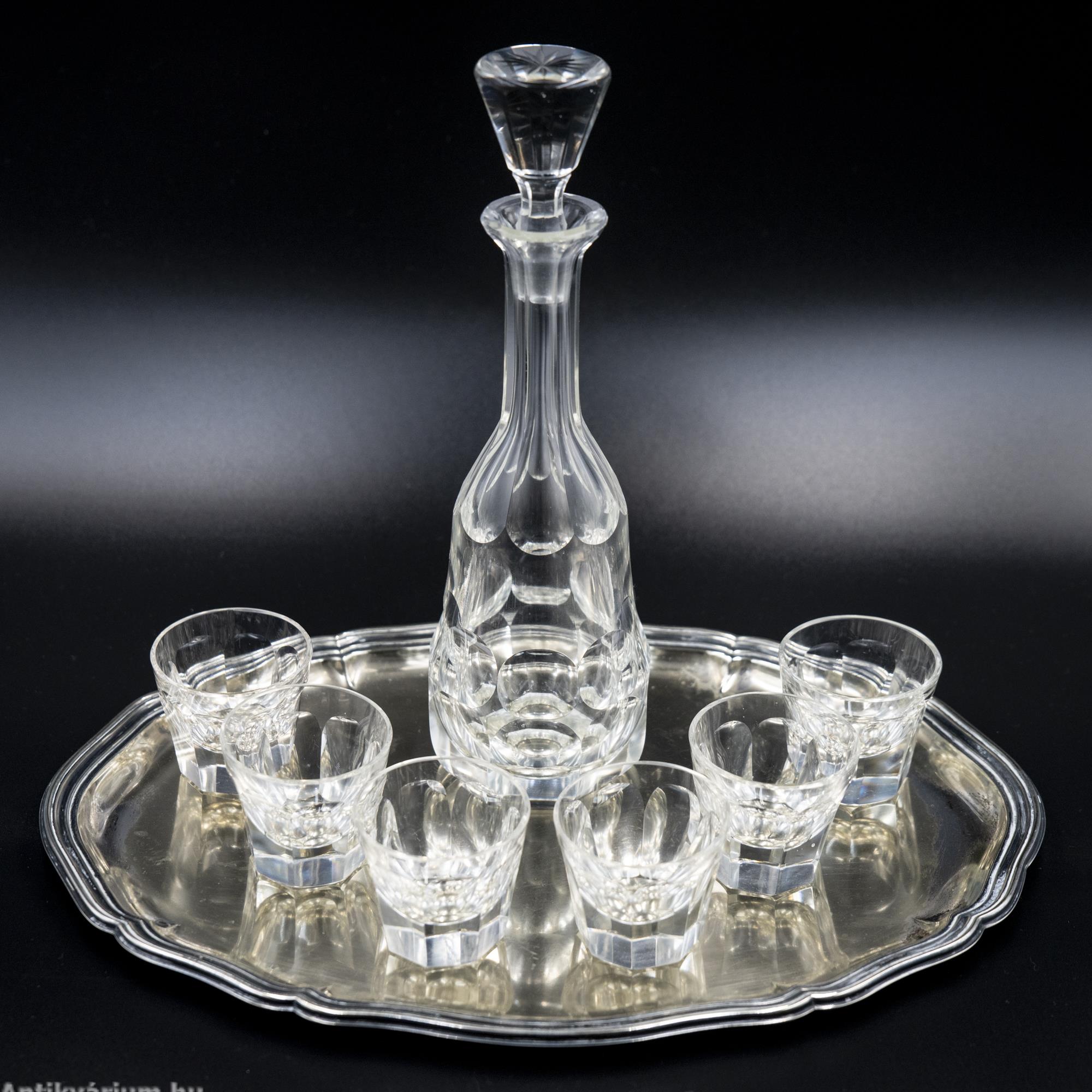 Hibátlan állapotú, fújt és kézzel formázott, lapra csiszolt, az art deco jegyeit tisztán megjelenítő Moser likőrös szett. A 7 darabos készlet egy üveg dugóval ellátott palackból és 6 darab pohárkából áll. Minden darabjára jellemző a vastag rétegű üveg alkalmazása és a lapra csiszolt oldalak. Egyedi és ritka, ikonikus Moser darab, amely jellegzetesen képviseli az art deco stílusra jellemző geometriai tervezést, az egyenes, leegyszerűsített vonalvezetést, kihangsúlyozva a modern formát és a tökéletes kivitelezést. A fém tálca az üveg készletnek megfelelő korú, ezüstözött alpakkából készült, alpakka jelzéssel.