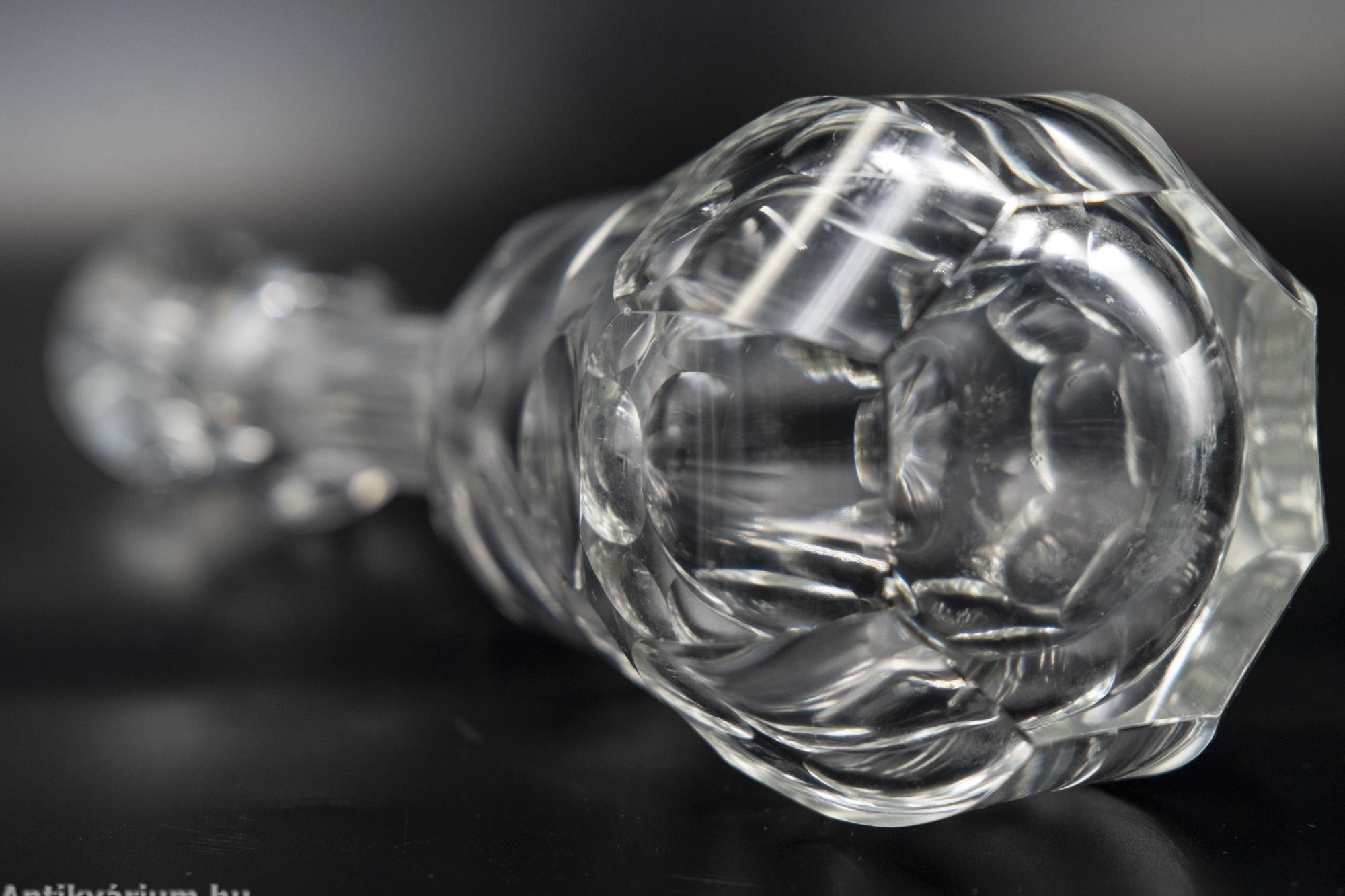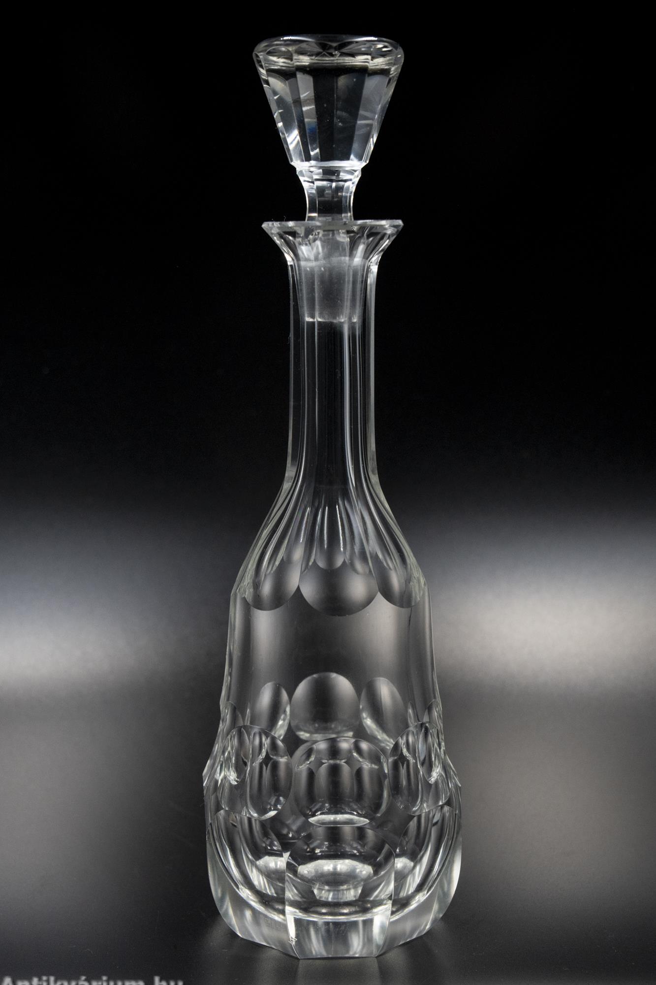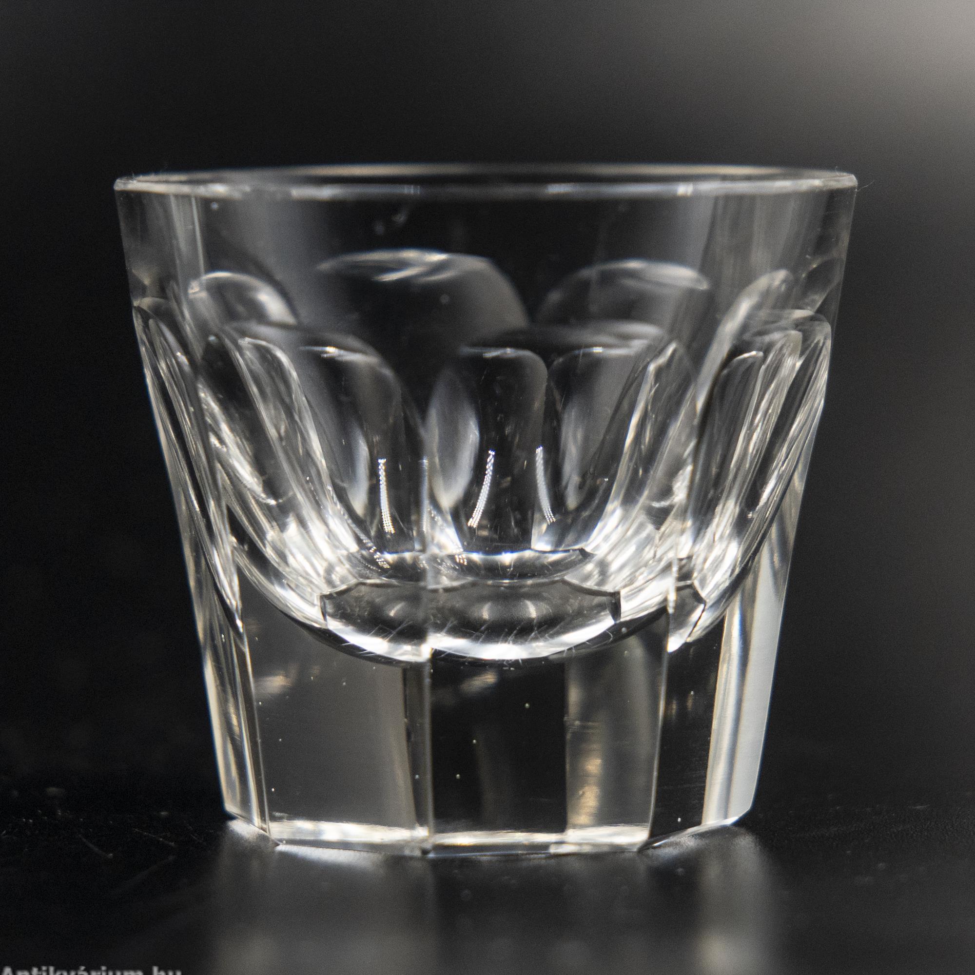 Hibátlan állapotú, fújt és kézzel formázott, lapra csiszolt, az art deco jegyeit tisztán megjelenítő Moser likőrös szett. A 7 darabos készlet egy üveg dugóval ellátott palackból és 6 darab pohárkából áll. Minden darabjára jellemző a vastag rétegű üveg alkalmazása és a lapra csiszolt oldalak. Egyedi és ritka, ikonikus Moser darab, amely jellegzetesen képviseli az art deco stílusra jellemző geometriai tervezést, az egyenes, leegyszerűsített vonalvezetést, kihangsúlyozva a modern formát és a tökéletes kivitelezést. A fém tálca az üveg készletnek megfelelő korú, ezüstözött alpakkából készült, alpakka jelzéssel.