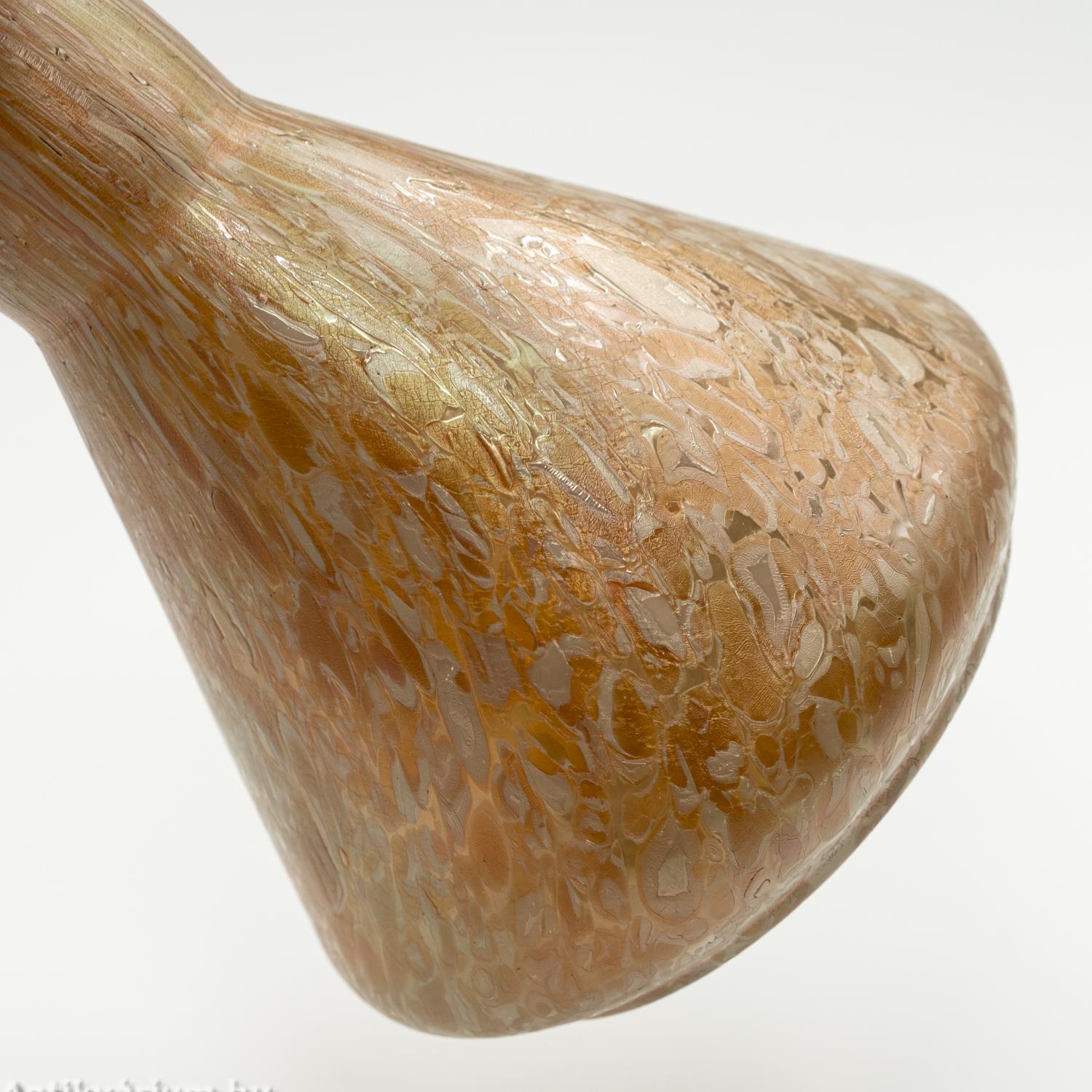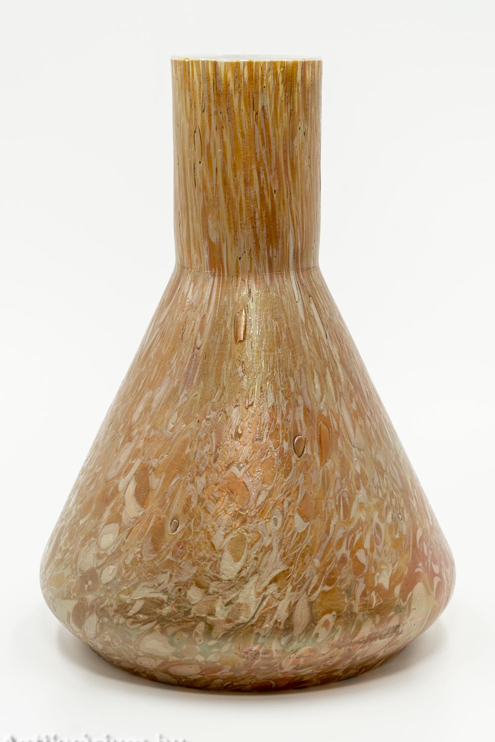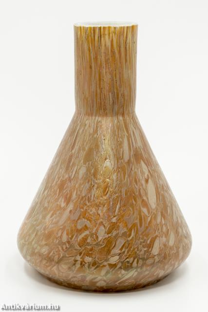 Hibátlan állapotú Kralik Papillon lüszteres art deco üveg váza a 20. század elejéről. Fújt és kézzel formázott narancssárga színű üveg váza, amely szín a külső felszínén látható nehézfémoxidos eljárásoknak köszönhető. Lüszterezett felülete zöldes - lilás színben jelenik meg. Teljes felületét papillon (pillangó hatású foltok) mintázat borítja hol elnyújtott, hol szabálytalan folt alakzatban. Letisztult, a felületi szín és fényhatásnak teret engedő formavilágot képviselő üveg váza. A papillon minta az egyik legismertebb üvegfelületi dekor, megjelenhet kobaltkék, opál, narancs, sárga vagy rubinvörös színben, ezüstös-sárga (olajfoltos) szemcsékkel tarkítva.