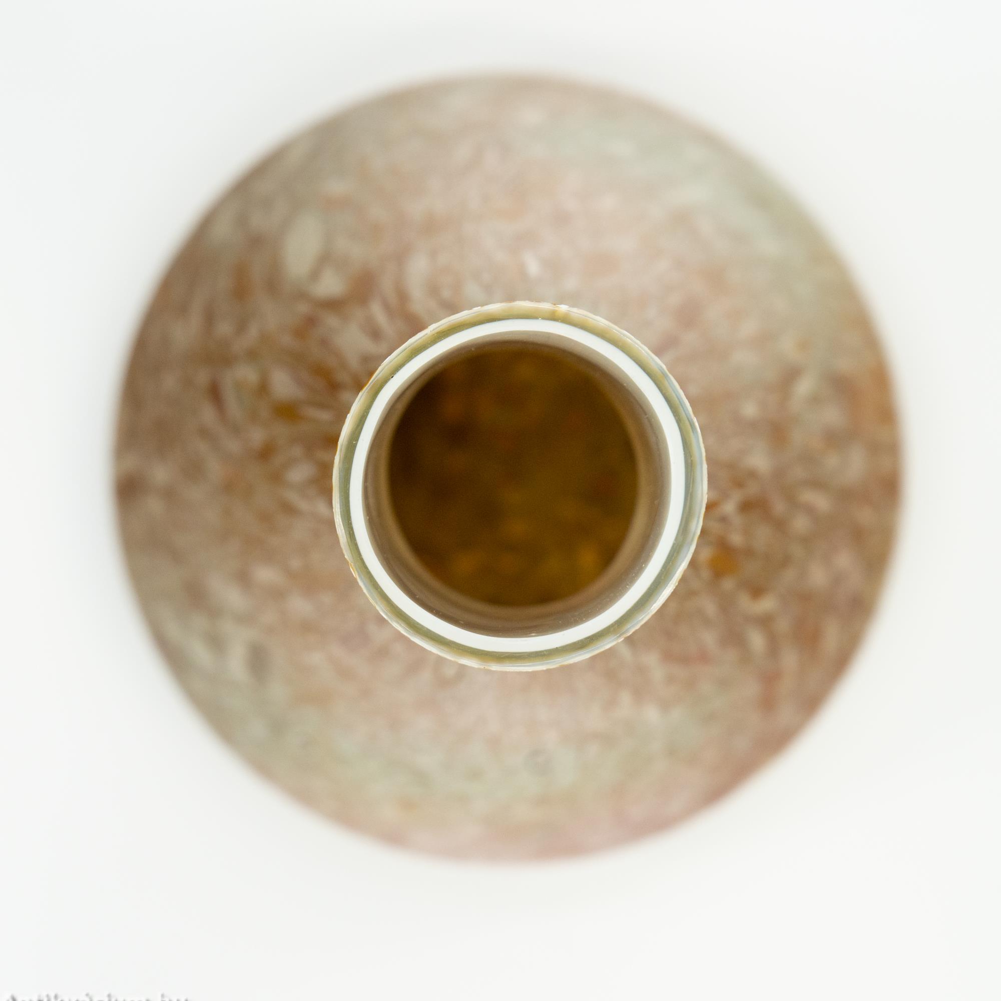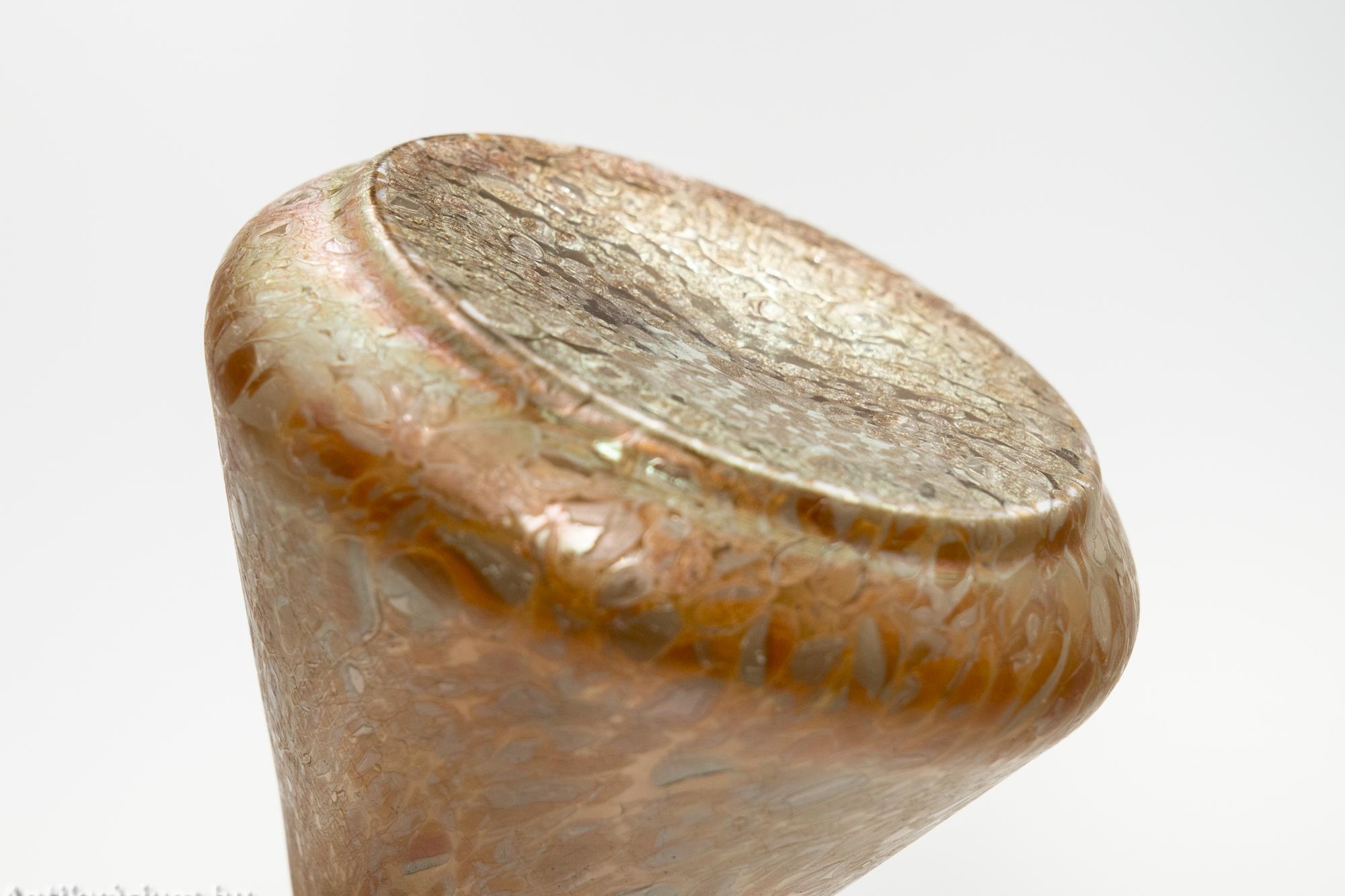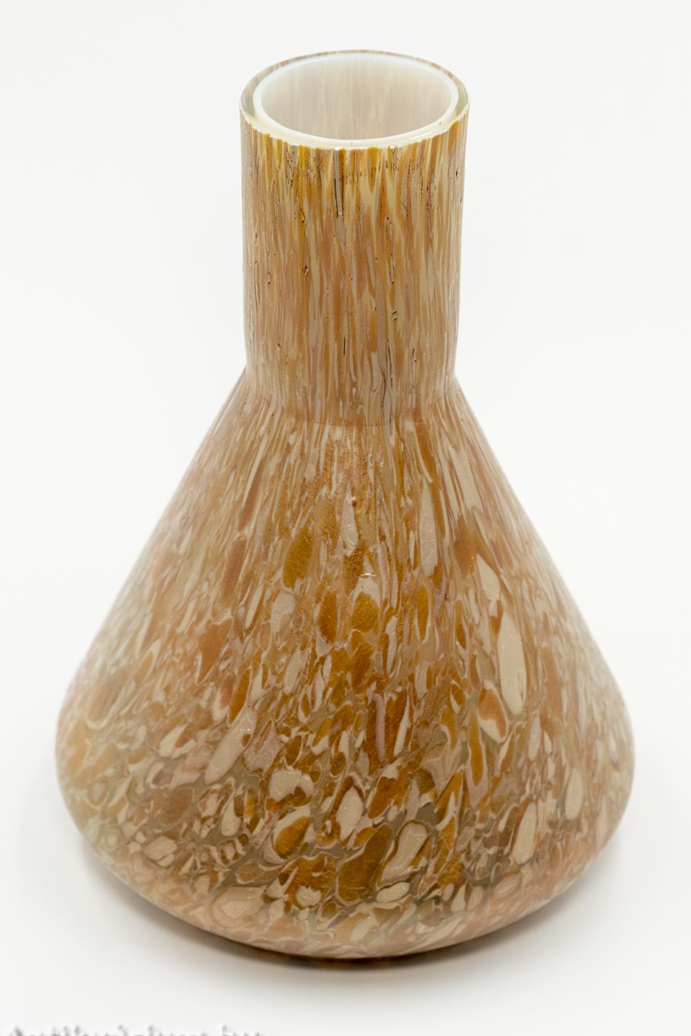 Hibátlan állapotú Kralik Papillon lüszteres art deco üveg váza a 20. század elejéről. Fújt és kézzel formázott narancssárga színű üveg váza, amely szín a külső felszínén látható nehézfémoxidos eljárásoknak köszönhető. Lüszterezett felülete zöldes - lilás színben jelenik meg. Teljes felületét papillon (pillangó hatású foltok) mintázat borítja hol elnyújtott, hol szabálytalan folt alakzatban. Letisztult, a felületi szín és fényhatásnak teret engedő formavilágot képviselő üveg váza. A papillon minta az egyik legismertebb üvegfelületi dekor, megjelenhet kobaltkék, opál, narancs, sárga vagy rubinvörös színben, ezüstös-sárga (olajfoltos) szemcsékkel tarkítva.