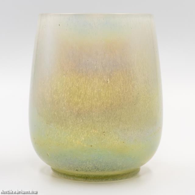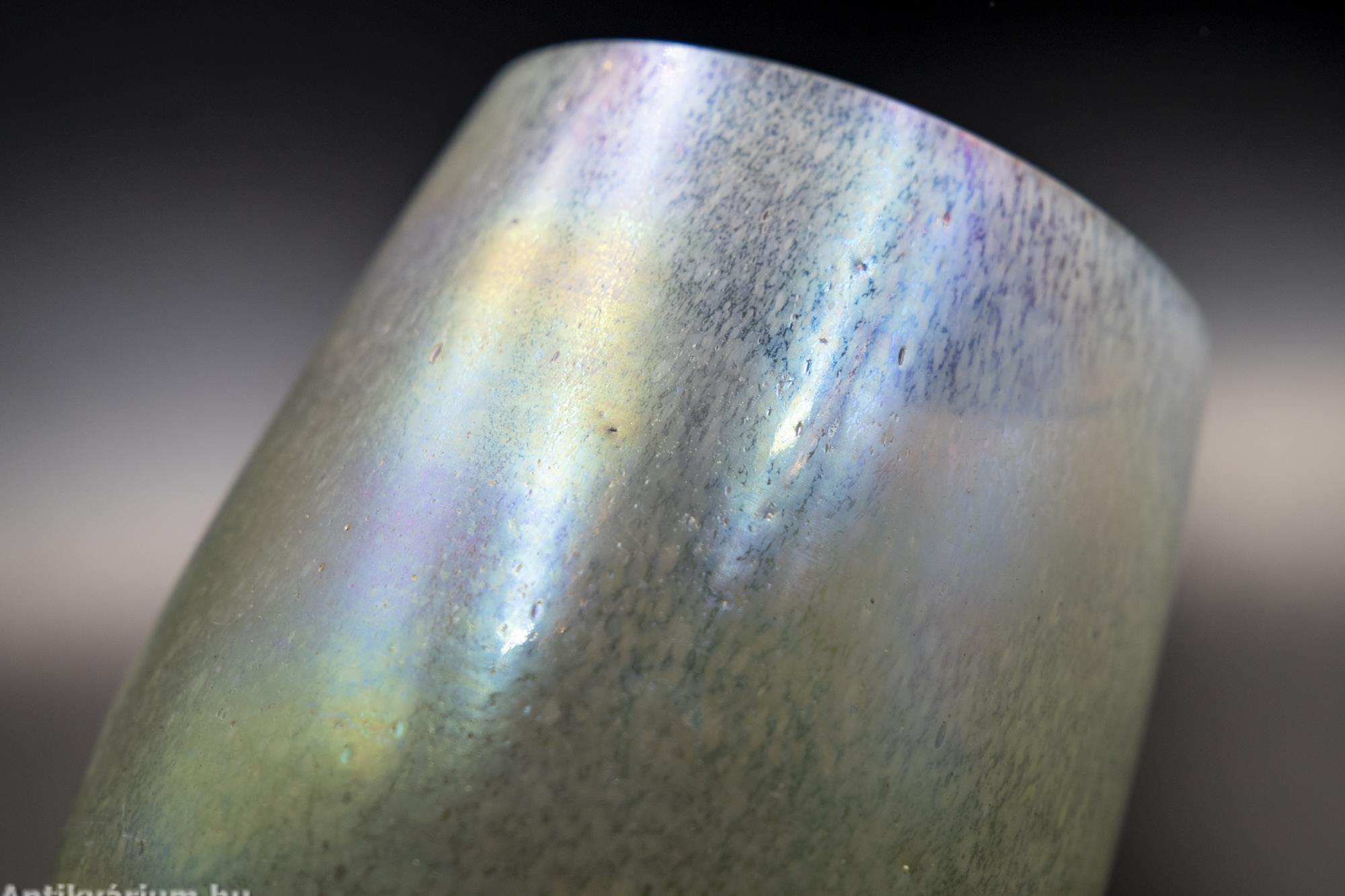 Hibátlan állapotú, fújt és kézzel formázott, lüszteres Loetz üveg váza a 20. század elejéről. Formája tagolatlan, felülete papillon mintával (pillangó hatású foltok) és lüszterezett réteggel díszített. A papillon minta az egyik legismertebb Loetz dekor, megjelenhet kobaltkék, opál, narancs, sárga vagy rubinvörös színben, ezüstös-sárga (olajfoltos) szemcsékkel tarkítva. Letisztult, a felületi szín és fényhatásnak teret engedő formavilágot képviselő üveg váza.
