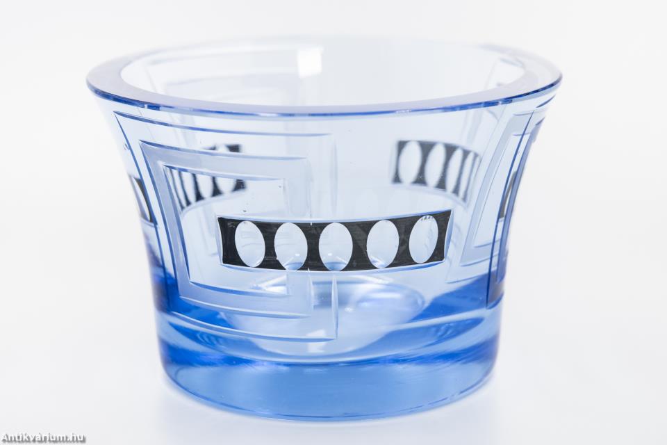 Hibátlan állapotú, fújt és kézzel formázott Moser art deco vízkék csiszolt kerek üveg váza a 20. század első feléből, tervezője Karl Palda. Üveg felületén a kor stílusának megfelelően geometrikus csiszolás látható, amelyet szintén geometrikus fekete kézi festett minta egészít ki. Talpa lapra csiszolt. A váza forradalmi újszerűségével, amelyet az új dekoratív művészeti stílus (art deco) megteremtett, a modernizmus első képviselői közé emelte. Karl Palda cégét 1888-ban alapították a csehszlovákiai Haidán, Nový Borban, mégis az 1930-as évek – és amit ma art deco korszaknak nevezünk – bizonyult virágkorának. Karl Palda a legstilizáltabb és leggeometrikusabb art deco dizájn szinonimája, és az 1930-as évek során minőségi dekanterkészletek, vázák, gyertyatartók, piperekészletek és parfümös üvegek csodálatos sorát gyártotta.