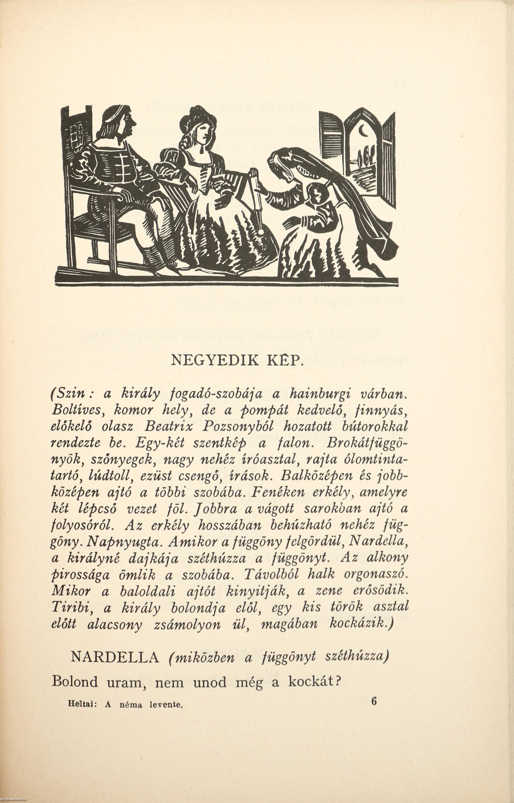 (Szín : Terem, Zilia moncalieri-i palotájának az emeletén. Fenéken nehéz tölgyfaajtó a főbejárás. Ugyanilyen ajtó jobbra. Balfenéken a vágott sarokban három lépcső visz a tágas, csukott loggiára. Ennek a középső ablaka tárva van. Kis asztal, karosszék a loggiában. A szoba közepén nagy asztal, brokát-takaróval letakarva, székek, hatalmas láda balra a fal mellett. Erőteljes, egyszerű vascsilláry falikarok, gyertyák, amelyeket később meggyújtanak, a szobát egyelőre csak a búcsúzó nap piros fényjátéka világítja meg. Az Úr 1479-ik évében vagyunk, de a terem berendezése régibb, a század közepéről való, egy kicsit rideg, sót komor. A falon némely szentképek között Orlandónak, Zilia elhúnyt férjének a képmása. Minden azt mutatja, hogy itt komoly, erkölcsös és ájtatos vagy legalább is szenteskedő asszony lakik.