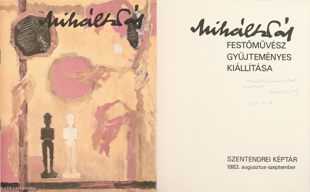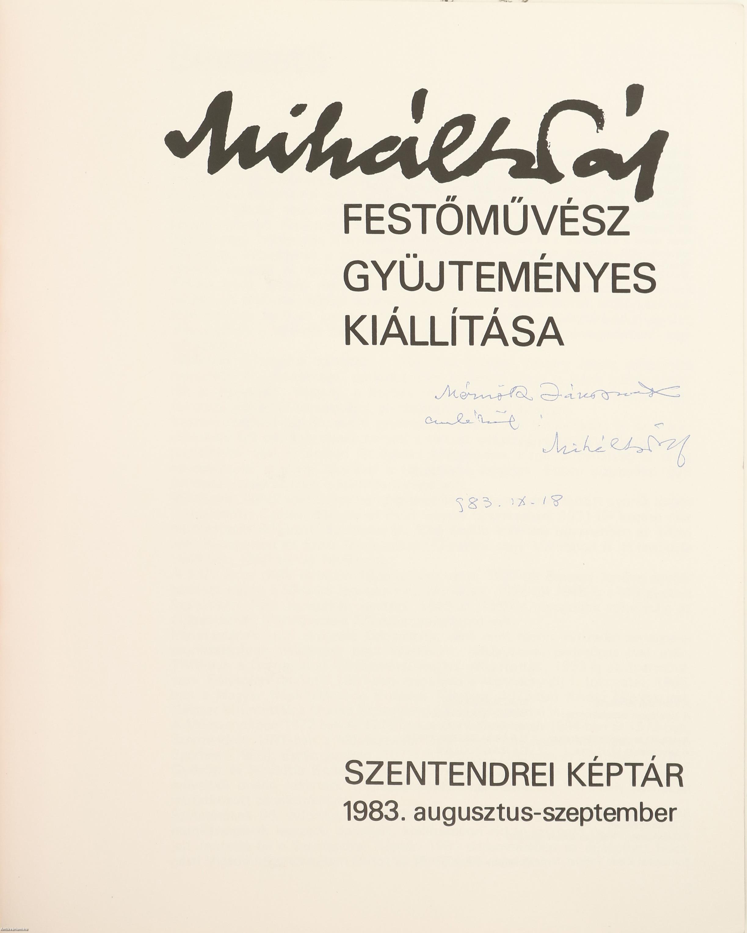 Miháltz Pál festőművész által dedikált példány. Miháltz Pál festőművész gyűjteményes kiállítása. Szentendrei Képtár, 1983. augusztus-szeptember. [kiállítási katalógus] Összeállította: Mucsi András és M. Várhelyi Vanda.