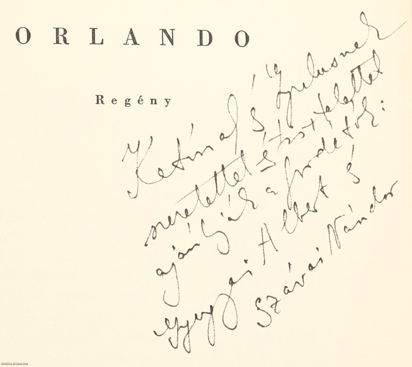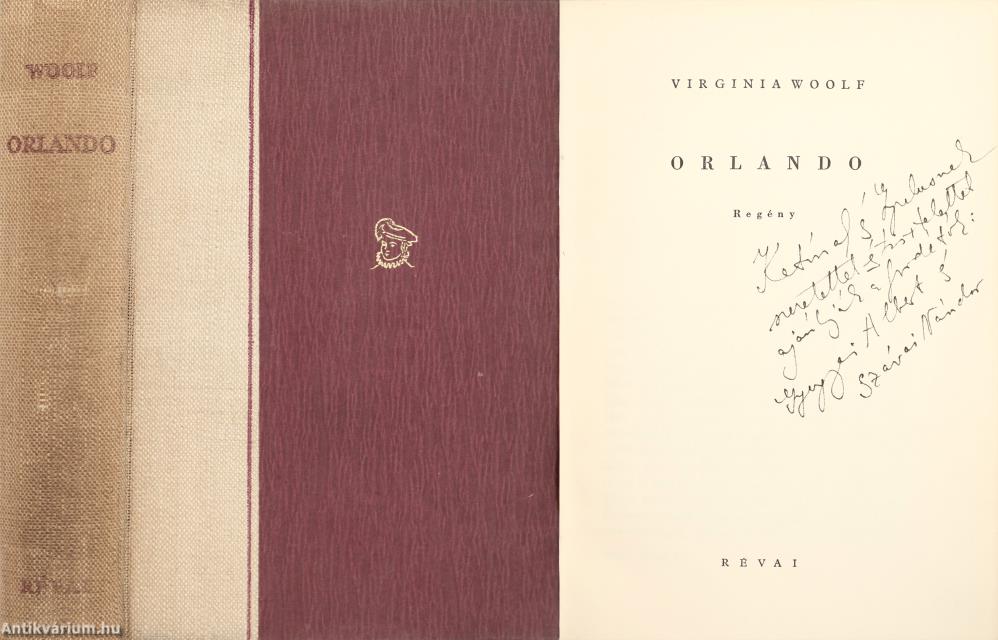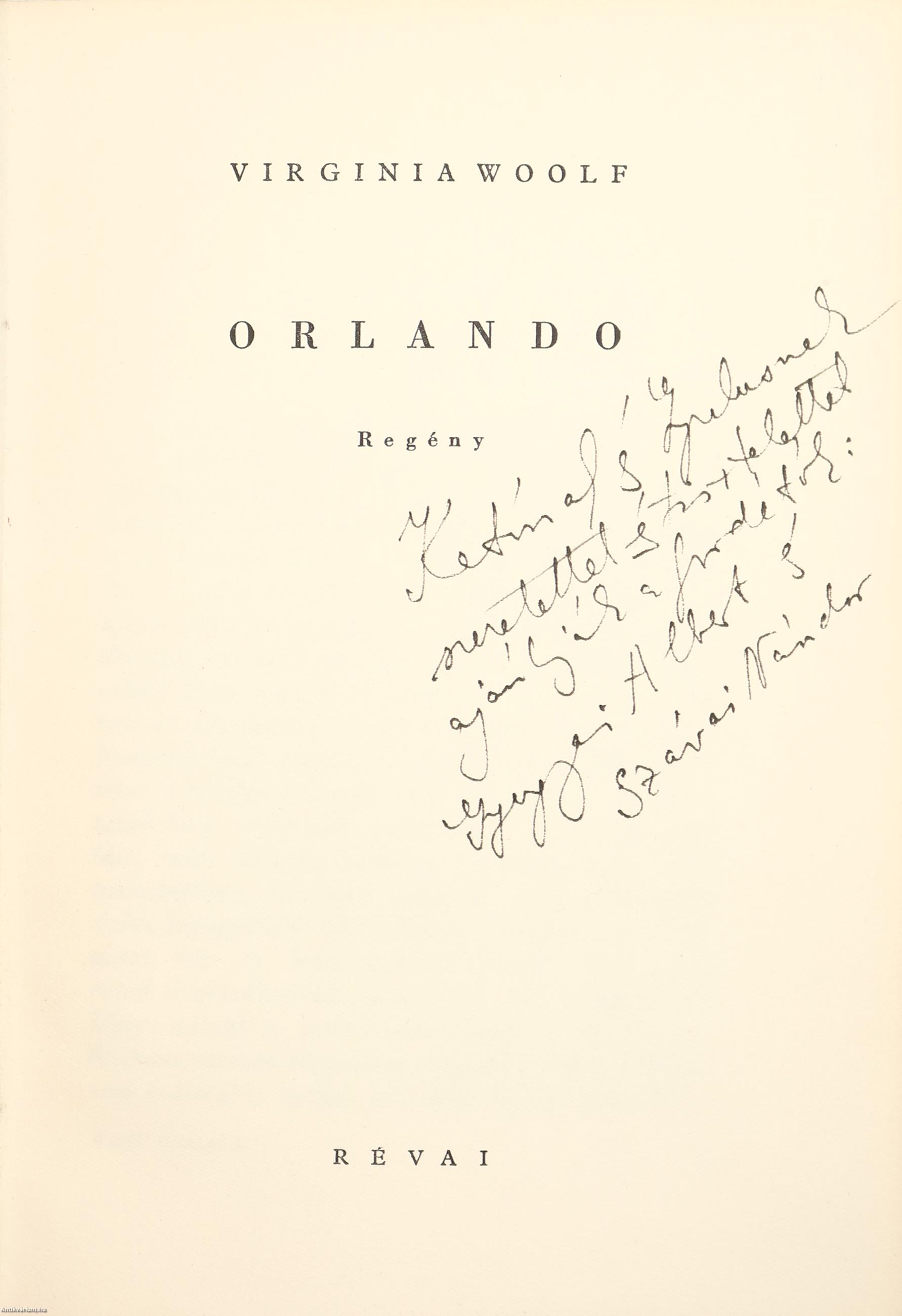 Fordítók által dedikált példány.Első magyar nyelvű kiadás. Orlando. Regény. Írta: Virginia Woolf. Fordította: Gyergyai Albert és Szávai Nándor.