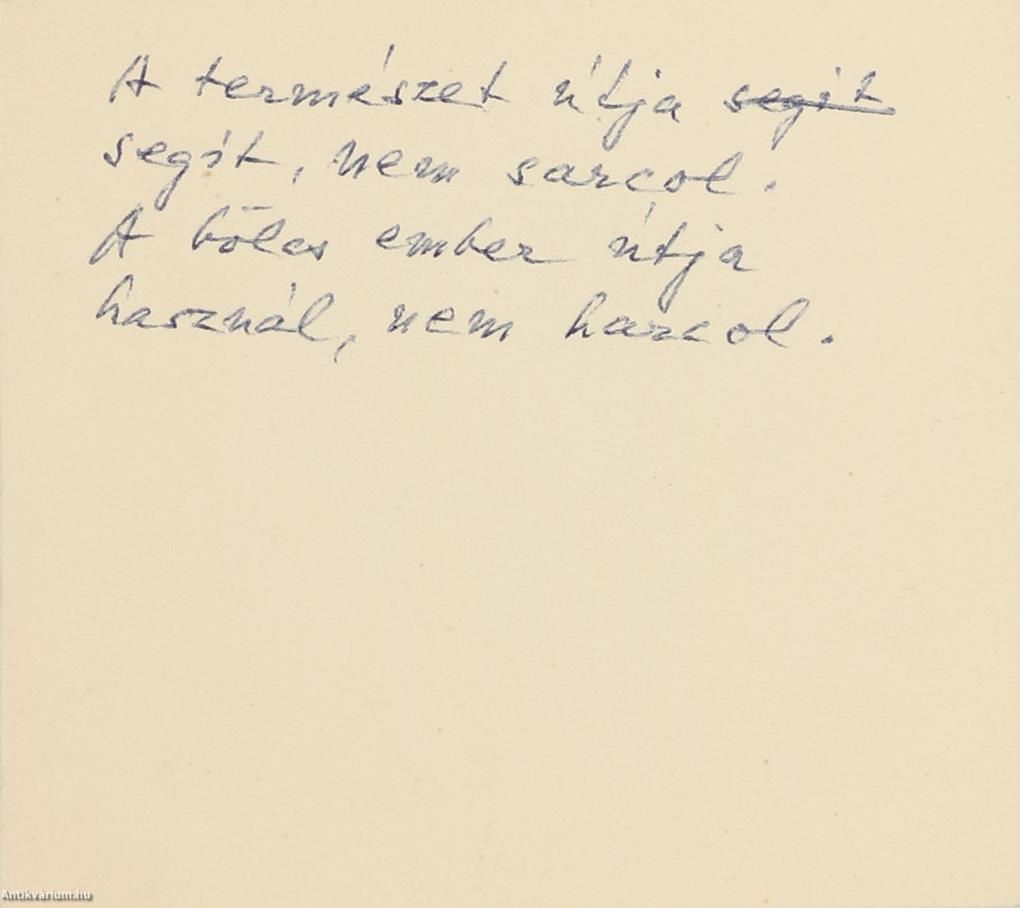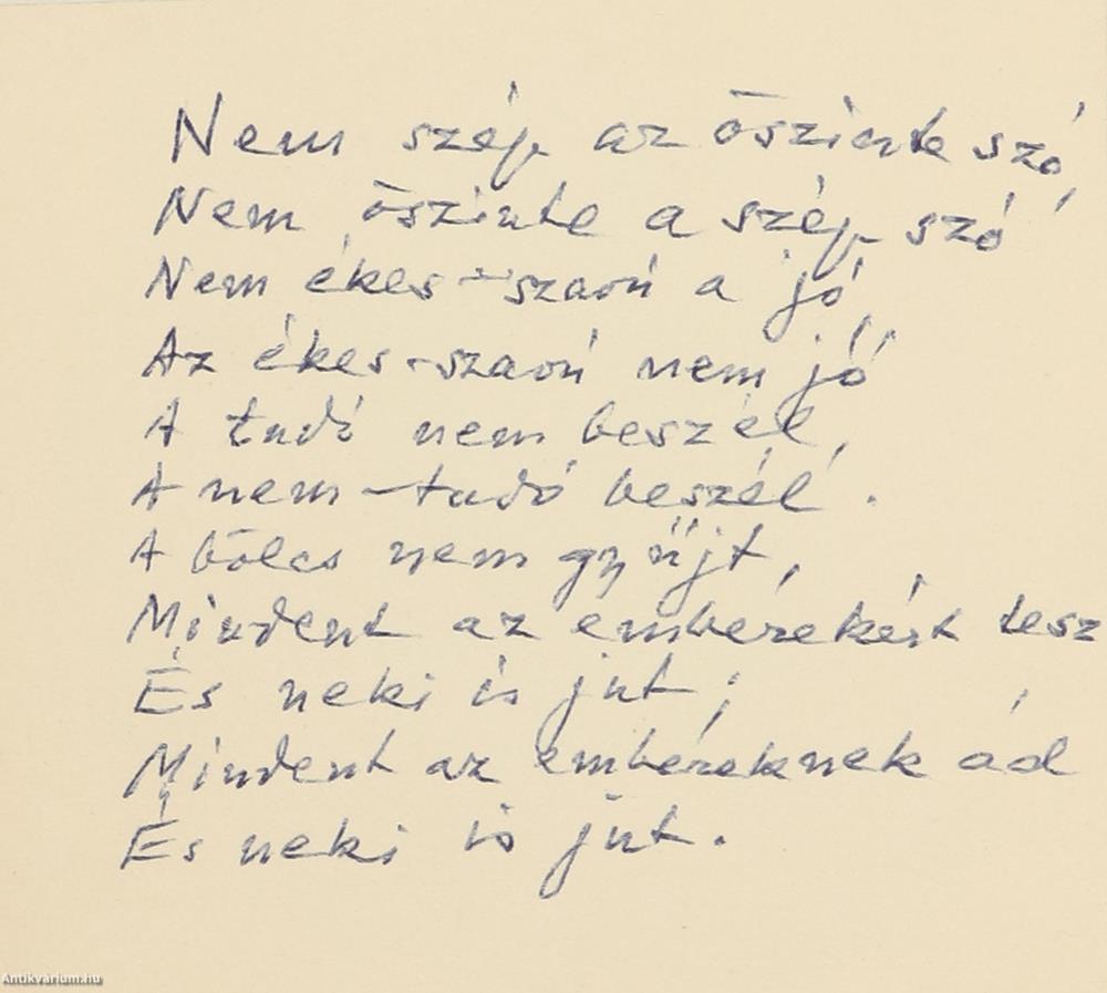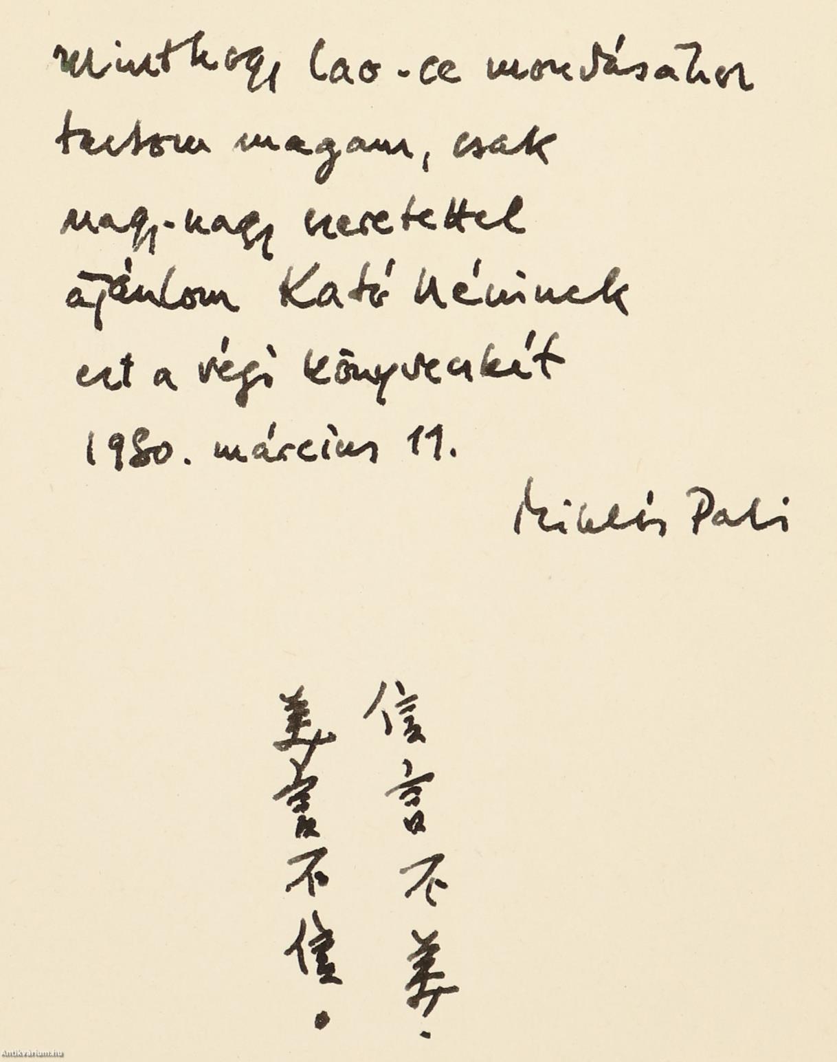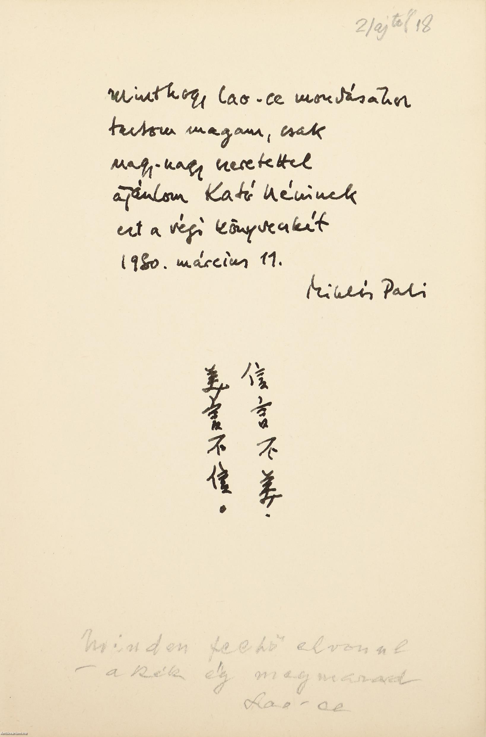 Az első előzéklapon a szerző, Miklós Pál tollal beírt, névre szóló, kínai nyelvű szövegrésszel és egy ceruzával írt idézettel kiegészített dedikációja olvasható: "Minthogy Lao-ce mondásához tartom magam, csak nagy-nagy szeretettel ajánlom Kató néninek ezt a régi könyvecskét 1980. március 11. Miklós Pali