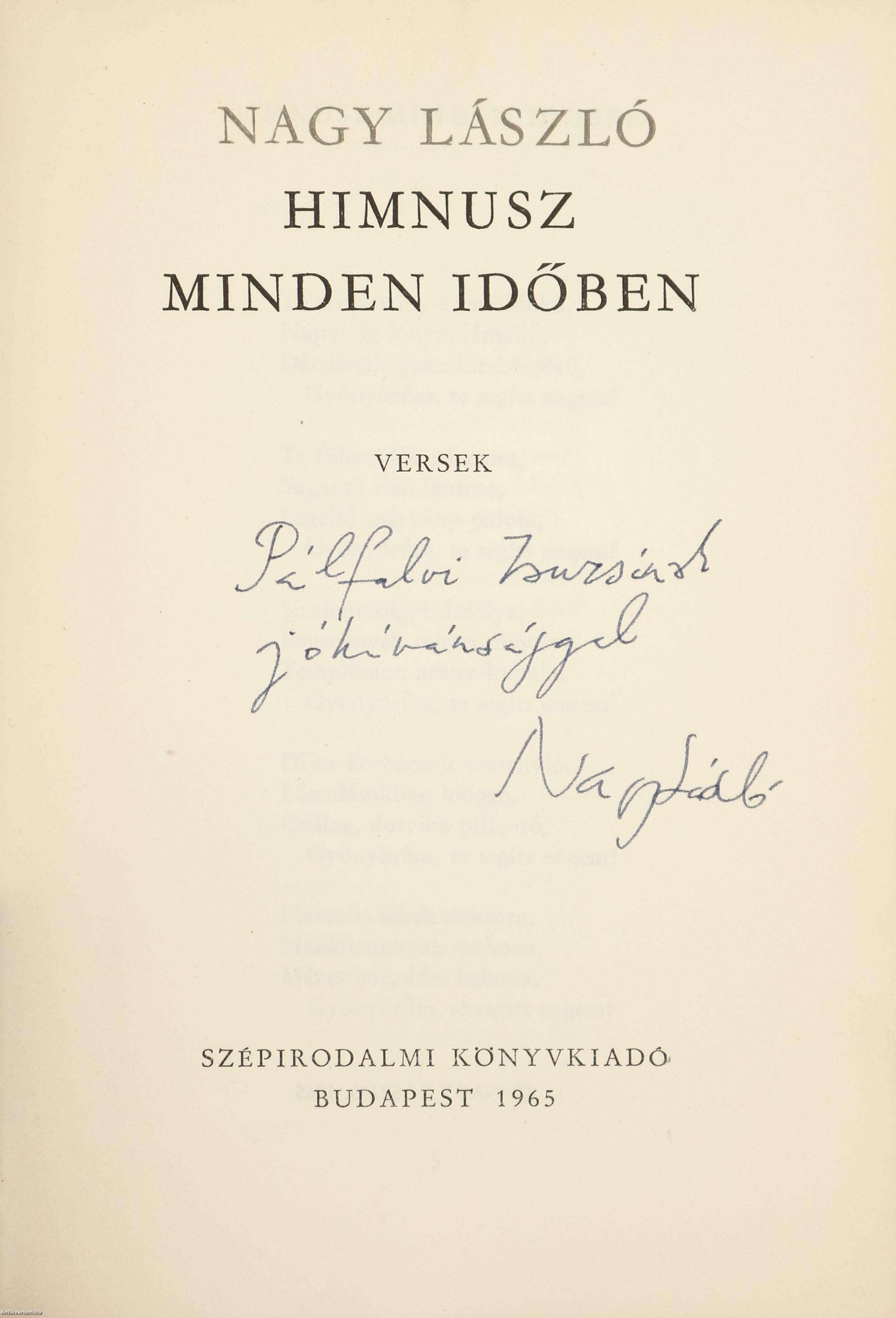 Szerző által dedikált példány. Első kiadás. Himnusz minden időben. Versek. Írta: Nagy László.