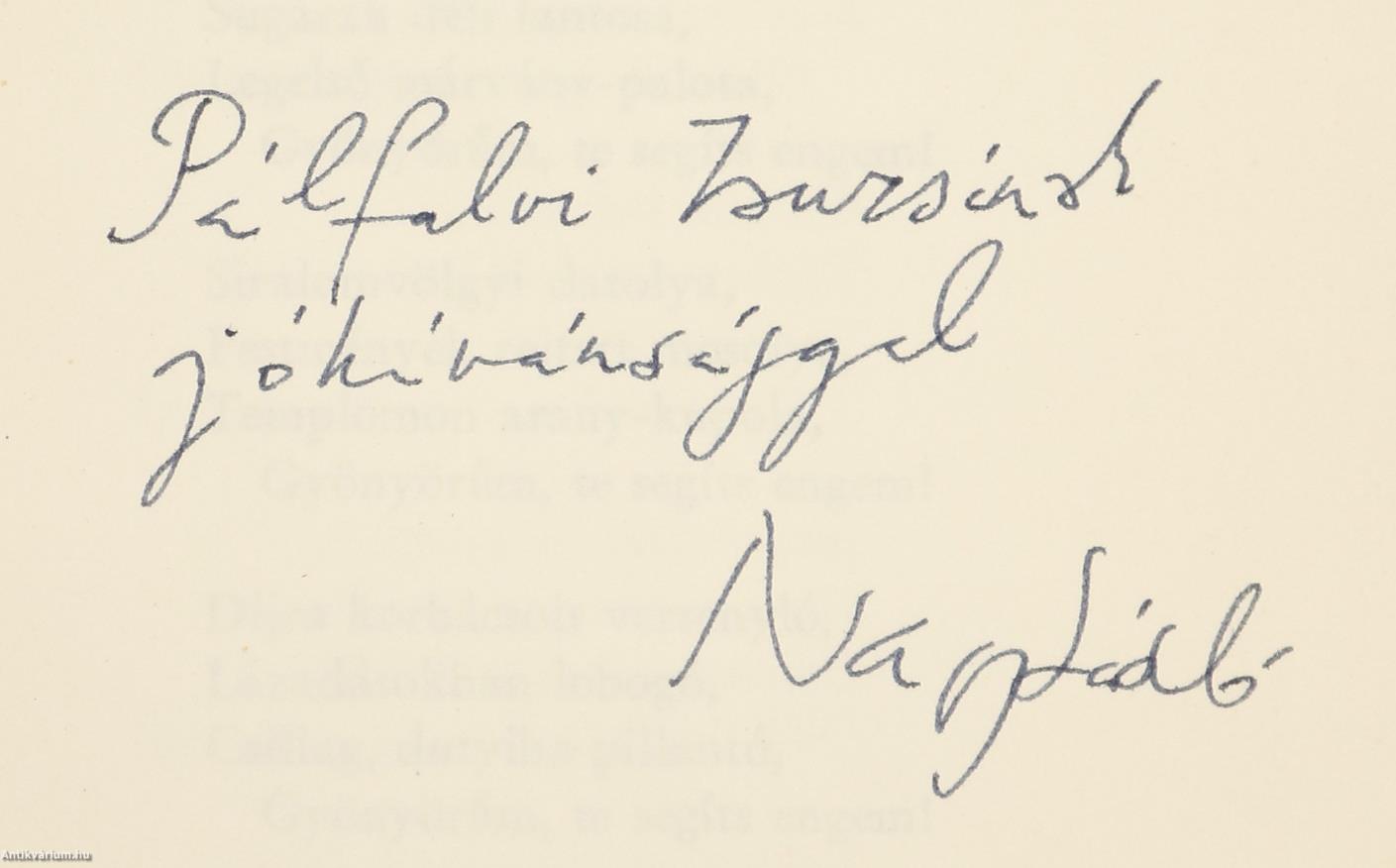 A címlapon a szerző, Nagy László tollal beírt, névre szóló dedikációja olvasható: "P. Zs.-nak jókívánsággal Nagy László"