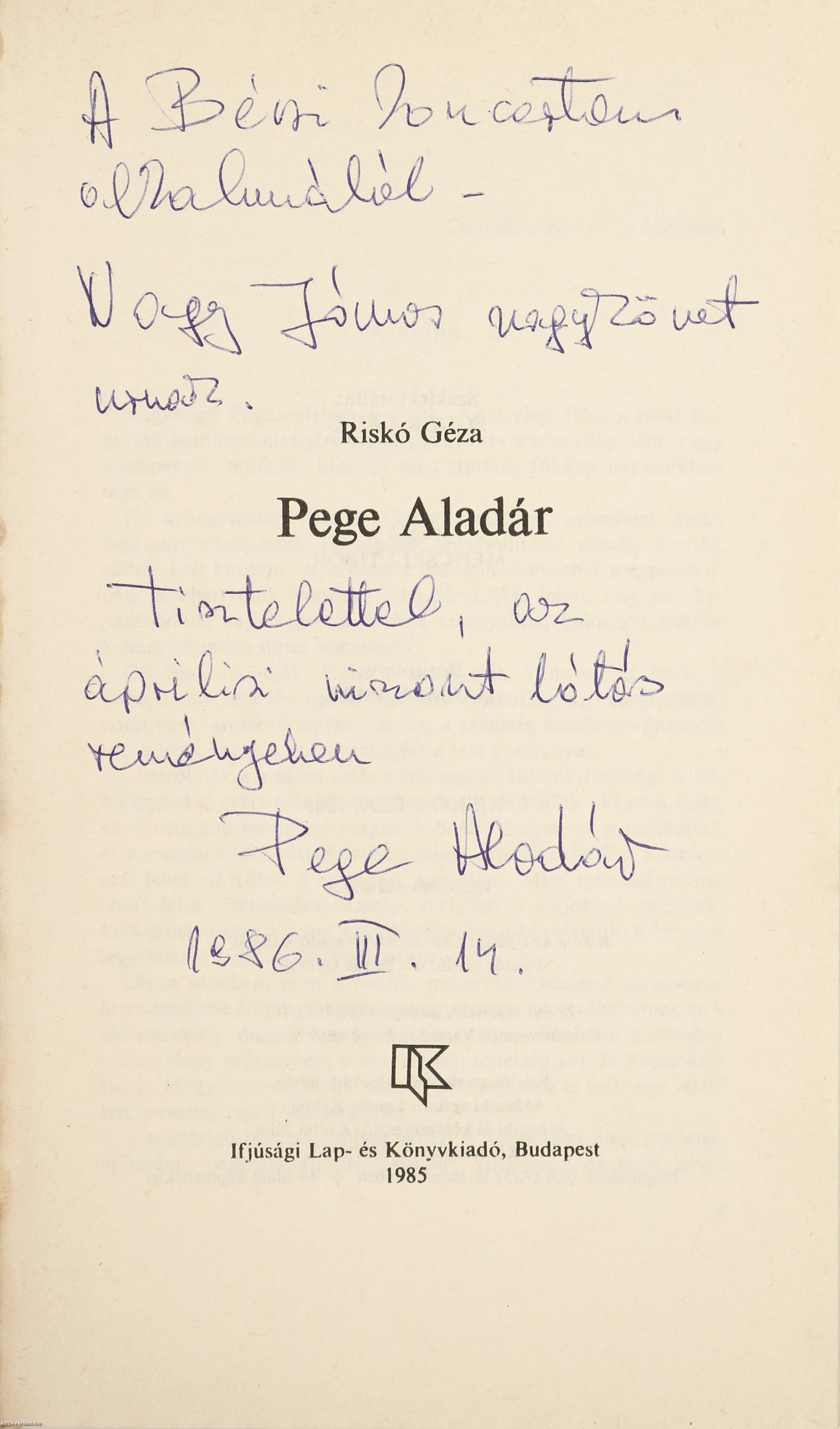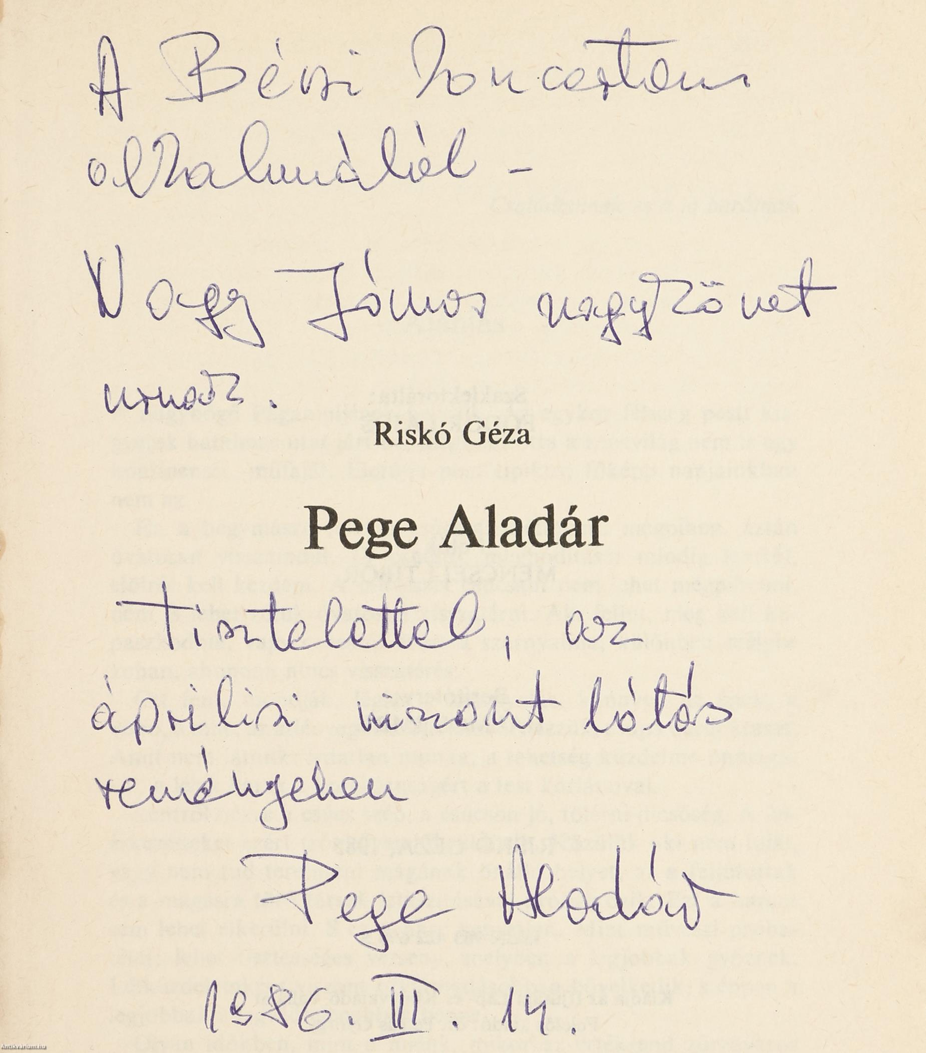 Pege Aladár által dedikált példány.Első kiadás. Pege Aladár. Írta: Riskó Géza.
