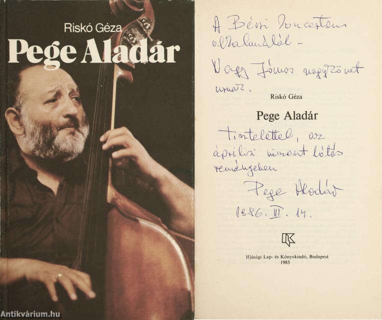 A kötet dedikálója Pege Aladár (Budapest, 1939. október 8. – Budapest, 2006. szeptember 23.) Kossuth- és Liszt Ferenc-díjas bőgőművész, zeneszerző, a magyar dzsessz kiemelkedő alakja, "a nagybőgő Paganinije." Neves kispesti nagybőgős családból származott. Az '50-es évek végén Montag Lajos növendéke volt a Bartók Béla Szakiskolában, majd Tibay Zoltánnál tanult a Zeneakadémián. 1978-tól a Zeneakadémia docense volt. Nemzetközi bemutatkozása 1963-ban a Bled városban megrendezett dzsesszfesztiválon történt, egy évvel később pedig megalapította saját zenekarát. Egyszerre játszott klasszikus zenét és dzsesszt, ami egyedi színt adott zenéjének. 1964-ben díjat nyert Prágában, 1970-ben Montreux-ben. Fellépett többek között a New York-i Carnegie Hallban Herbie Hancock együttesének vendégszólistájaként is, ekkor kapta meg a világ legjobb nagybőgősének tartott Charles Mingus hangszerét ajándékba a művész özvegyétől.
