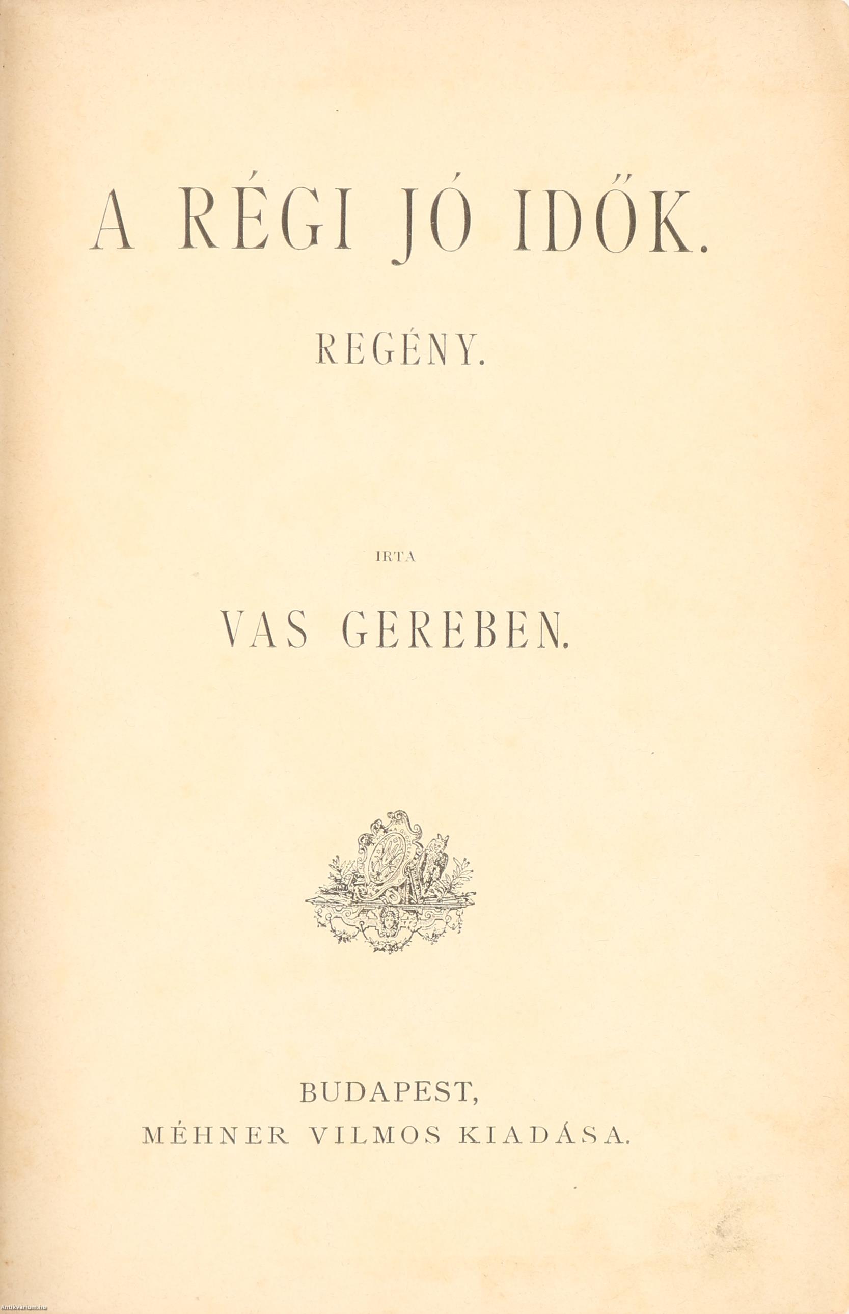 I. kötet: A régi jó idők. Bp., é. n., Méhner Vilmos, [1] t. + 518 p. + XVI p., ill. Címlapképen a szerző fekete-fehér, hártyapapírral védett portréjával, valamint kötetvégen Radákovits József Vas Gereben életéről szóló írásával.