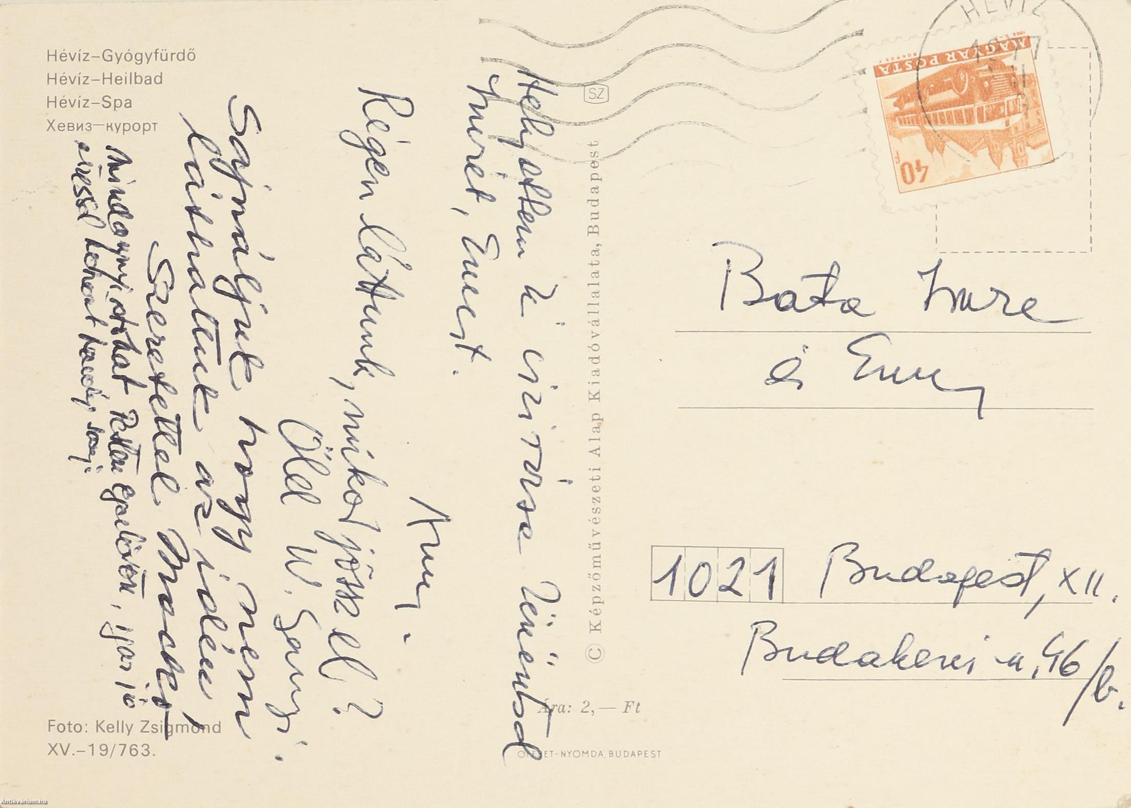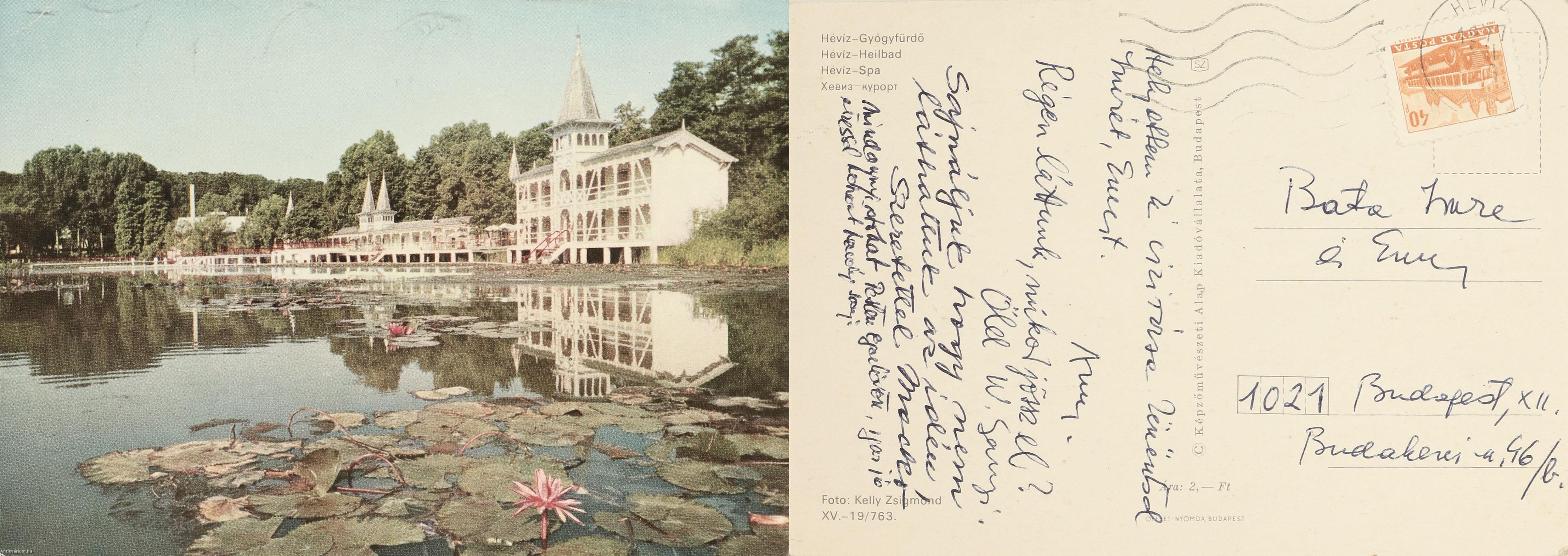 1977-es postai bélyegzéssel és felragasztott bélyeggel ellátott, képes oldalán a hévízi gyógyfürdő színes fotójával illusztrált képeslap. A magánjellegű, közvetlen hangvételű üdvözlő sorokat tartalmazó lapot Weöres Sándor, Károlyi Amy és további két ismeretlen személy írta alá.