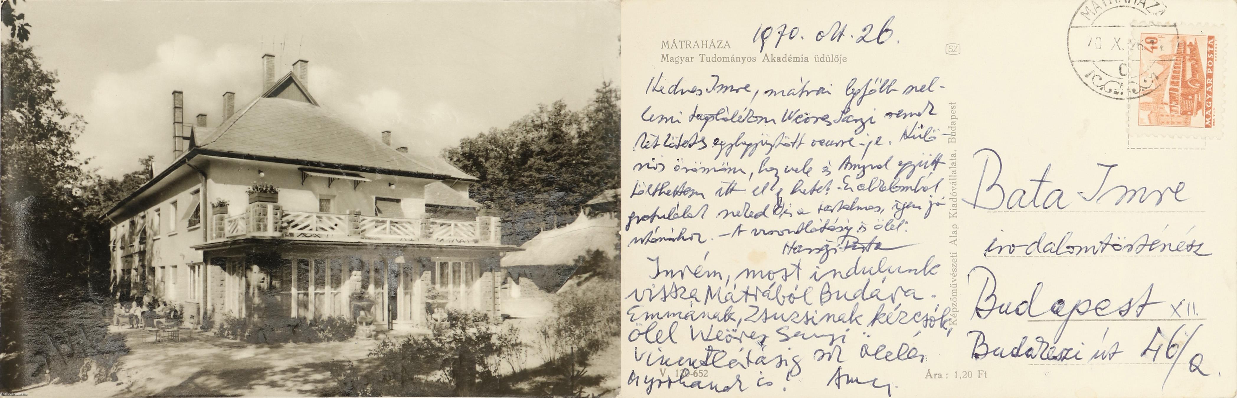 1970. október 26-ra datált, postai bélyegzéssel és felragasztott bélyeggel ellátott, képes oldalán az MTA mátraházi üdülőjének fekete-fehér fotójával illusztrált képeslap. A magánjellegű, közvetlen hangvételű üdvözlő sorokat tartalmazó lapot Weöres Sándor, Károlyi Amy és további egy ismeretlen személy írta alá.