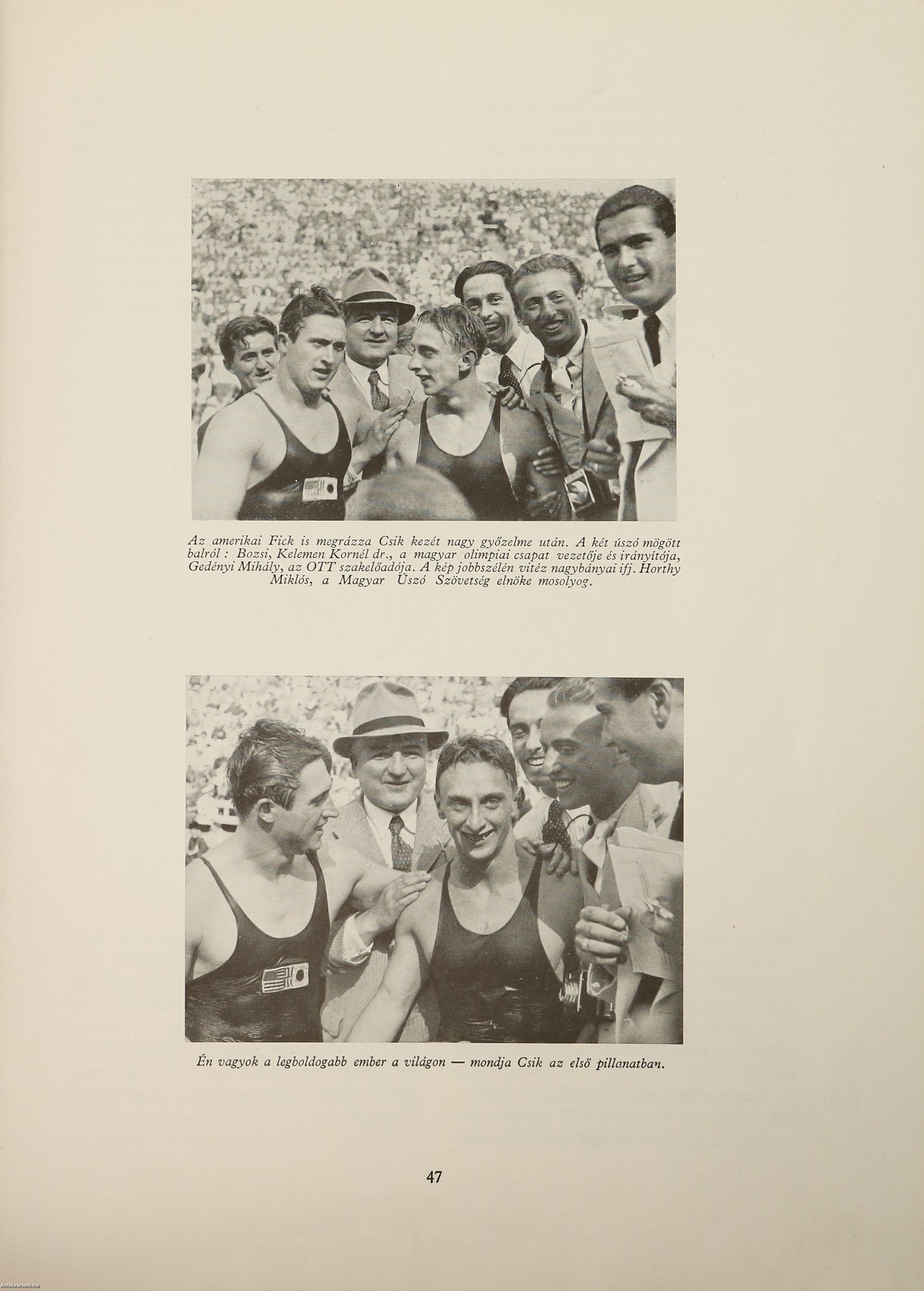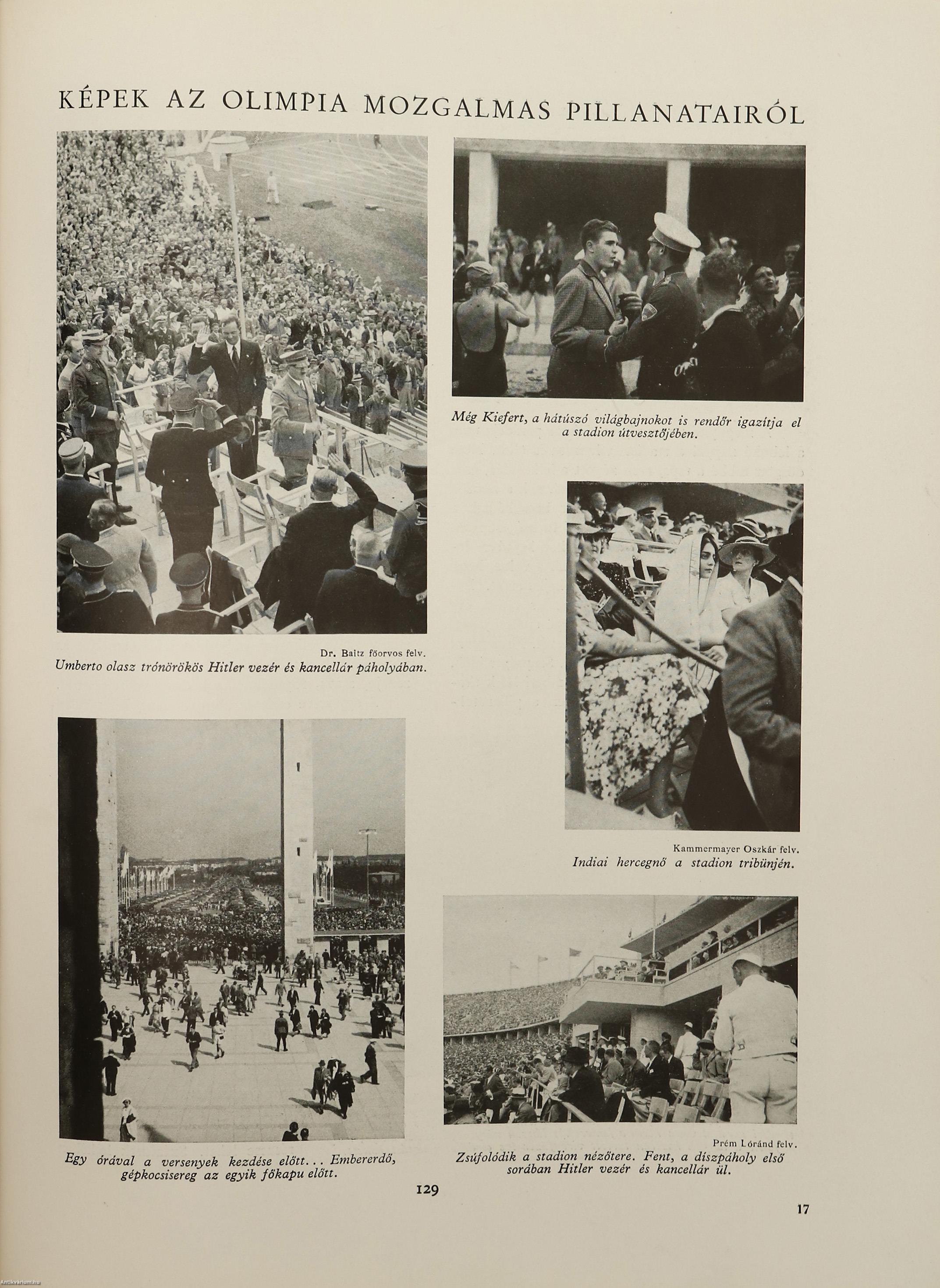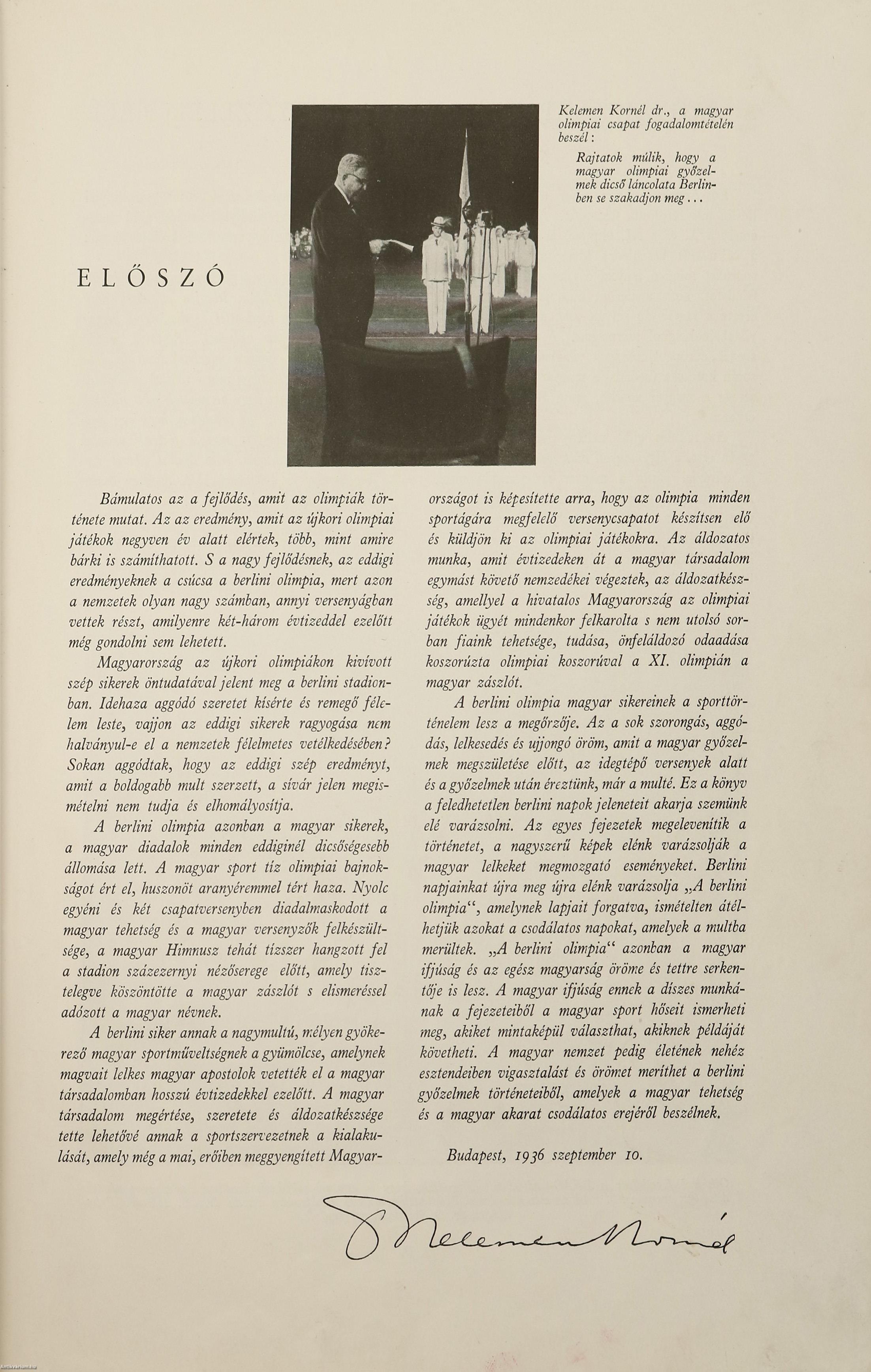 400 szövegközti, fekete-fehér képpel illusztrált, valamint Dr. Kelemen Kornél az O.T.T. elnökének előszavával, az újkori olimpiai játékok eredménytáblázatával és részletes tartalomjegyzékkel kiegészített kiadás. Nyomtatta a "Berlini Olimpia" Szerkesztőbizottsága.