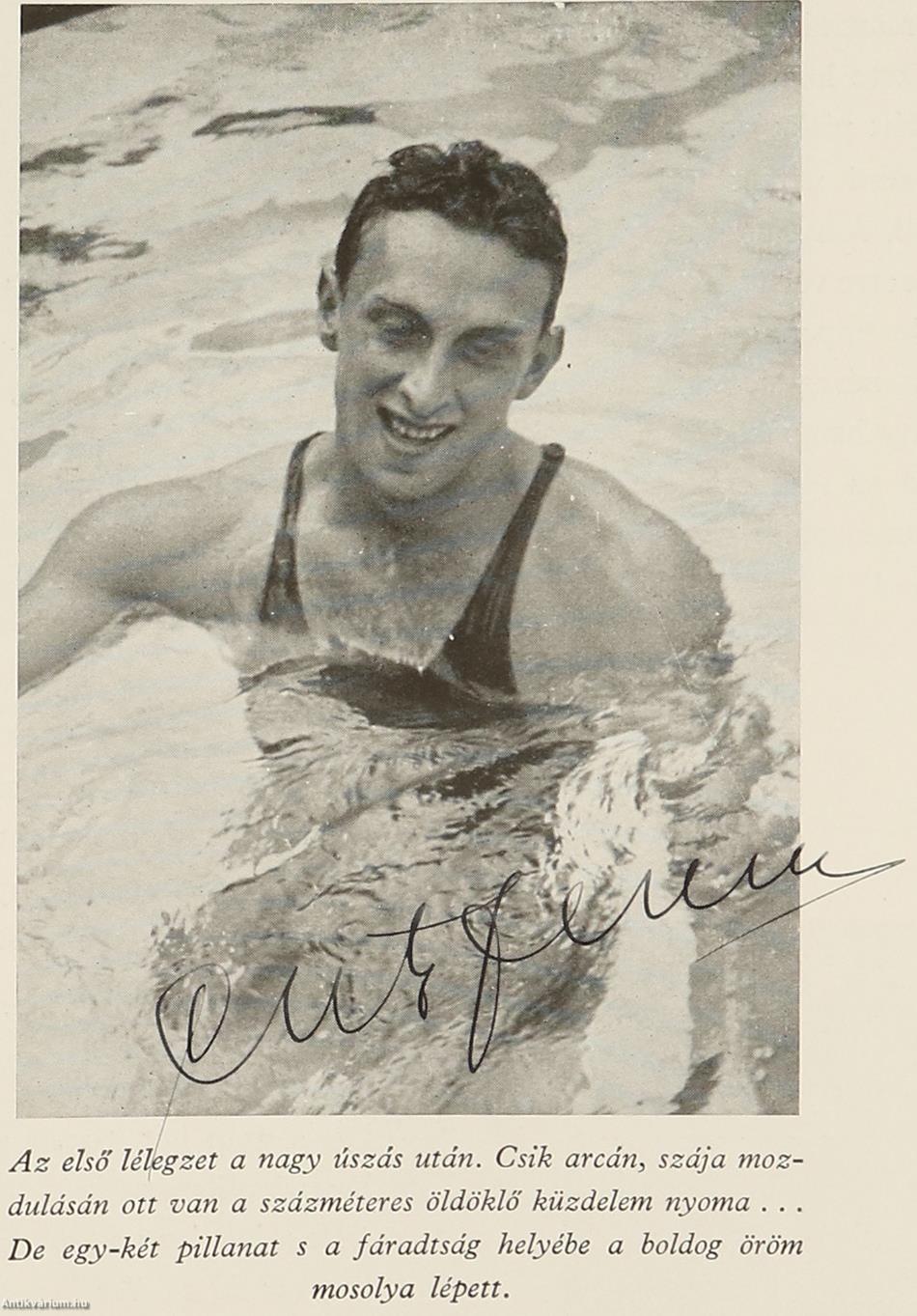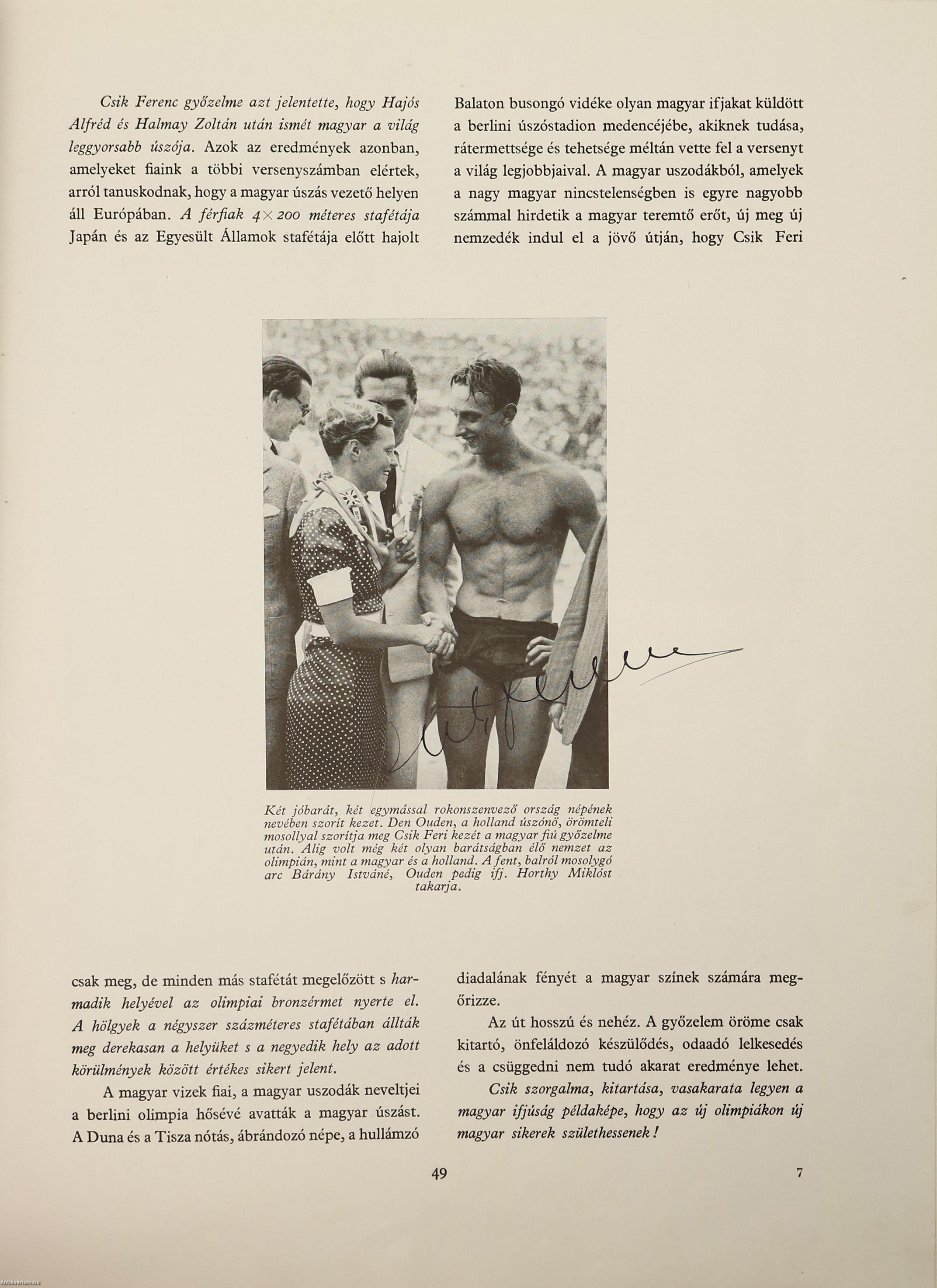 A címlap hátoldalán a svéd vízipóló és úszó csapat tagjainak (Kassa, 1937), svéd nyelvű, nehzen olvasható dedikációja látható, melyet többek között aláírt: