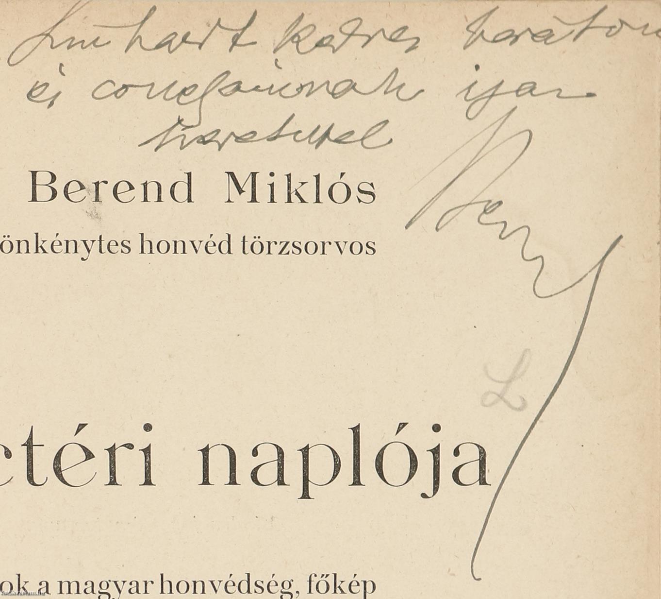 Szerző által dedikált példány. Dr. Berend Miklós hadi önkénytes honvéd törzsorvos harctéri naplója. Adatok a magyar honvédség, főkép az 5. h. huszárezred történetéből.