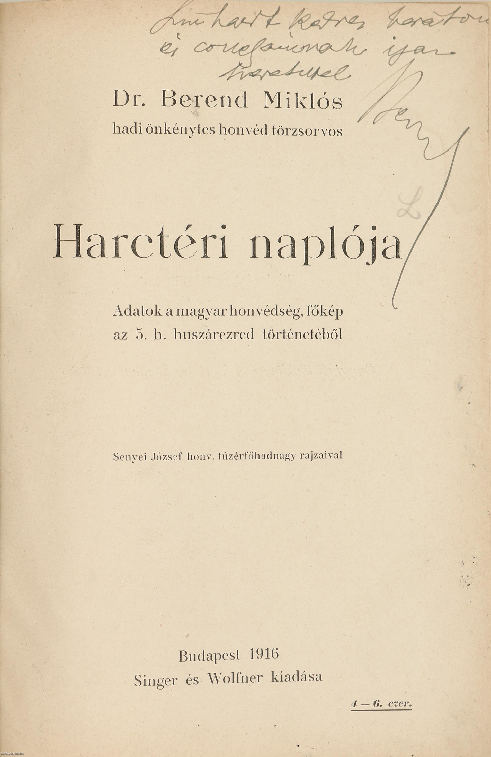 Dr. Berend Miklós hadi önkénytes honvéd törzsorvos harctéri naplója (dedikált példány) (Senyei József rajzaival.)