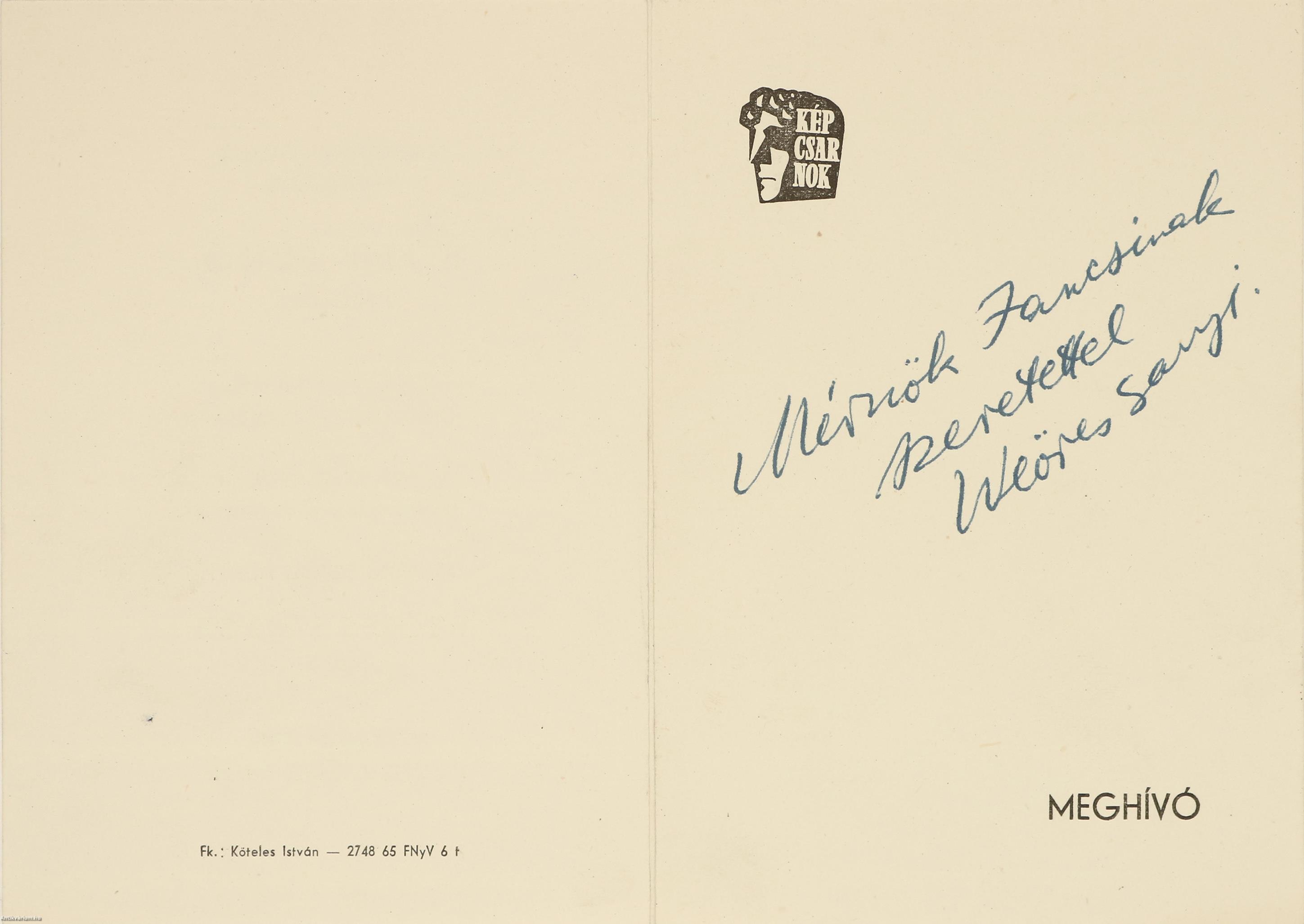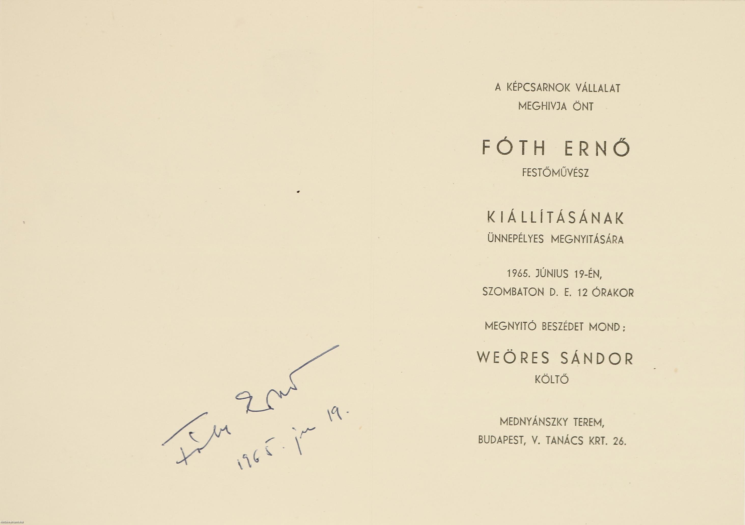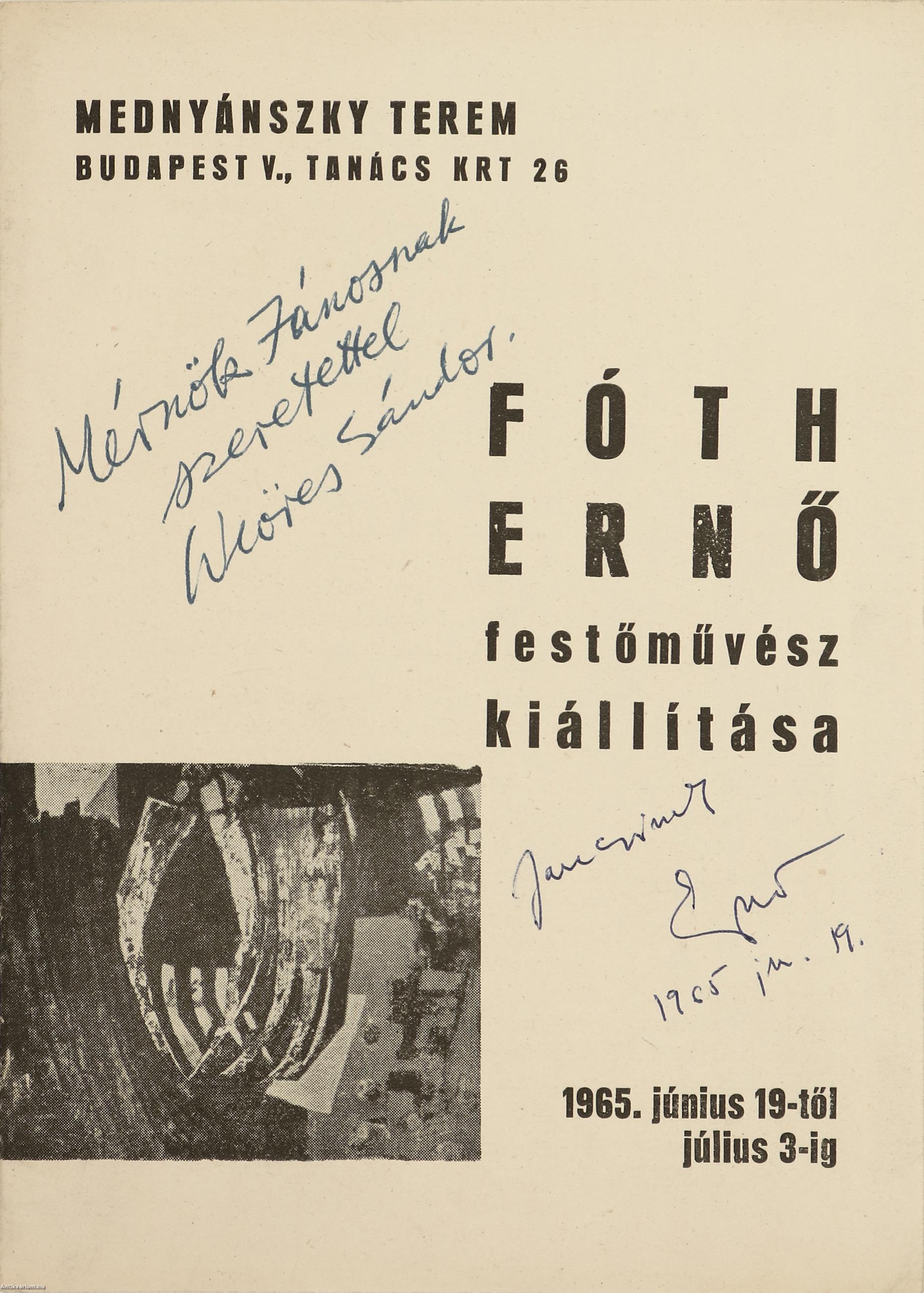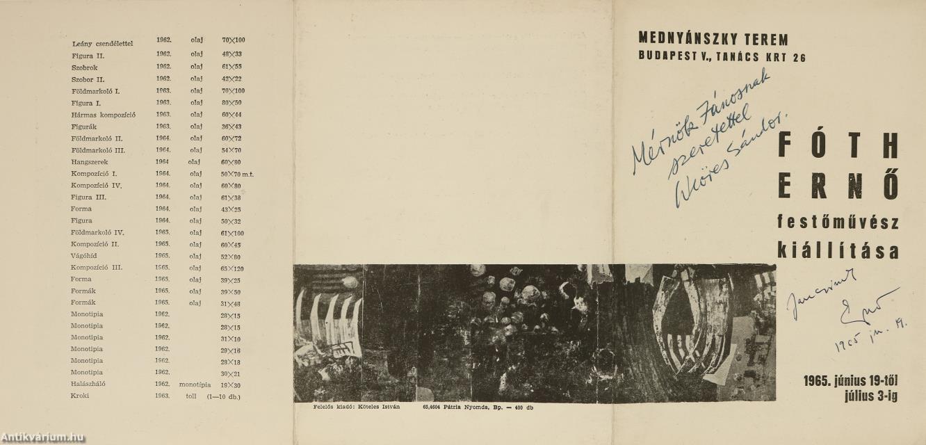Fóth Ernő és Weöres Sándor által dedikált, valamint egy a költő által dedikált és a festőművész által aláírt melléklettel ellátott példány. Fóth Ernő festőművész kiállítása. Mednyánszky Terem. Budapest V., Tanács krt. 26. 1965. június 19-től július 3-ig.
