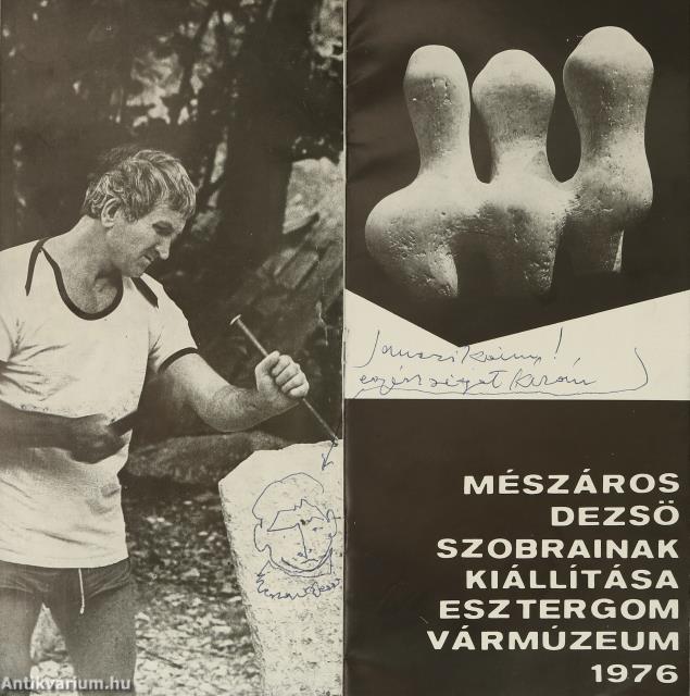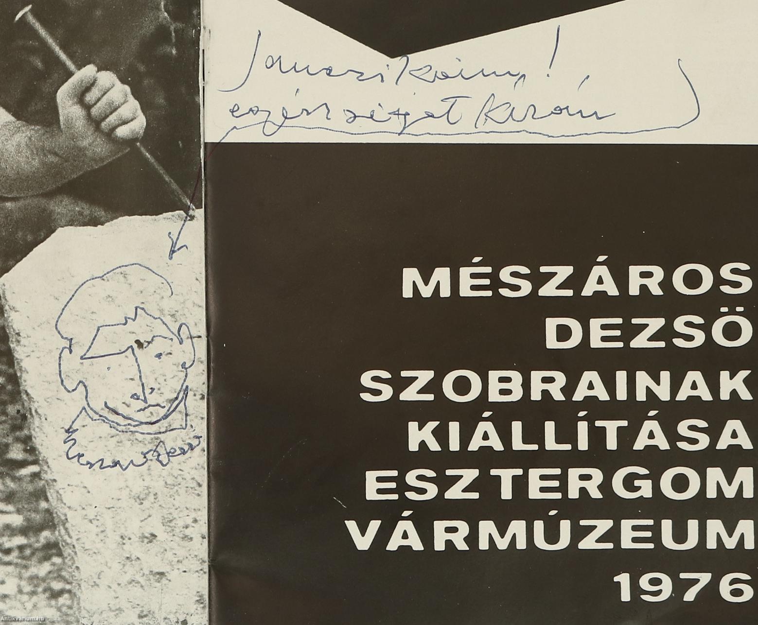 Mészáros Dezső szobrászművész által dedikált példány. Az Esztergomi Vármúzeum Képzőművészeti Kiállításai. Mészáros Dezső szobrászművész kiállítása. Esztergom, Vármúzeum, 1976. A címlapon Mészáros Dezső szobrászművész tollal írt, egyedi illusztrációval ellátott dedikációja olvasható: "J.! egészséget kíván". Számos fekete-fehér képpel illusztrált, valamint a művész életrajzával és a kiállításainak jegyzékével kiegészített kiállítási katalógus. A kiállítást rendezte: Horváth Béla és Horváth Ferenc. Katalógusterv: Horváth Ferenc. Fotó: Szabó József. Készült az M. H. - Nyomdában, Zalaegerszegen. Kiadói tűzött papírkötésben lévő példány, feliratos, illusztrált címfedéllel, feliratozatlan, könyvgerinccel és hátlappal, hiánytalan, jó állapotban. Mészáros Dezső (1923-2003) szobrászművész. A Magyar Képzőművészeti Főiskolán tanult, ahol Beck András, Kisfaludi Strobl Zsigmond és Pátzay Pál voltak a mesterei. 1970-ig Budapesten, 1971-től haláláig Visegrádon, az Áprily-völgyben élt és dolgozott. Mészáros Dezső korai érzékeny, karakteres portrészobrok, realista munkásábrázolások után, érett korszakában a figuralitás és a nonfiguráció határán álló, nagy méretű kőszobrokat farag, amik szellemiségükben talán a kora-görög kykladikus idolokhoz állnak a legközelebb. Művészetében óriási fordulatot hozott az 1967-es római ösztöndíj. Művészete ekkor fordult az ábrázolás-konvenciótól a jelentéstartalommal áthatott tömegformálás és a különleges téralakítás felé. A Szentendrei Grafikai Műhely tagja volt.
