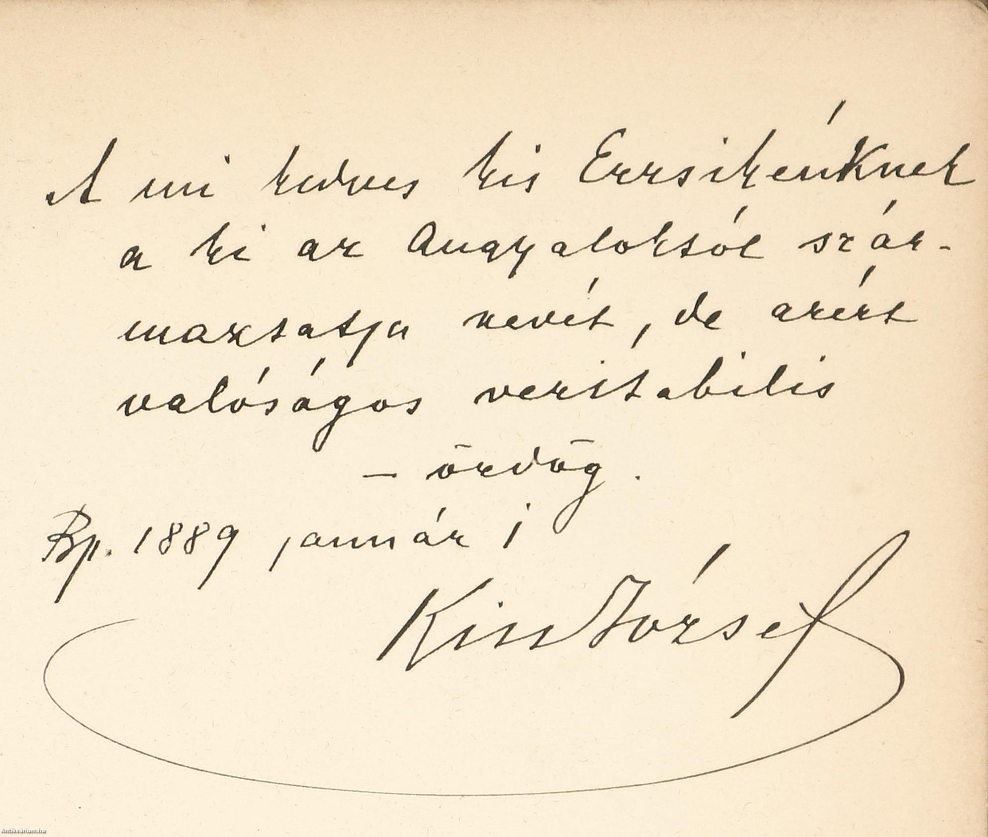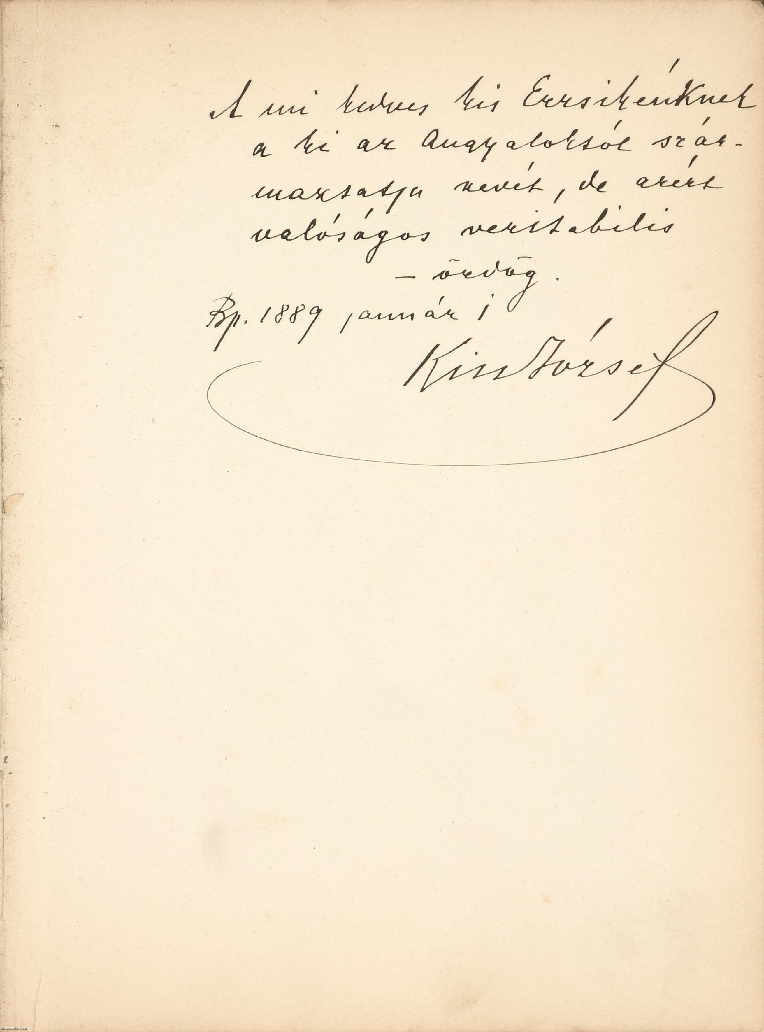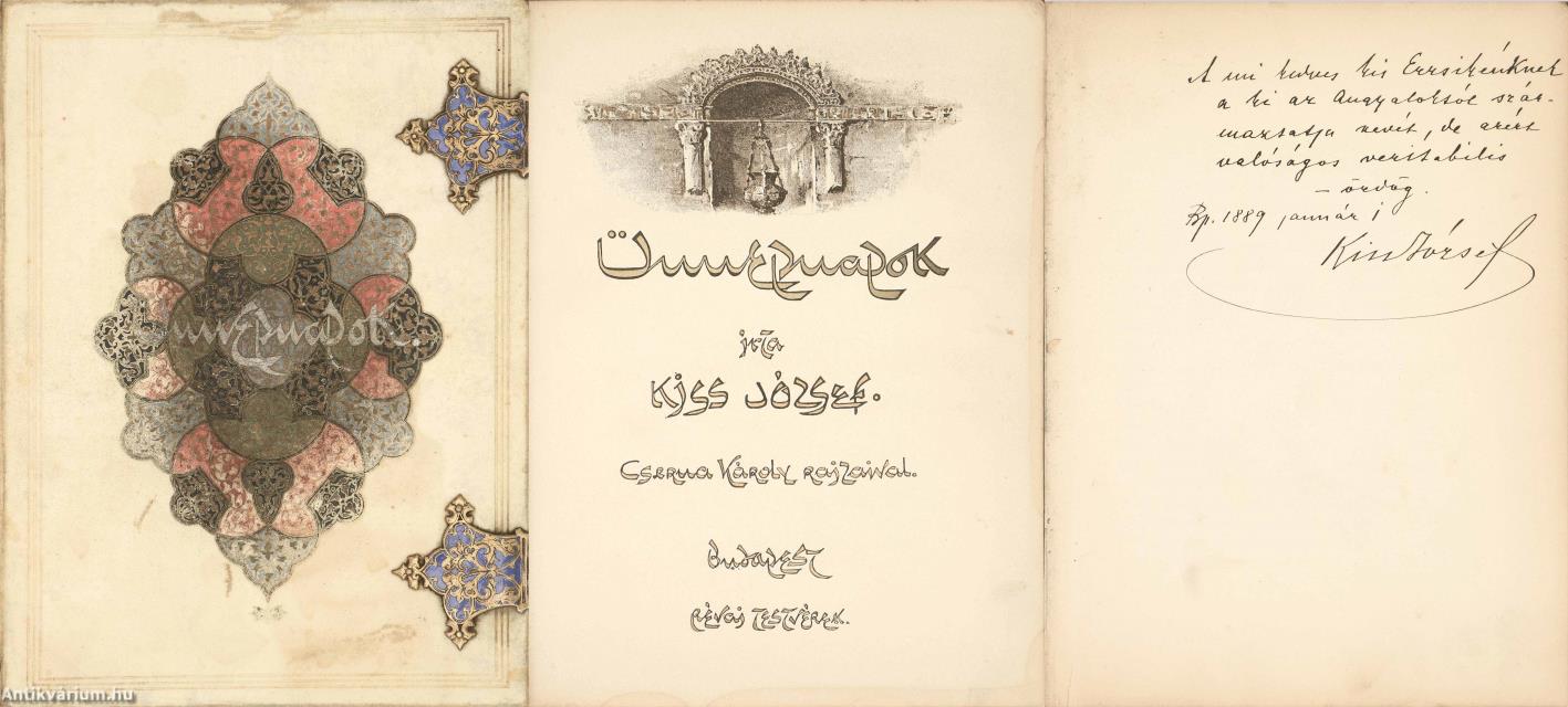 Szerző által dedikált példány. Első kiadás. Ünnepnapok. Írta: Kiss József. Az előlapon a szerző, Kiss József tollal beírt, névre szóló dedikációja olvasható: "A mi kedves kis Erzsikénknek a ki az angyaloktól származtatja nevét, de azért valóságos veritabilis - ördög. Bp. 1889 január 1. Kiss József". Néhány szövegközti, fekete-fehér, hártyapapírral védett képpel és könyvdíszekkel illusztrált, valamint ajánlással ellátott kötet. A rajzokat Cserna Károly készítette. Nyomtatta a Franklin-Társulat Nyomdája. Kiadói pergamen kötésben lévő példány, feliratozott, színes illusztrációval és két rézcsattal ellátott címfedéllel, feliratozott, színes illusztrációval ellátott, sérült könyvgerinccel, sínes, növénymotívumokkal díszített, kiadói előzéklapokkal, néhány foltos lappal, színezett lapélekkel, feliratozatlan, színes illusztrációval és két réz zárócsattal (az egyik csat hiányos) ellátott, foltos hátlappal. Kiss József kifinomult, érzékeny vallásos lírája a zsidó gyökerekkel rendelkező magyar líra-irodalom meghatározó dokumentumai közé tartozik. Jelen kötetben a régi zsoltár-eszméket modern foglalatban, egyéni színekkel, sajátos emóciókkal szőtte át. Habár konkrét dogmatikus észrevételek merültek fel a kötet megszületésekor, a szerző a kívánt változásokat nem teljesítette, inkább lemondott a kitűzött jutalomról. Helyette maga adta ki vallásos énekeit Ünnepnapok címmel igényes, szép kivitelben.