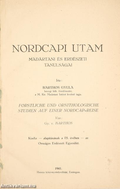 Első kiadás. Nordcapi utam madártani és erdészeti tanulságai. / Förstliche und ornithologische Studien auf einer Nordcap-Reise. Írta: Barthos Gyula hercegi hitb. főerdőmester, a M. Kir. Madártani Intézet levelező tagja. Szövegközti, fekete-fehér képekkel illusztrált, valamint bevezetéssel, az idézett művek jegyzékével és tartalomjegyzékkel kiegészített kötet. Az előzéklapon tollal írt ajándékozási bejegyzés látható. Nyomtatta a Hunnia Könyvvállalat, Esztergomban. Könyvkötői egészvászon kötésben lévő példány feliratozatlan címfedéllel, hátlappal és könyvgerinccel, mintás előzéklapokkal, néhány foltos lappal, hiánytalan állapotban. A kötet szerzője, Barthos Gyula (Nagykanizsa, 1883. június 30. – Nagykanizsa, 1971. február 27.) erdőmérnök, ornitológus. A Selmecbányai Bányászati és Erdészeti Akadémia elvégzése után a Retyezát-hegység erdeiben dolgozott. 1906-ban kinevezték a Kendeffy-uradalom erdészetének vezetőjévé, majd 1919-től Nagykanizsán uradalmi erdőmester lett. 1941-ben északi utazást tett és madártani megfigyeléseket végzett. 1945 után az Erdőgondnokság vezetőjeként munkálkodott nyugdíjba vonulásáig. Tagja volt a Madártani Intézetnek és az Országos Erdészeti Egyesületnek. Cikkei főleg az "Aquila" c. szakfolyóiratban jelentek meg.