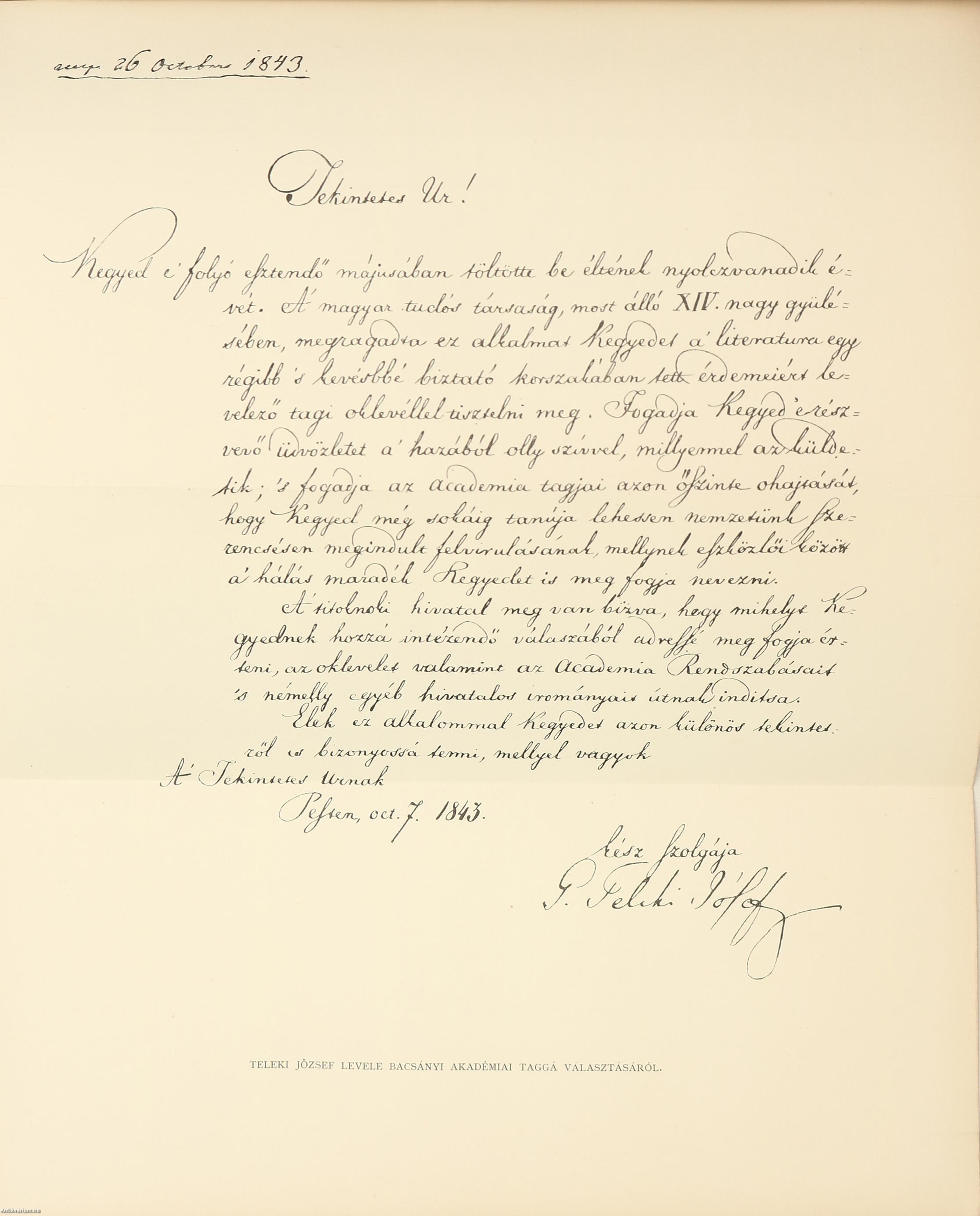 Gróf Teleki József tudósító levele Bacsányi akad. taggá választásáról 136