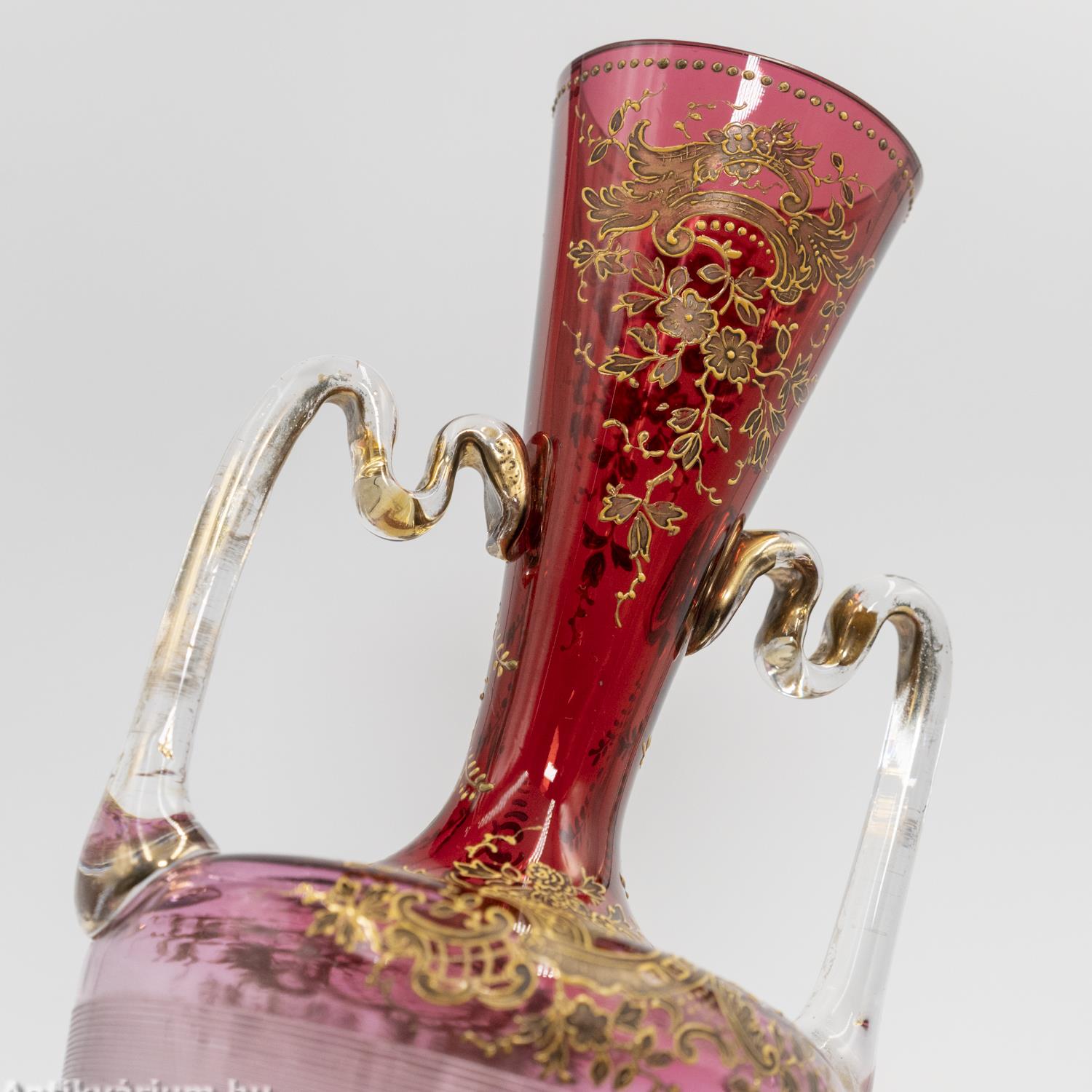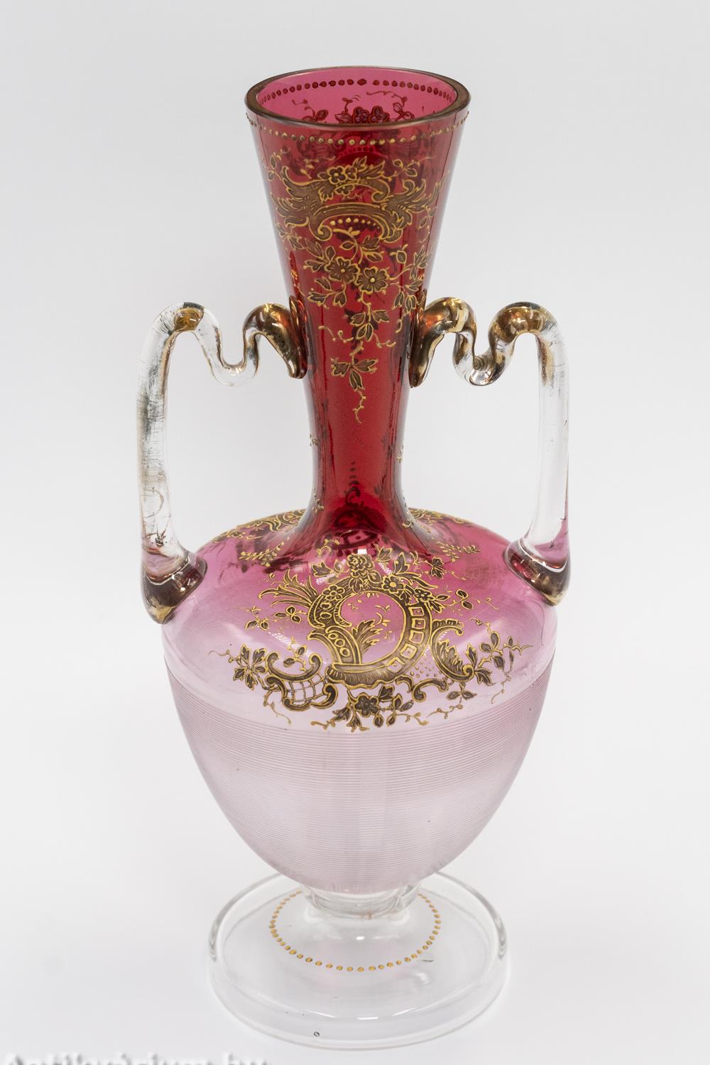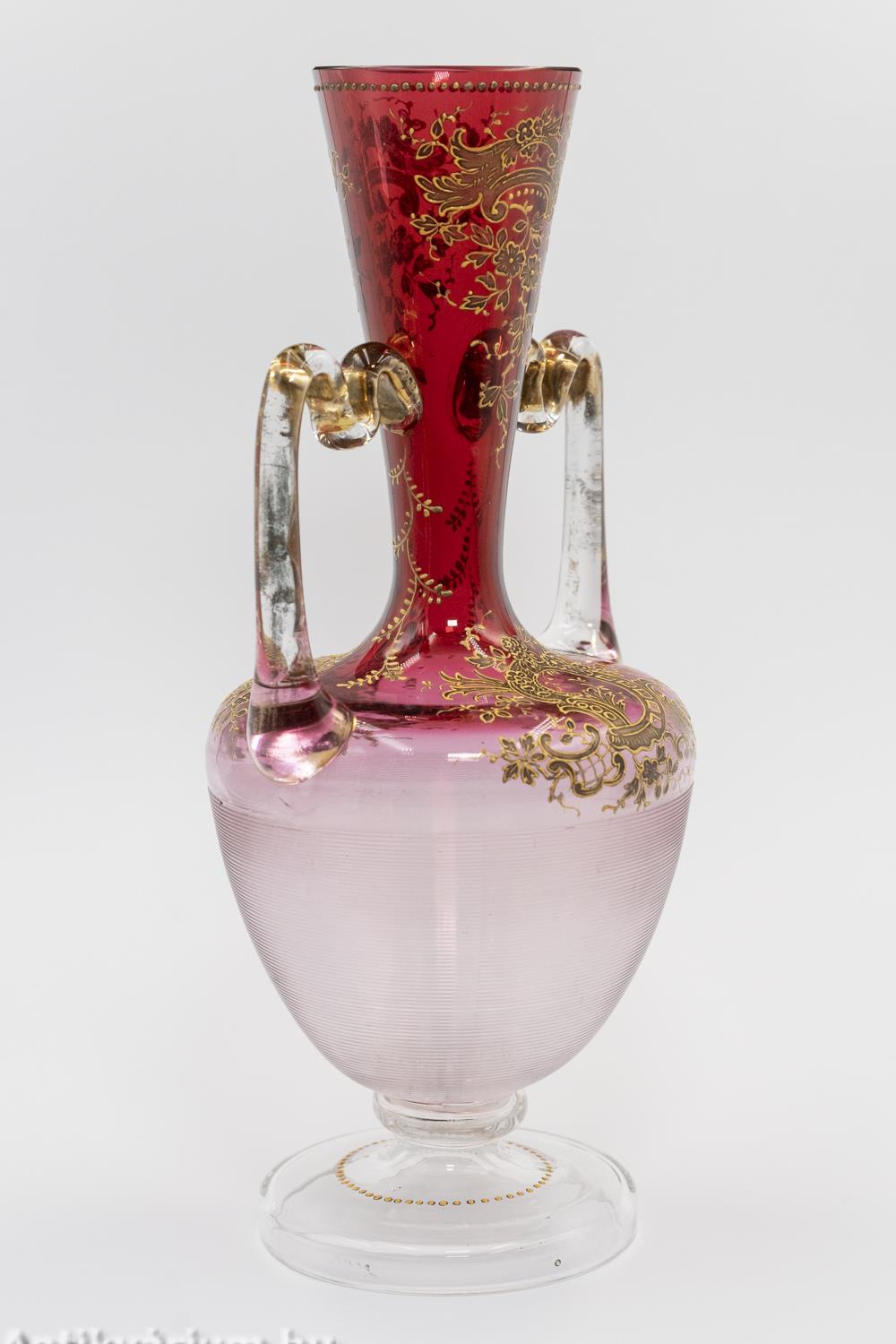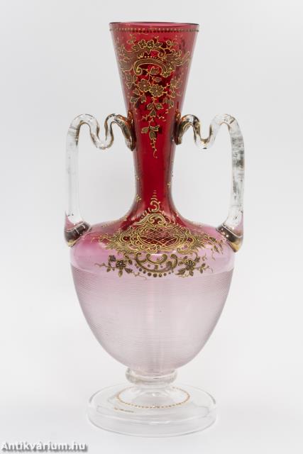 Hibátlan állapotú, fújt és kézzel formázott Moser szecessziós festett üveg váza a 19. század végéről. Színátmenetes üvegrétege a halvány rózsaszín színből finom fokozatossággal vált mély rubinvörös színre. Hibátlan arannyal festett virág és indaszerűen felfutó levél ornamentikával díszített, amelyet színes, a korra jellemző virág formájú kézzel készített zománcfestés tesz még egyedibbé. Amfora alakjára jellemzően kétoldali fogó fül díszíti, amely dupla hullámmintával kapcsolódik az üveg váza elvékonyodó nyakrészéhez. Az üveg váza testét különleges, teljesen egyenletes körkörös, sűrű sávcsiszolások borítják. Átlátszó üvegből készült üreges talprészét körkörös kézi aranyfestés díszíti. Kifinomult ízléssel és igényességgel megalkotott művészi üveg váza.