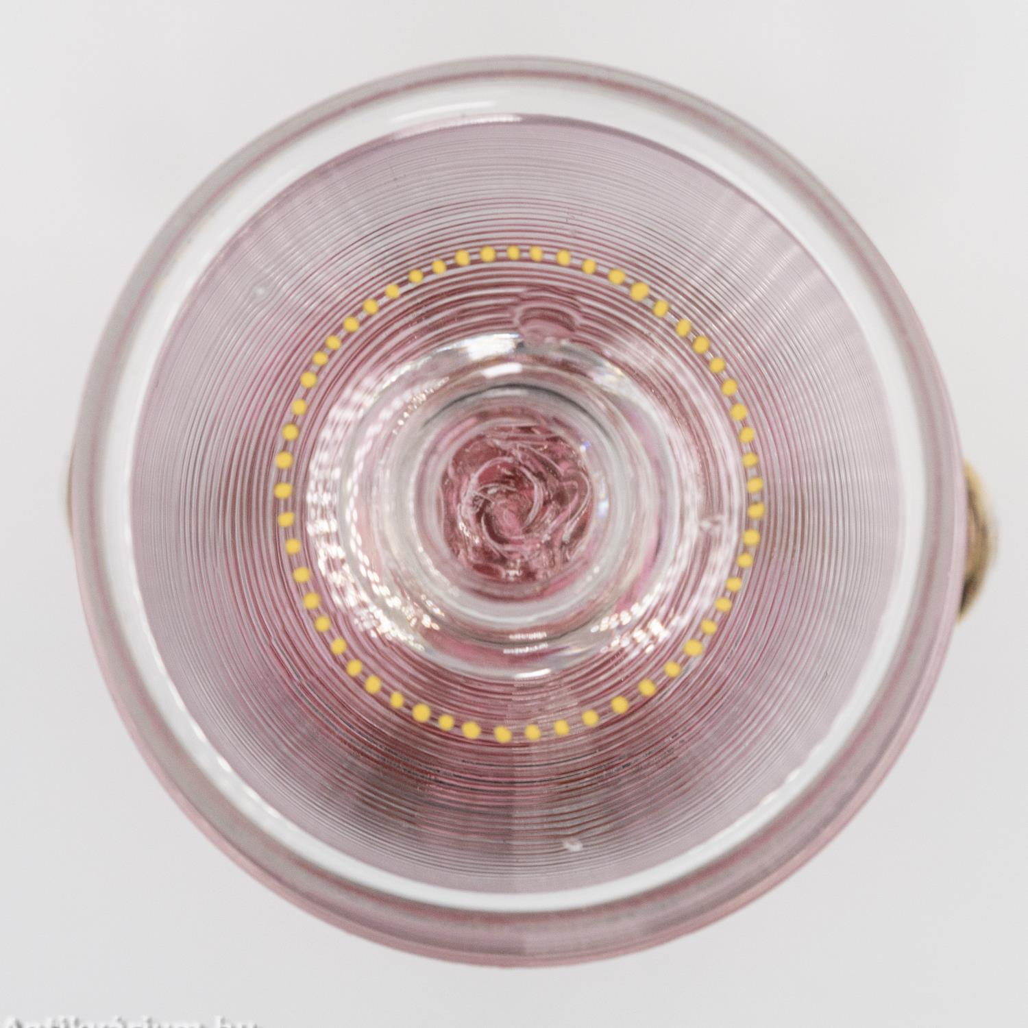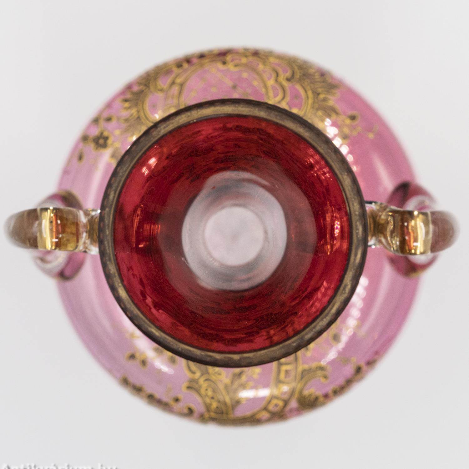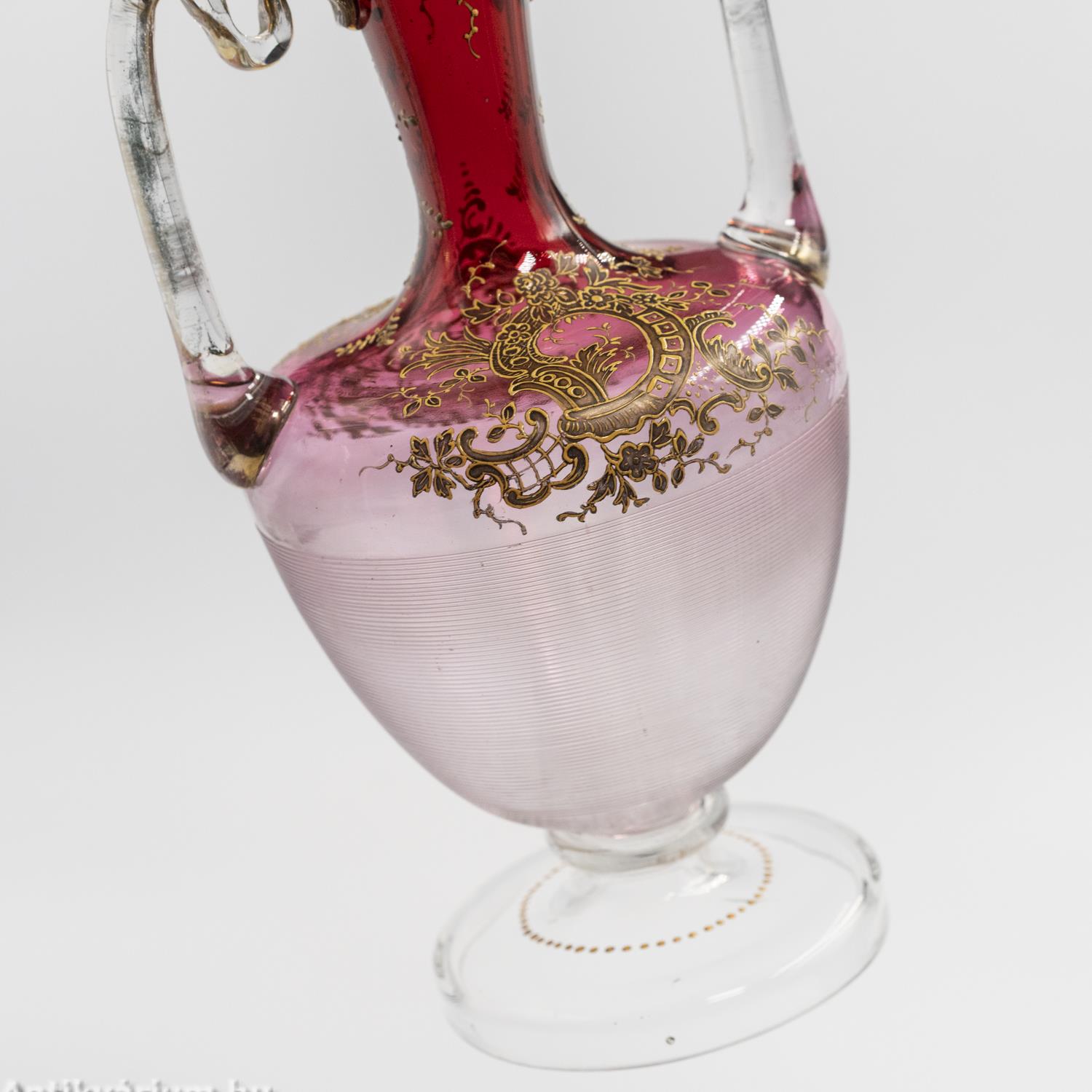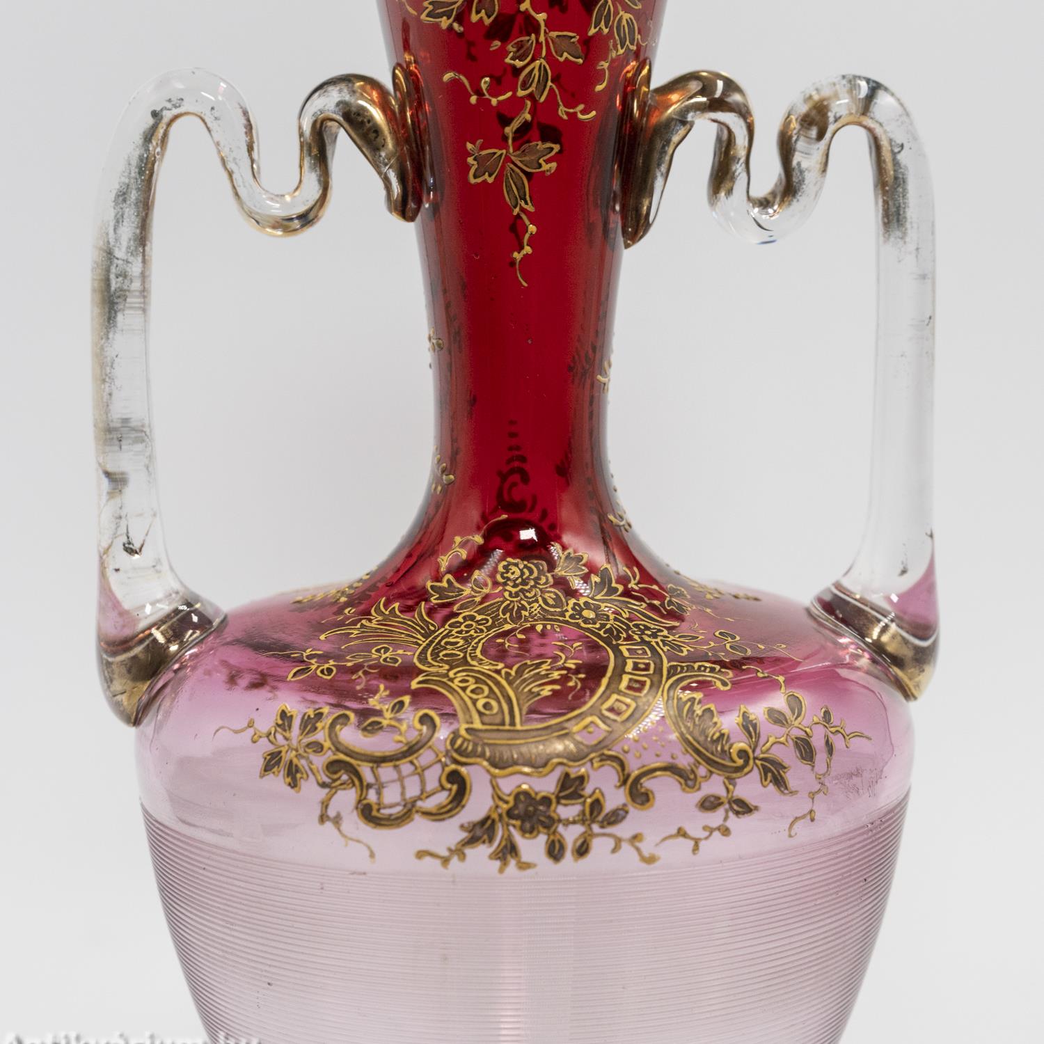 Hibátlan állapotú, fújt és kézzel formázott Moser szecessziós festett üveg váza a 19. század végéről. Színátmenetes üvegrétege a halvány rózsaszín színből finom fokozatossággal vált mély rubinvörös színre. Hibátlan arannyal festett virág és indaszerűen felfutó levél ornamentikával díszített, amelyet színes, a korra jellemző virág formájú kézzel készített zománcfestés tesz még egyedibbé. Amfora alakjára jellemzően kétoldali fogó fül díszíti, amely dupla hullámmintával kapcsolódik az üveg váza elvékonyodó nyakrészéhez. Az üveg váza testét különleges, teljesen egyenletes körkörös, sűrű sávcsiszolások borítják. Átlátszó üvegből készült üreges talprészét körkörös kézi aranyfestés díszíti. Kifinomult ízléssel és igényességgel megalkotott művészi üveg váza.