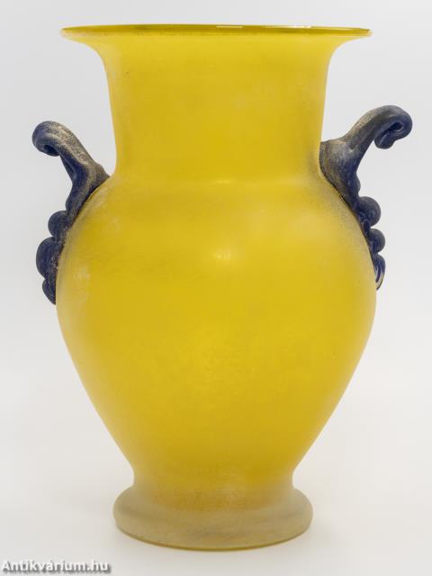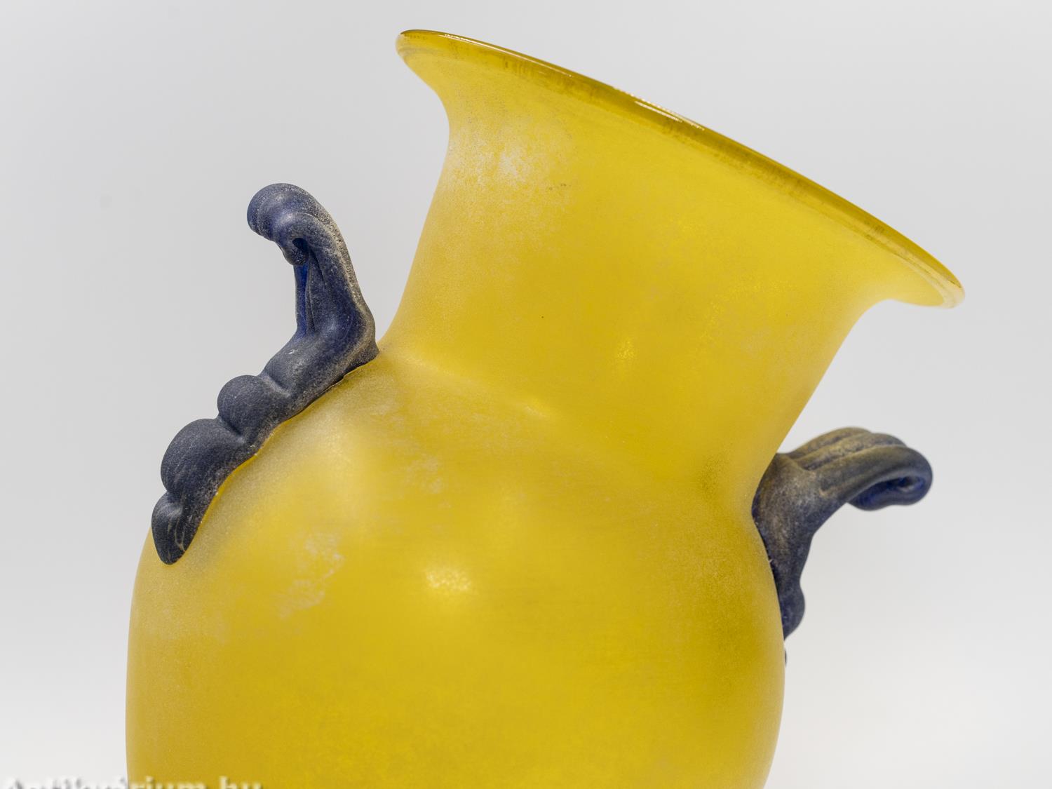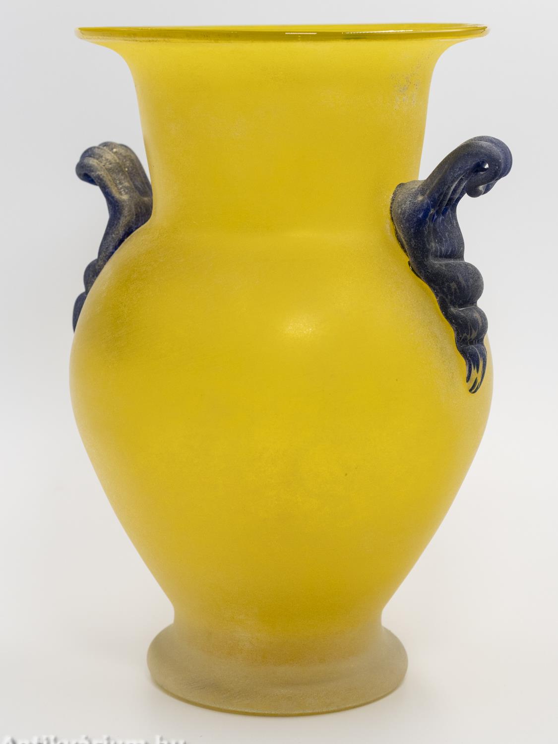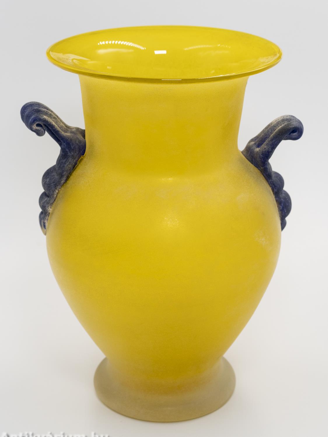 Hibátlan állapotú, a régi római üvegek hangulatát idéző, Seguso Vetri d'Arte Murano, fújt és kézzel formázott, matt, maratott Scavo (korróziós technika) sárga üveg váza. A scavo-bevonat a régészeti maradványok feltárására hivatott hasonlítani: a durva tapintású üvegfelület a forró üvegen szórt sók és oxidálószerek felvitelének eredménye. Élénk sárga színét kontrasztosan emeli ki a mindkét oldalát díszítő, szintén scavo felületű kék színű, tajtékzó hullámmintát formázó két fogó fül. Készítésének ideje a 20. század második fele.