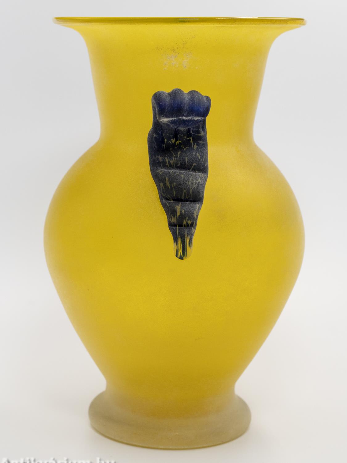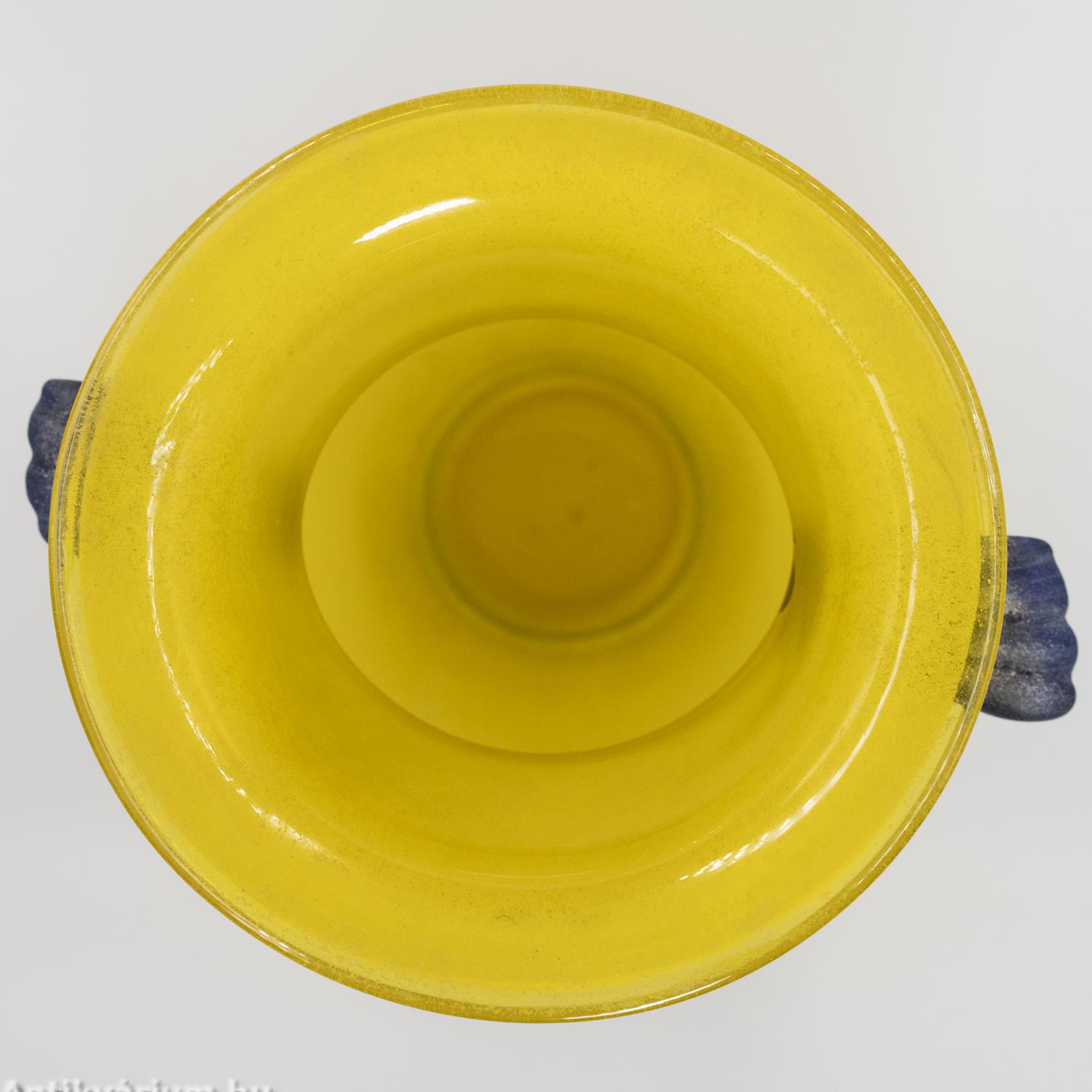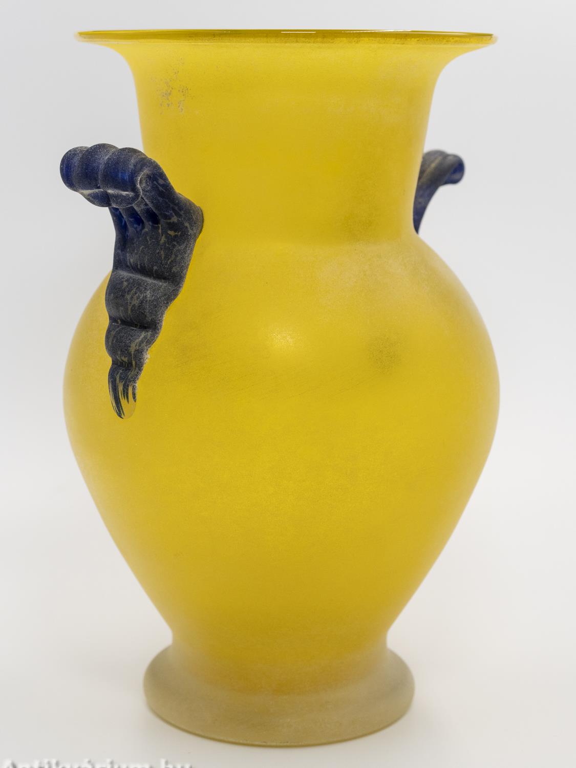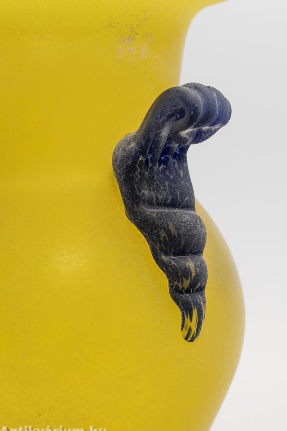 Hibátlan állapotú, a régi római üvegek hangulatát idéző, Seguso Vetri d'Arte Murano, fújt és kézzel formázott, matt, maratott Scavo (korróziós technika) sárga üveg váza. A scavo-bevonat a régészeti maradványok feltárására hivatott hasonlítani: a durva tapintású üvegfelület a forró üvegen szórt sók és oxidálószerek felvitelének eredménye. Élénk sárga színét kontrasztosan emeli ki a mindkét oldalát díszítő, szintén scavo felületű kék színű, tajtékzó hullámmintát formázó két fogó fül. Készítésének ideje a 20. század második fele.