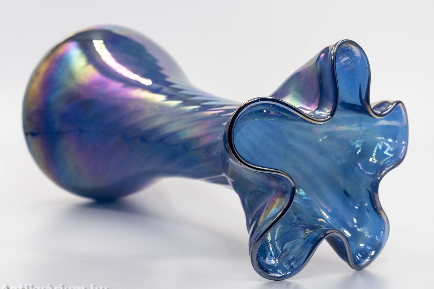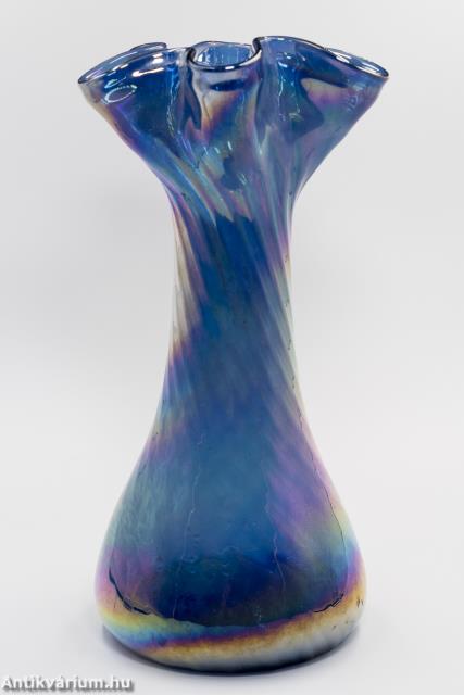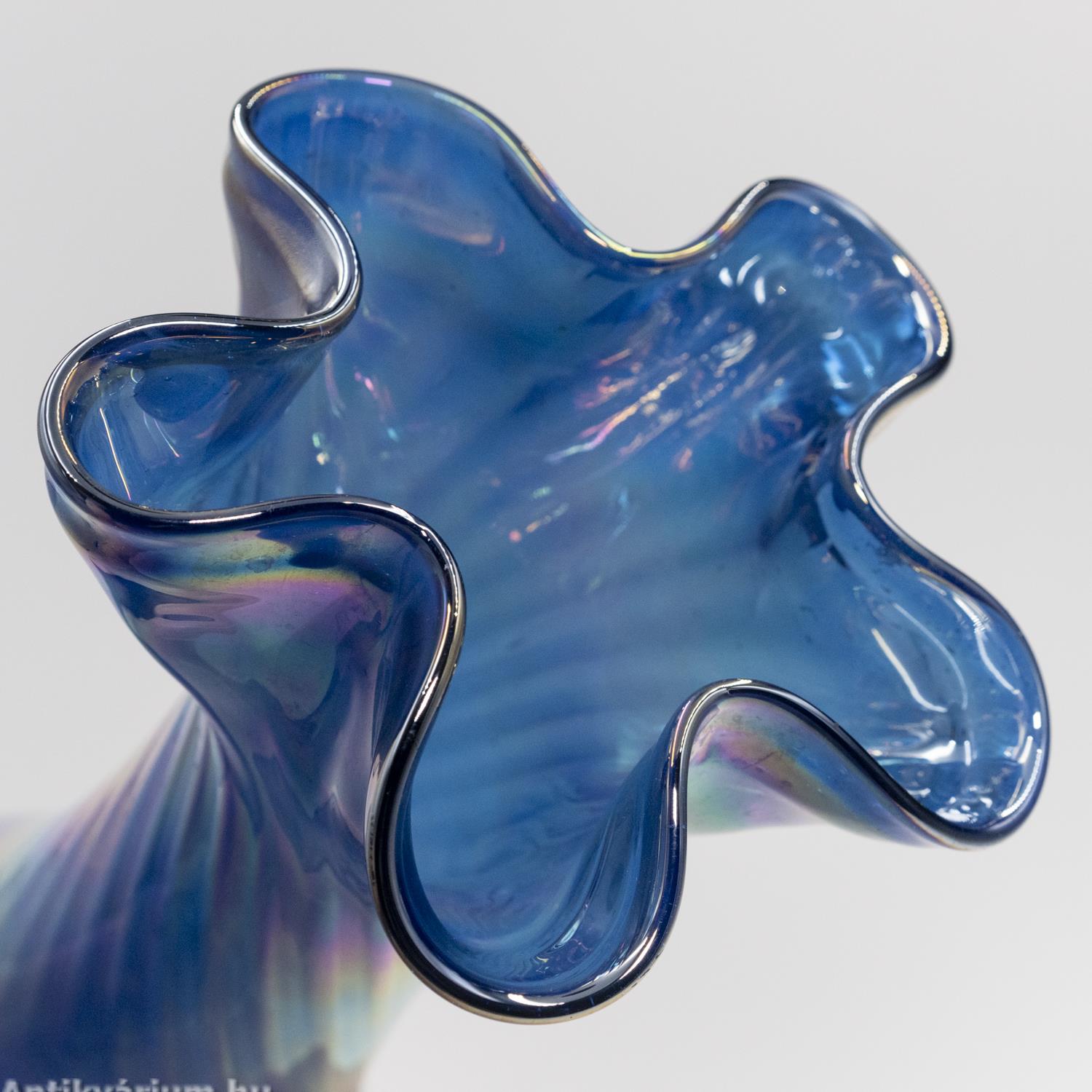 Hibátlan állapotú, fújt és kézzel formázott irizált felületű kék Murano üveg váza a 20. század második feléből. A hullámos peremű nagy méretű üveg vázát a szivárvány színeiben pompázó, csillogó irizált felület borítja. (Az irizálás - a görög „szivárvány” szóból - kerámia- és üvegtárgyak színjátszó, fémes fénye.) A finoman bordázott, csavart formájú mintázat kiemeli a hagyományos kézzel fújt készítési folyamat természetét, így minden ilyen darab egyedi. Talpán a fújás helye valamint a valamikori papíretikett maradványai láthatóak. Minden részletében dinamizmust sugárzó élénk színű művészi üveg váza szivárványos ragyogásban.