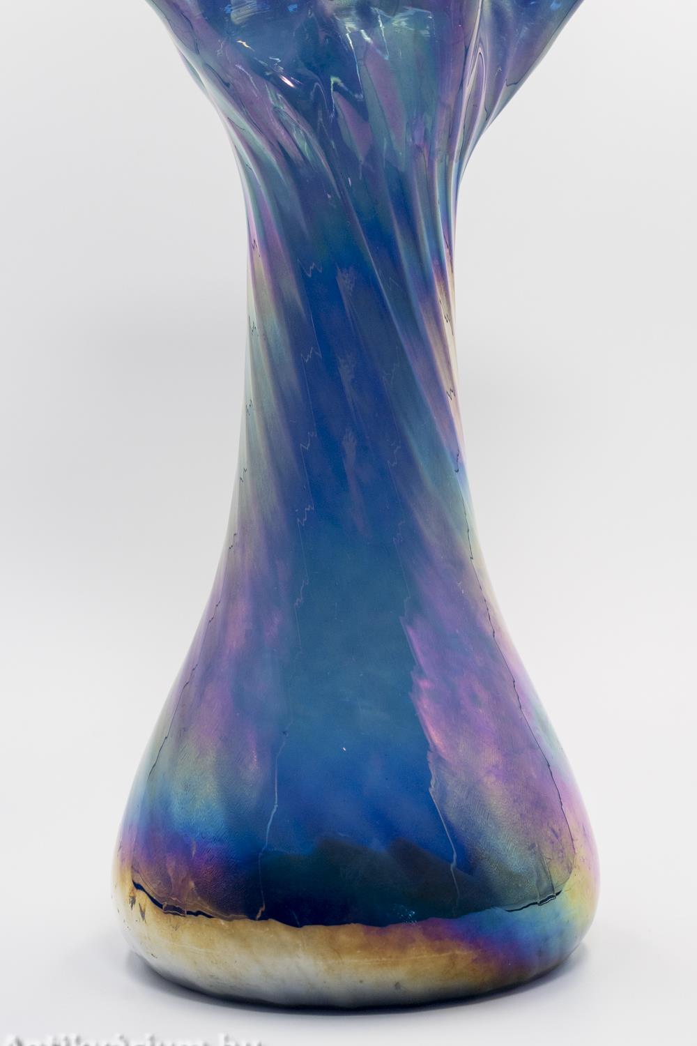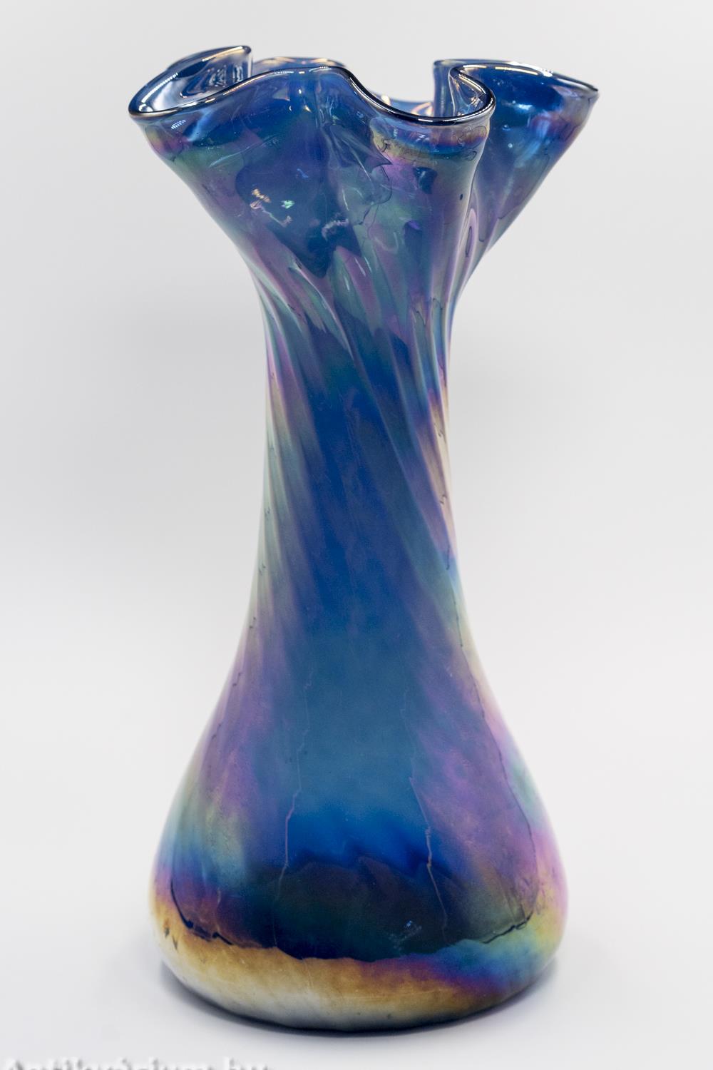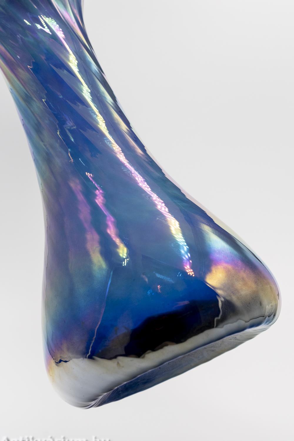 Hibátlan állapotú, fújt és kézzel formázott irizált felületű kék Murano üveg váza a 20. század második feléből. A hullámos peremű nagy méretű üveg vázát a szivárvány színeiben pompázó, csillogó irizált felület borítja. (Az irizálás - a görög „szivárvány” szóból - kerámia- és üvegtárgyak színjátszó, fémes fénye.) A finoman bordázott, csavart formájú mintázat kiemeli a hagyományos kézzel fújt készítési folyamat természetét, így minden ilyen darab egyedi. Talpán a fújás helye valamint a valamikori papíretikett maradványai láthatóak. Minden részletében dinamizmust sugárzó élénk színű művészi üveg váza szivárványos ragyogásban.