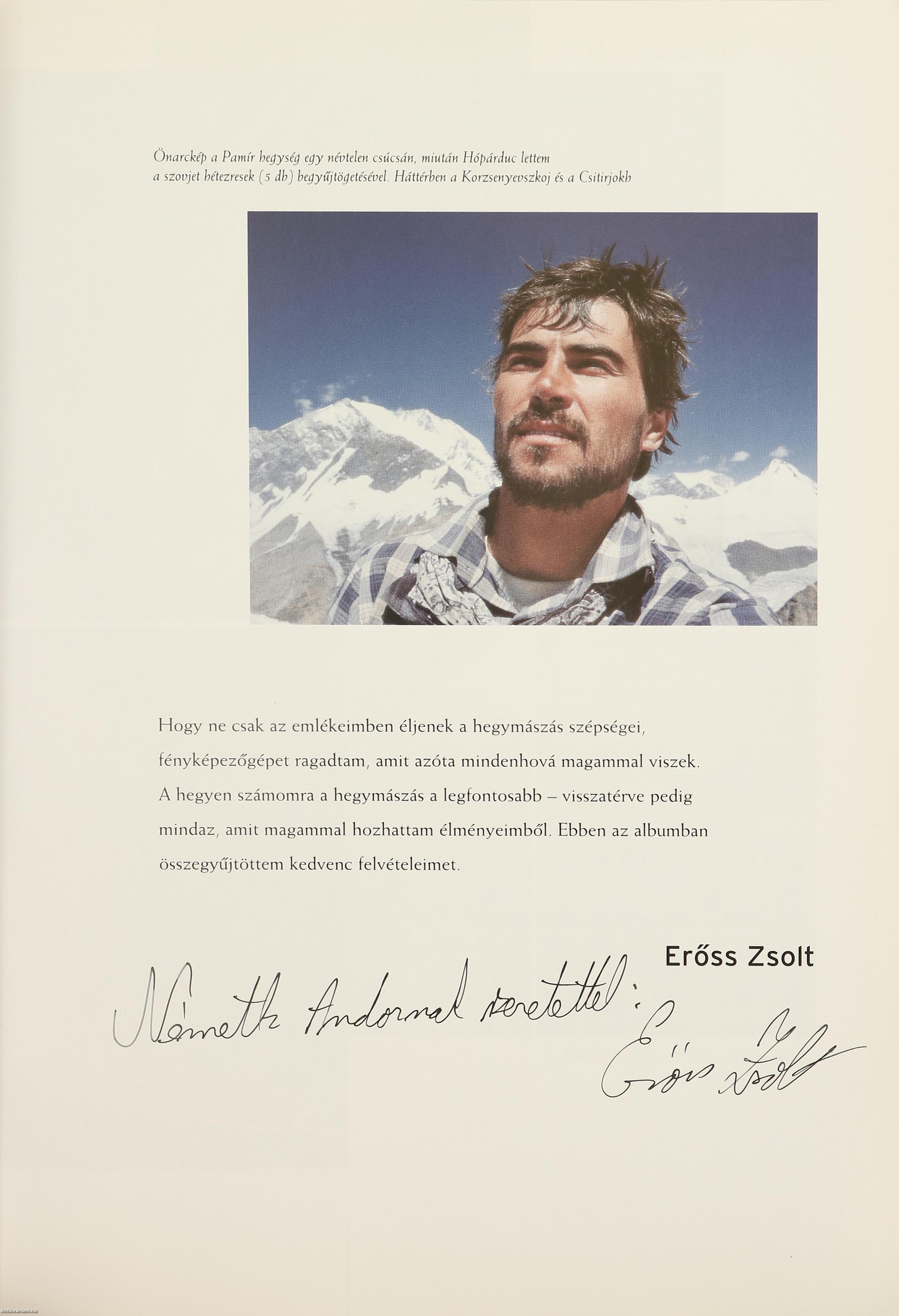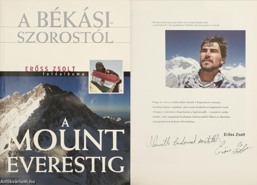 Erőss Zsolt által dedikált példány.Első kiadás. A Békási-szorostól a Mount Everestig. Erőss Zsolt fotóalbuma. Szerkesztette: Rados Richárd. A bemutatkozó oldalon, Erőss Zsolt hegymászó tollal beírt, névre szóló dedikációja olvasható: "N. A-nak szeretettel: Erőss Zsolt". Szövegközti, színes fotókkal és az album végén térképvázlatokkal illusztrált kiadás. Nyomtatta a Kaposvári Nyomda Kft. Kiadói varrott papírkötésben lévő példány feliratozott, színes illusztrációval ellátott címfedéllel, feliratos könyvgerinccel, tiszta belívekkel, feliratozott, színes fotókkal ellátott hátlappal, hiánytalan, megkímélt, jó állapotban. A fotóalbumot készítette és dedikálta, Erőss Zsolt (1968-2013) erdélyi születésű, tragikus sorsú, magyar hegymászó, aki első magyarként mászta meg a Föld legmagasabb hegyét, a híres Csomolungmát. A lenyűgözően izgalmas fotóalbuma dokumentuma egy a hegymászás iránt elkötelezett, kitartó, megszállott hegymászó grandiózus, nem mindennapi küzdelmének.