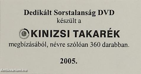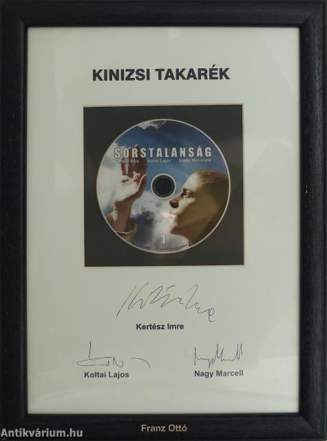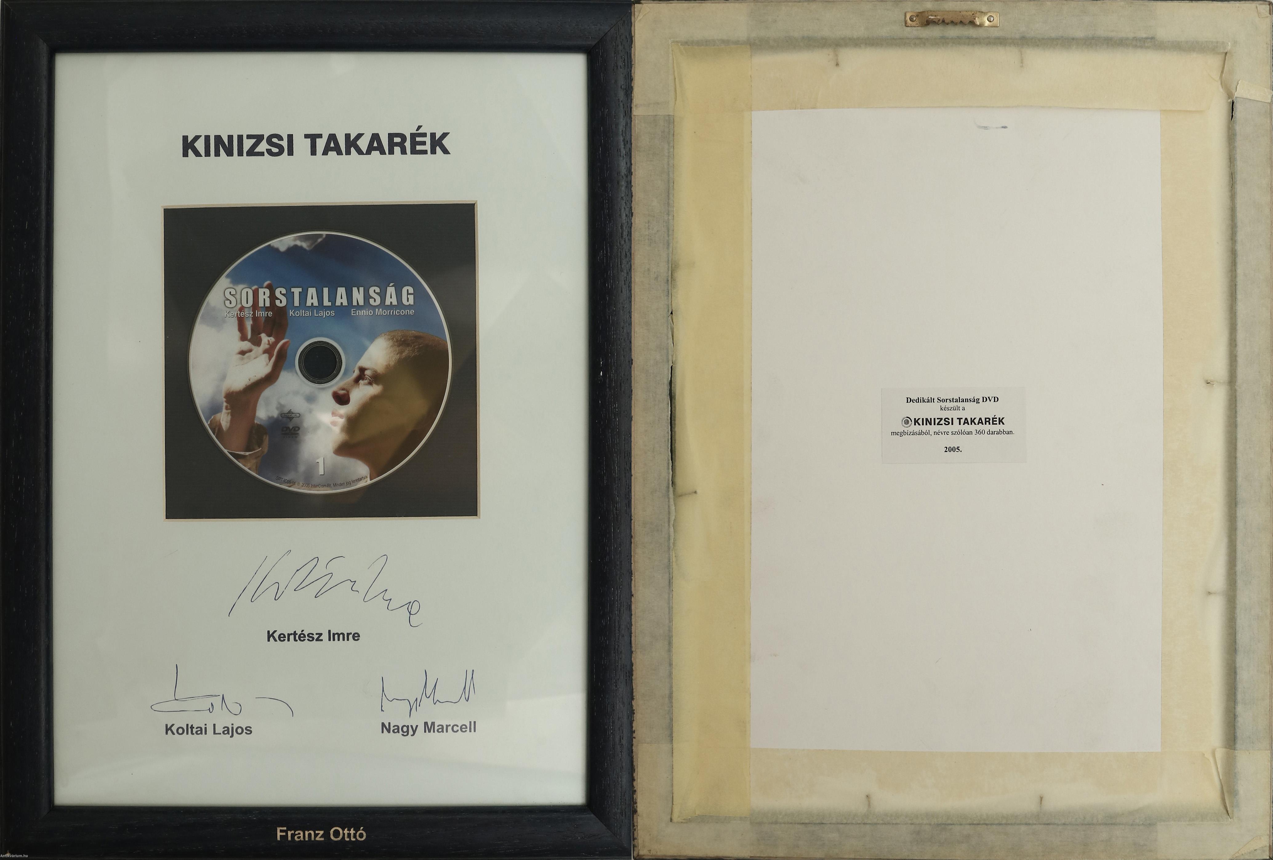 A tétel tartalmazza Kertész Imre Nobel-, József Attila- és Kossuth-díjas író, műfordító; Koltai Lajos, a Nemzet Művésze címmel kitüntetett, Kossuth- és Balázs Béla-díjas operatőr, rendező, érdemes művész, az Oscar-díjas Mephisto (1981) operatőre; illetve Nagy Marcell színész, operatőr, fotográfus tollal írt aláírását, valamint a Sorstalanság c. film DVD-jét.
