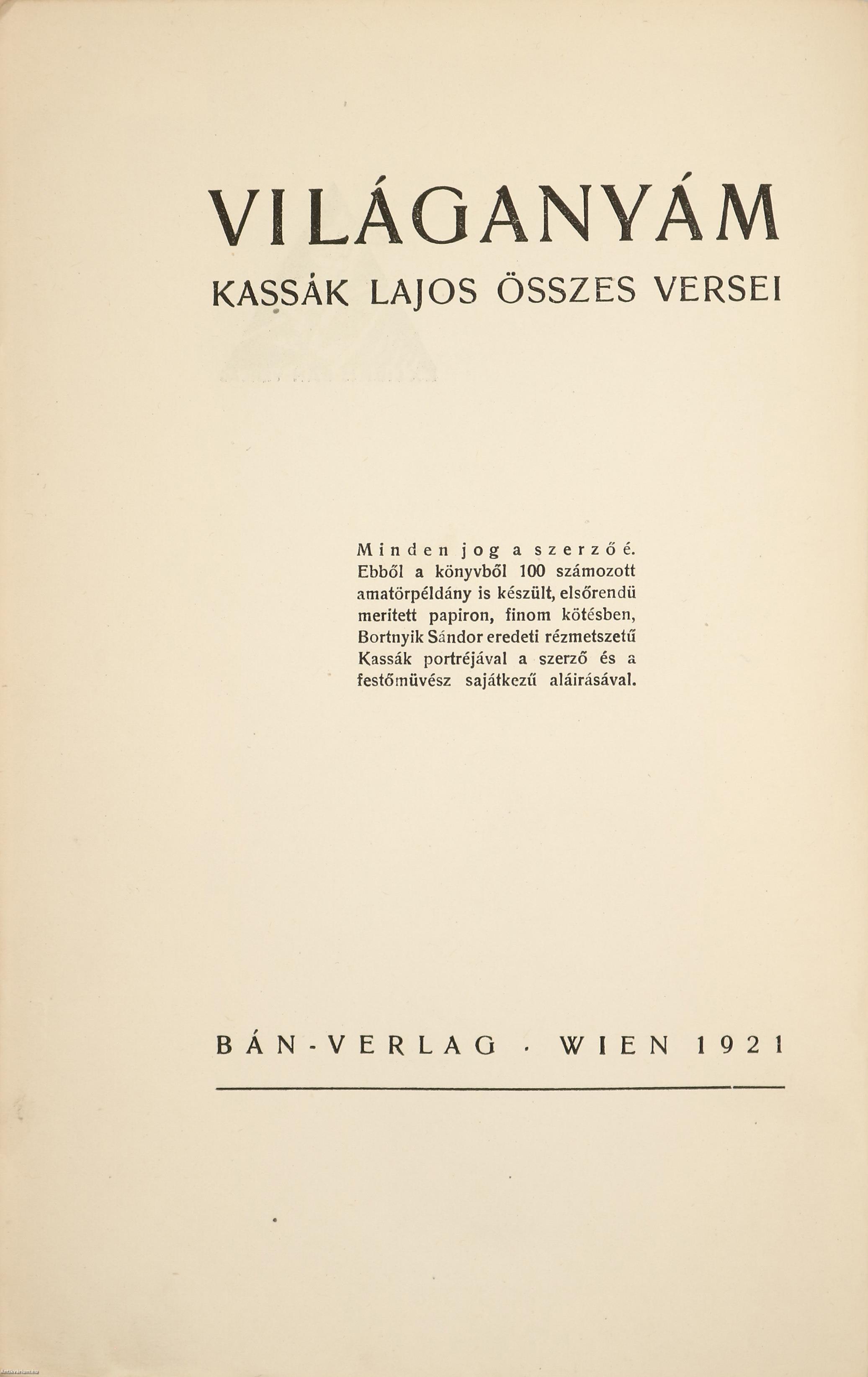 Első, emigrációs kiadás. Világanyám. Írta: Kassák Lajos. A fedőlapot Botnyik Sándor rajzolta. Kiadta a Bán-Verlag, Bécsben. A m. kir. kereskedelemügyi miniszter 1922-ben a könyvtől a postai szállítás jogát megvonta. Kiadói varrott papírkötésben lévő példány, két színnel feliratozott címfedéllel, feliratos könyvgerinccel, körbevágatlan belívekkel, feliratozott hátlappal, hiánytalan állapotban. "...„Világanyám“ című kötet, amelyben összegyűjtve először jelennek meg 1915-1921. években irt és szétszórtan napvilágot látott versek. Kétségtelen, hogy Kassák elsősorban is költő, tehetsége legerőteljesebben verseiben nyilatkozik meg. Nemcsak mint olvasmány, hanem mint irodalomtörténeti dokumentum is roppant érdekes ez a kötet, amely Kassák egész fejlődését a legszembetűnőbben mutatja be..." - (Kassai Ujság, 1922. január 18./84. évfolyam/14. szám). A kötet szerzője, Kassák Lajos (Érsekújvár, 1887. március 21. – Budapest, 1967. július 22.) Kossuth-díjas író, költő, műfordító, képzőművész, a hazai avantgárd művészet egyik első képviselője, avantgárd szellemiségű folyóiratok szerkesztője (Tett, Ma). A Tanácsköztársaság alatt az Írói Direktórium tagja, később az SZDP Művészeti Bizottságának elnöke, 1948 januárjától országgyűlési képviselő. Kassák nyitott, demokratikus művészeteszményének megfelelően egy nemzetközi költői nyelv kialakítására törekedett, amit több művészeti irányból közelített meg (expresszionizmus, futurizmus, dadaizmus, szürrealizmus, konstruktivizmus). Sokszínű életműve alapjaiban határozta meg a magyar avantgárd mozgalmat és annak történetét.