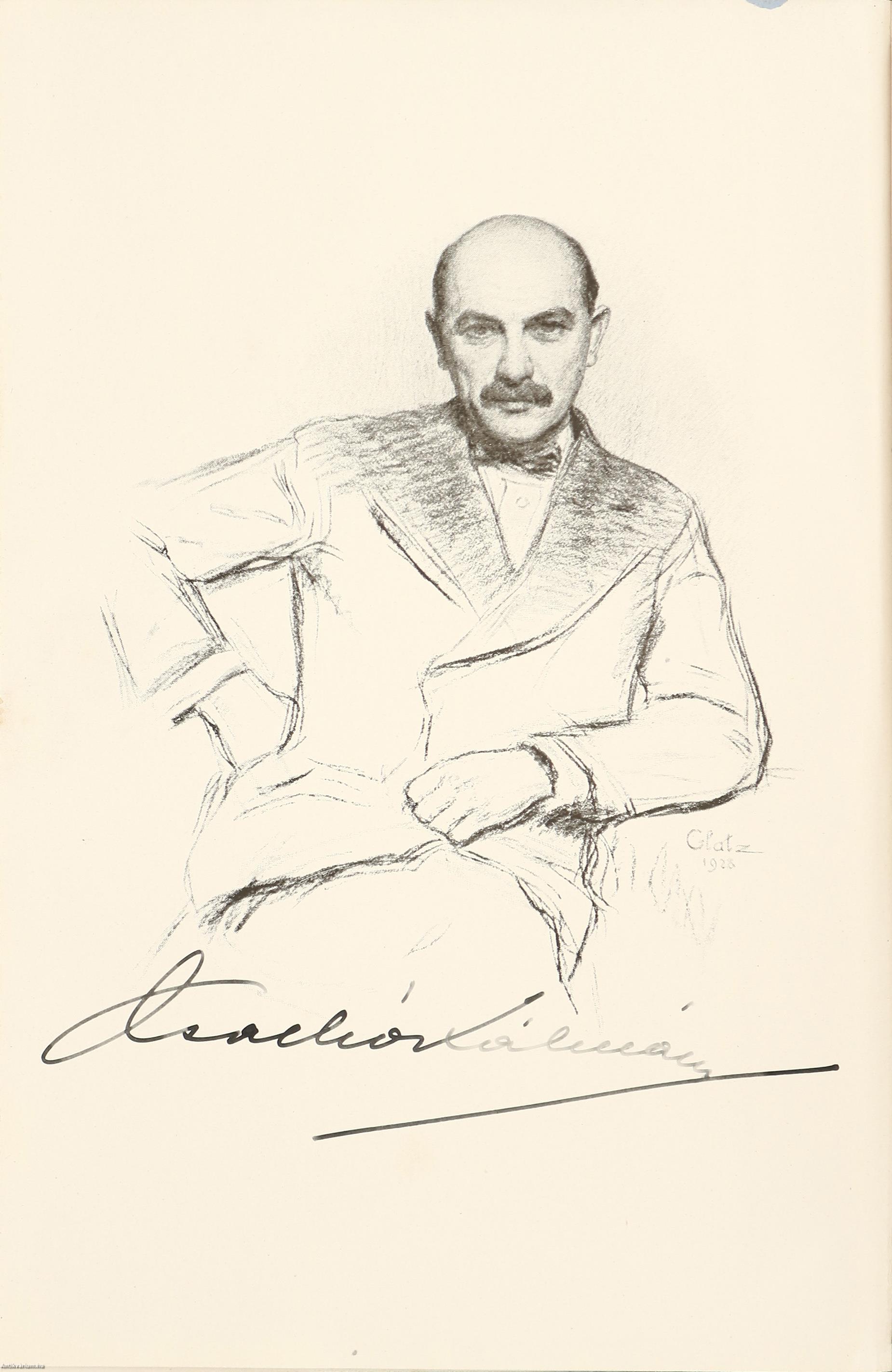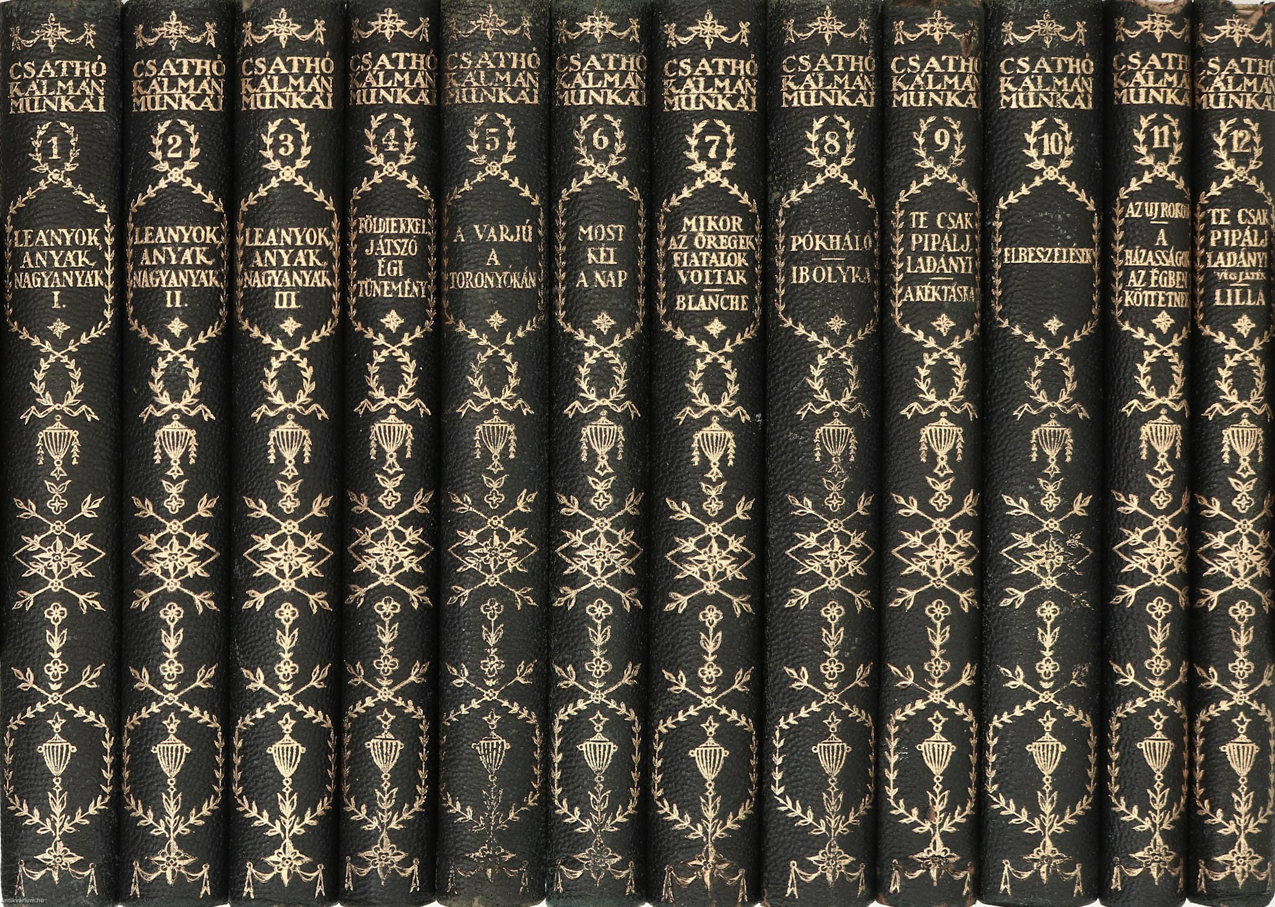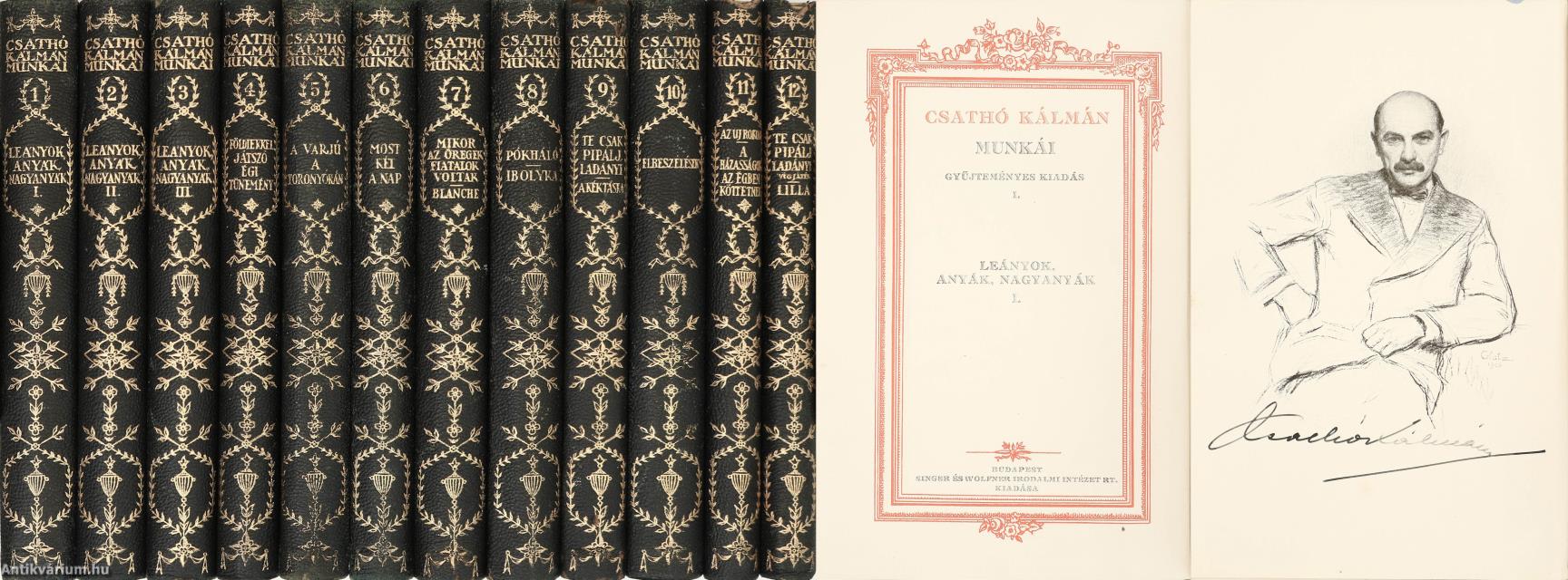 Szerző által aláírt példány. Csathó Kálmán Munkái I-XII. (különálló félbőr sorozatkötésben lévő kötetek) (teljes sorozat). Írta: Csathó Kálmán. Az első kötet címlapkép oldalán a szerző fekete-fehér portréja (Glatz/1928) alatt a szerző, Csathó Kálmán tollal beírt, jól olvasható aláírása látható. Gyűjteményes második kiadás.