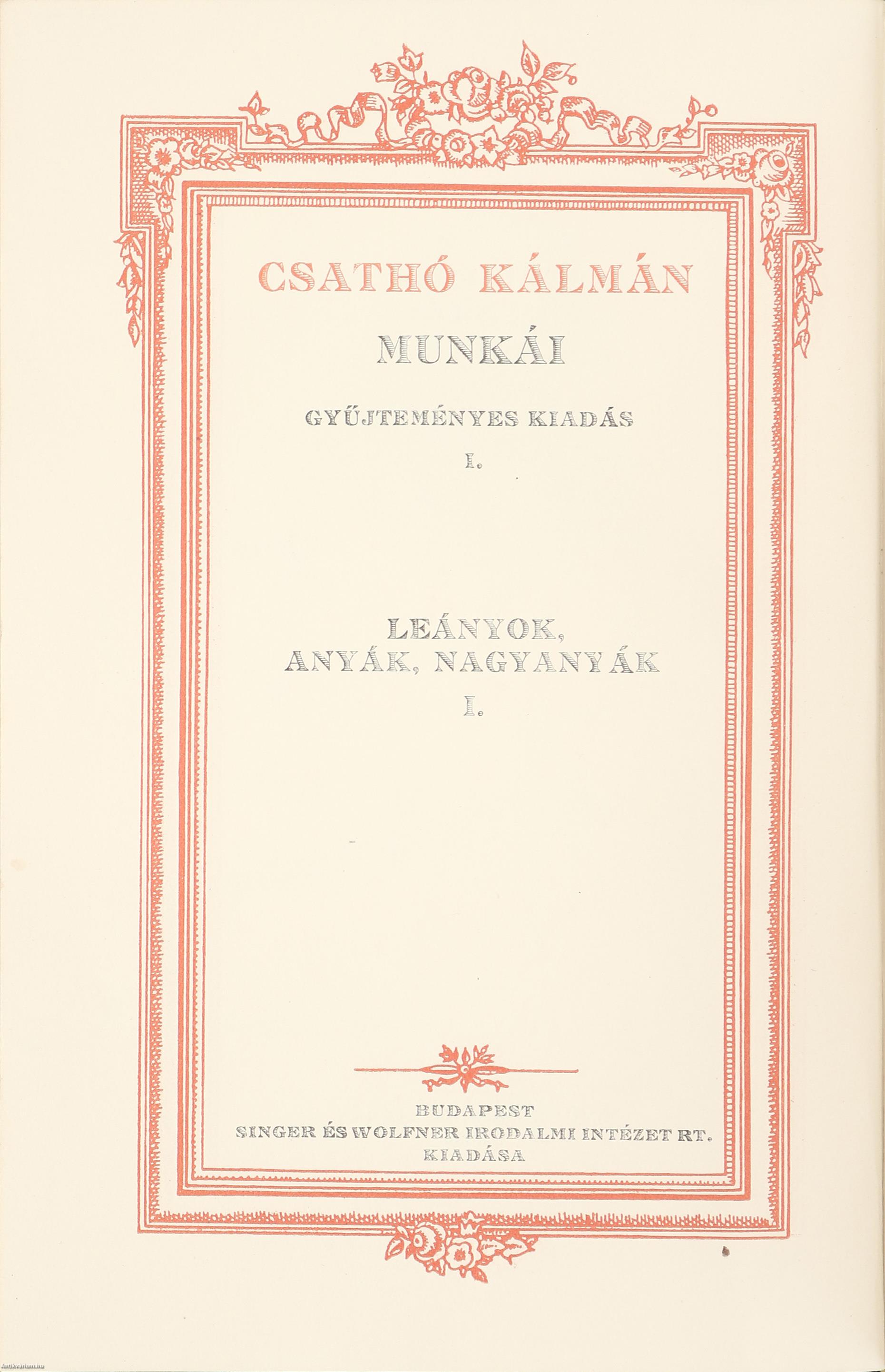 I. kötet: Leányok, anyák, nagyanyák I. Leányok. Regénysorozat. Bp. 1928. 371 p. + [1] t.: ill. II. kötet: Leányok, anyák, nagyanyák II. Asszony a bakon. Regénysorozat. Bp. 1928. 319 p. III. kötet: Leányok, anyák, nagyanyák III. Mindhalálig. Regénysorozat. Bp. 1928. 326 p. IV. kötet: Földiekkel játszó égi tünemény. Regény. Bp. 1928. 284 p. V. kötet: A varjú a toronyórán. Regény. Az egyik lap vágáshibás (135-136. p.). Bp. 1928. 310 p. VI. kötet: Most kél a nap. Regény. Bp. 1928. 284 p. VII. kötet: Mikor az öregek fiatalok voltak. Regény. / Blanche avagy a szegény rokon. Családi történet. Bp. 1928. 228 p., 107 p. VIII. kötet: Pókháló. Regény. / Ibolyka. Egy pesti kisleány kalandjai. Bp. 1928. 220 p., 110 p. + [2] p. IX. kötet: Te csak pipálj, Ladányi. Egy úri penzió története. / Kék táska. Regény. Bp. 1928. 121 p. + [3] p., 164 p. X. kötet: Juliska néni. Elbeszélések. / Miért nem ment hozzá nagymama nagypapához. Elbeszélések. Bp. 1928. 168 + [4] p., 185 p. + [2] p. XI. kötet: Az új rokon. Vígjáték. / A házasságok az égben köttetnek. Vígjáték. A kötet gerincének felső részén apróbb sérülés látható. Bp. 1928. 119 p. + [1] p., 118 p. XII. kötet: Te csak pipálj, Ladányi. Egy úri penzió története három felvonásban. / Lilla. Színjáték. Bp. 1928. 129 p. + [3] p., 122 p. + [1] p.